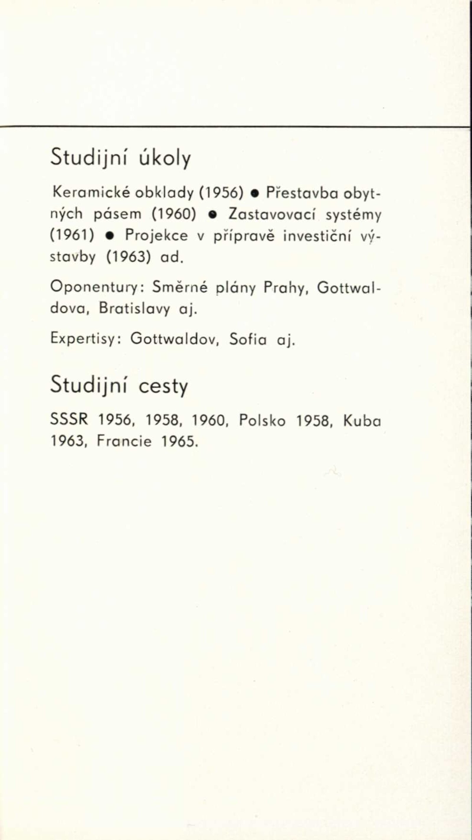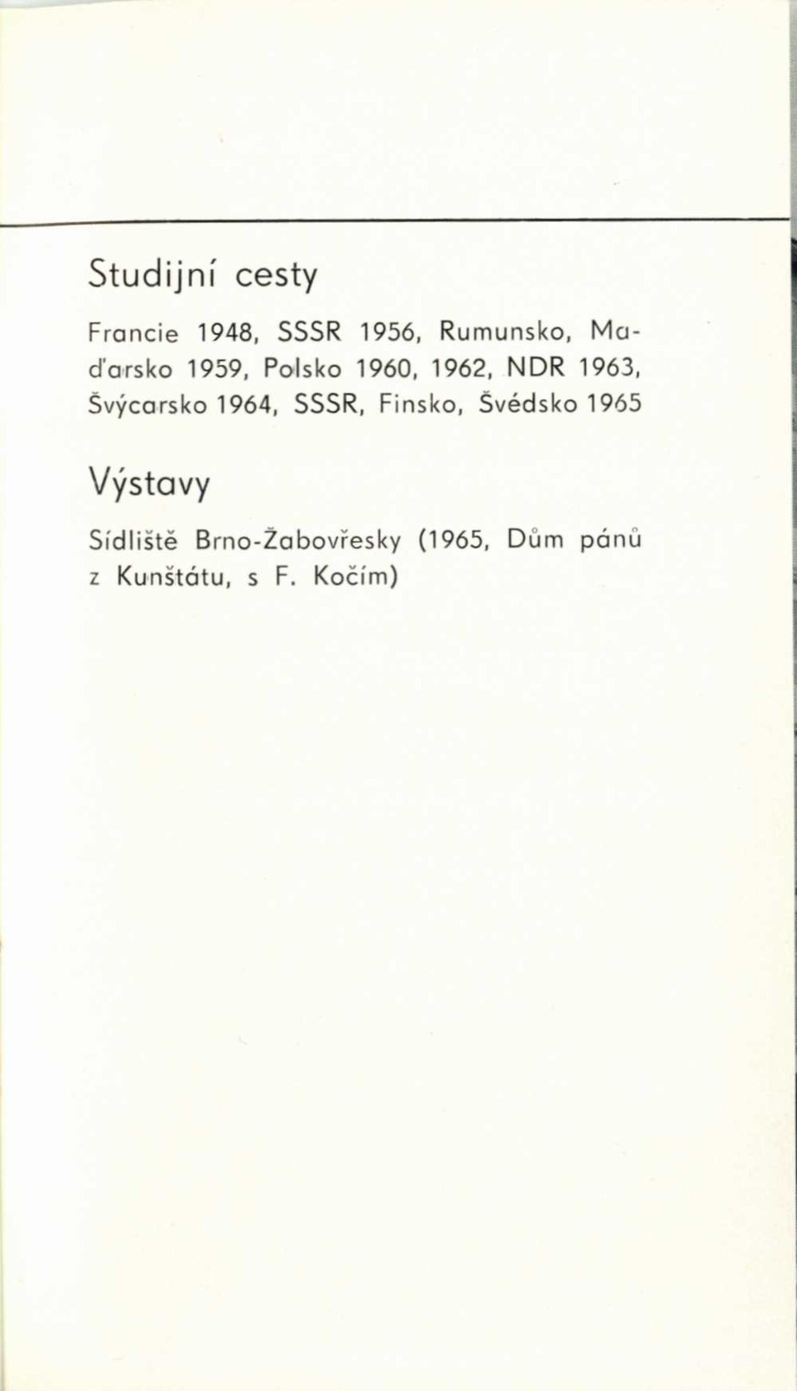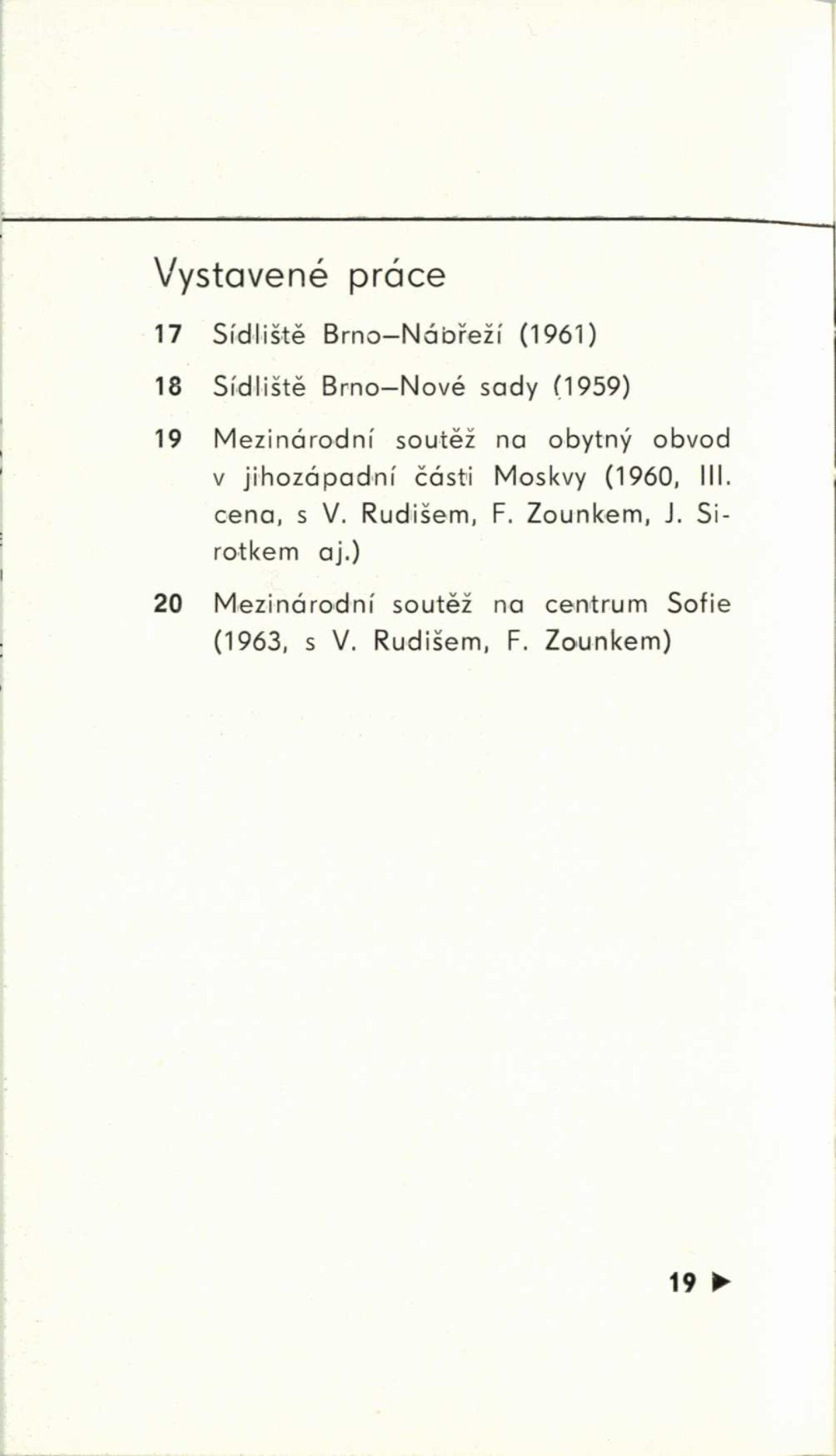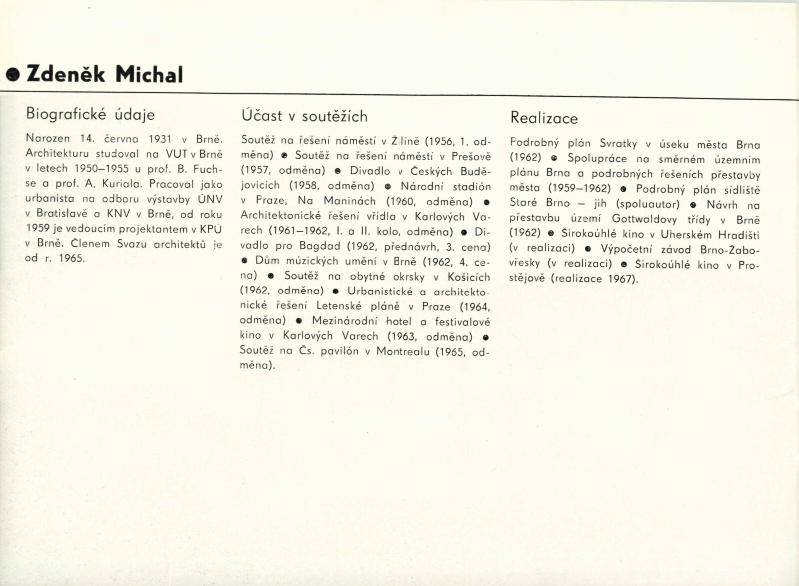 Profily brněnských architektů I: Dům umění města Brna / Dům pánů z Kunštátu, Kabinet architektury Svazu architektů ČSSR, 3. 12. 1965 – 12. 1. 1966 / Text: Iloš Crhonek. – Brno: Svaz architektů ČSSR, 1965. – 76 s., obr., životopisy, soutěže, realizace, studijní cesty + 4 s., obr., DPK 291. – MG; MMB