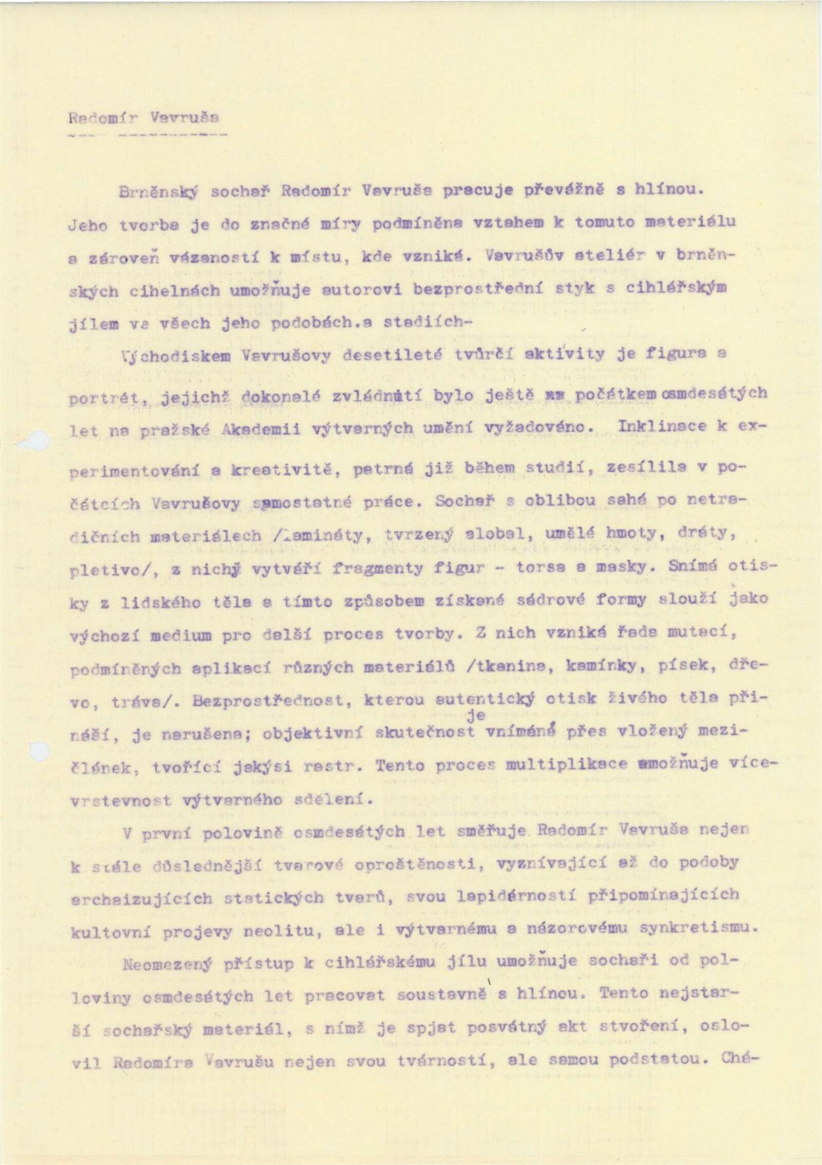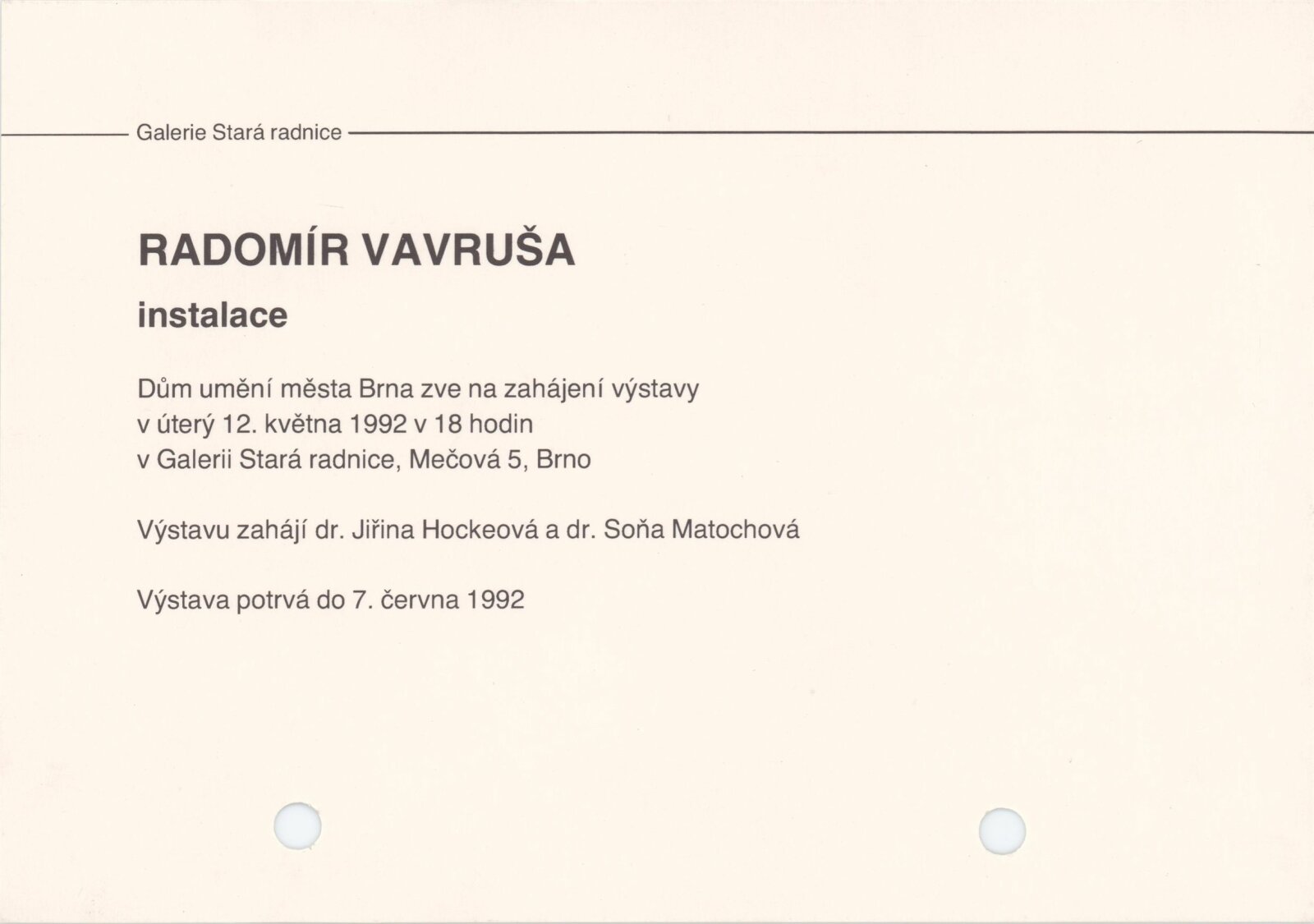 Radomír Vavruša. Instalace–art 92. Tělogos. Půda, targum, kresba: ... Galerie Stará radnice od 5.5. [spr. 12.] 5. – 7. 6. 1992 / Texty S. Matochová, autor. - Adamov: Galerie ADAST, - 48 s., obr. GSR 126