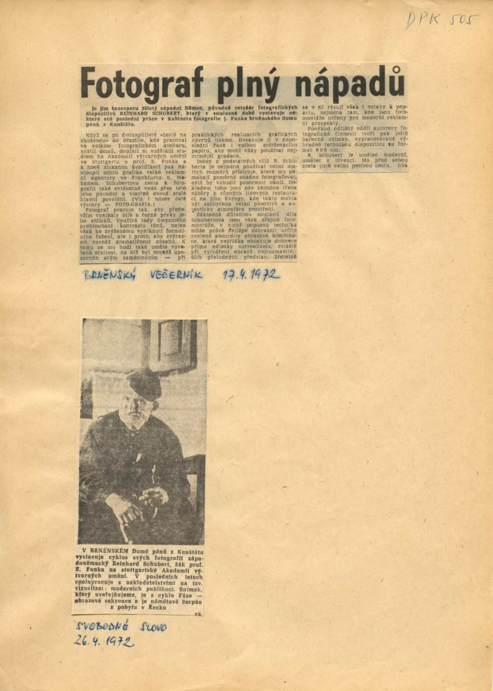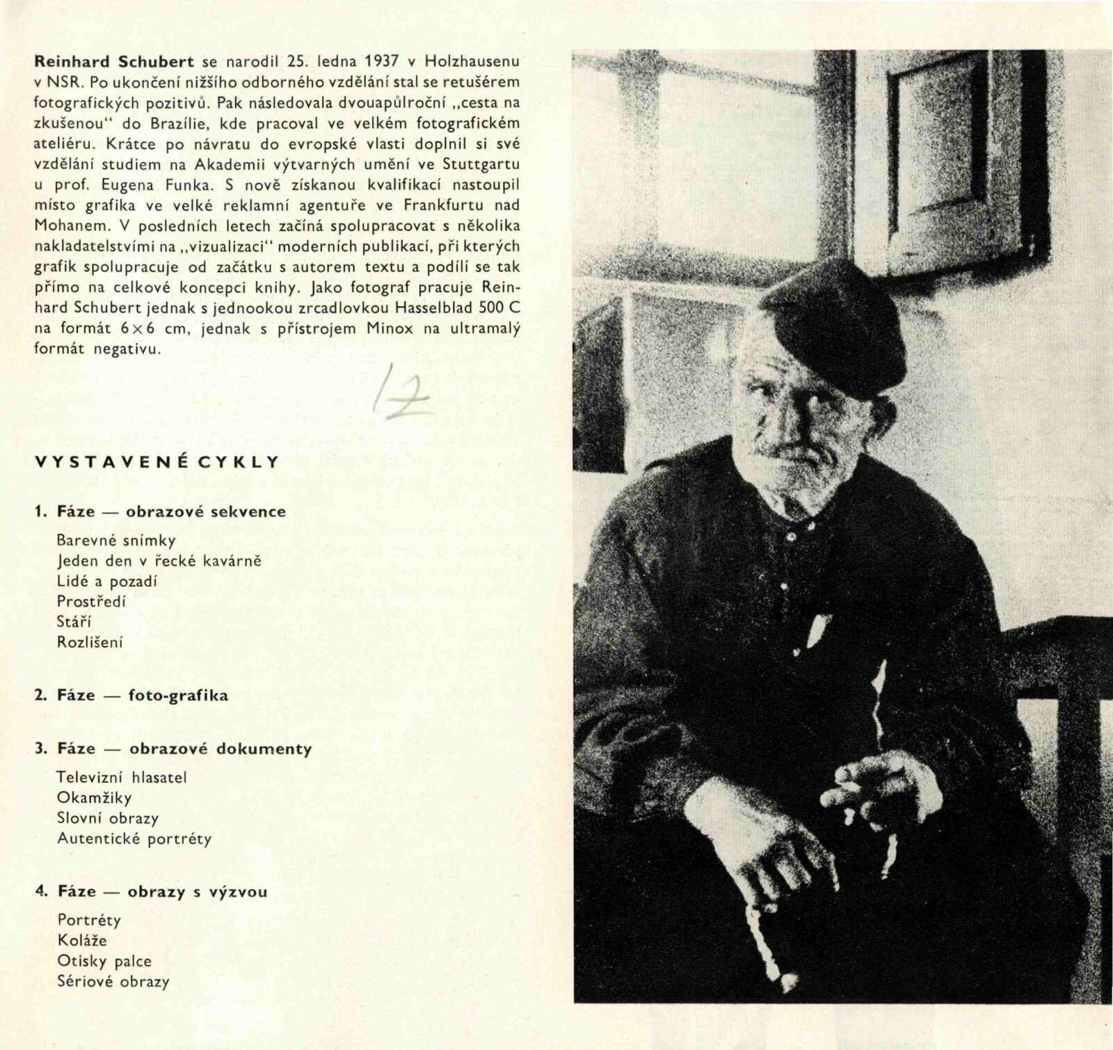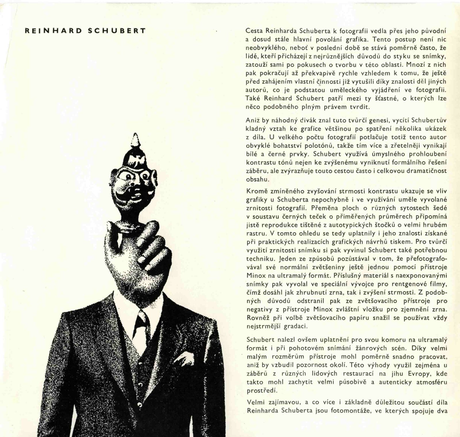 Reinhard Schubert. Foto grafika: Dům umění města Brna / Dům pánů z Kunštátu, Kabinet fotografie Jaromíra Funka, 7. 4. – 1. 5. 1972 / Text: Petr Tausk. – Brno: DUmB, 1972. – skládačka, 8 s., obr., životopis, DPK 505. – MZK