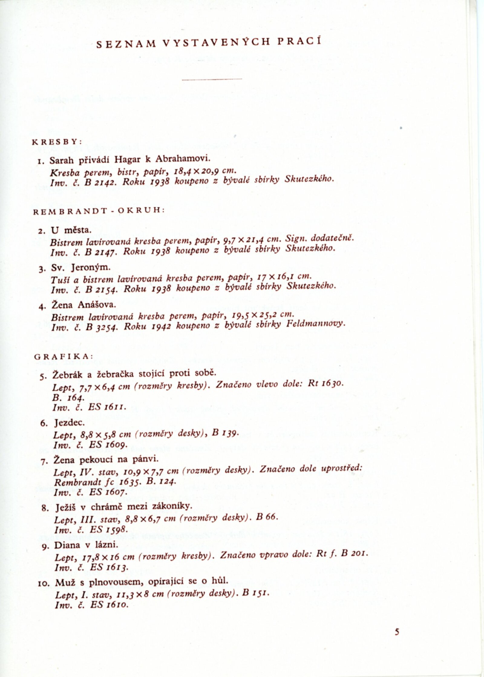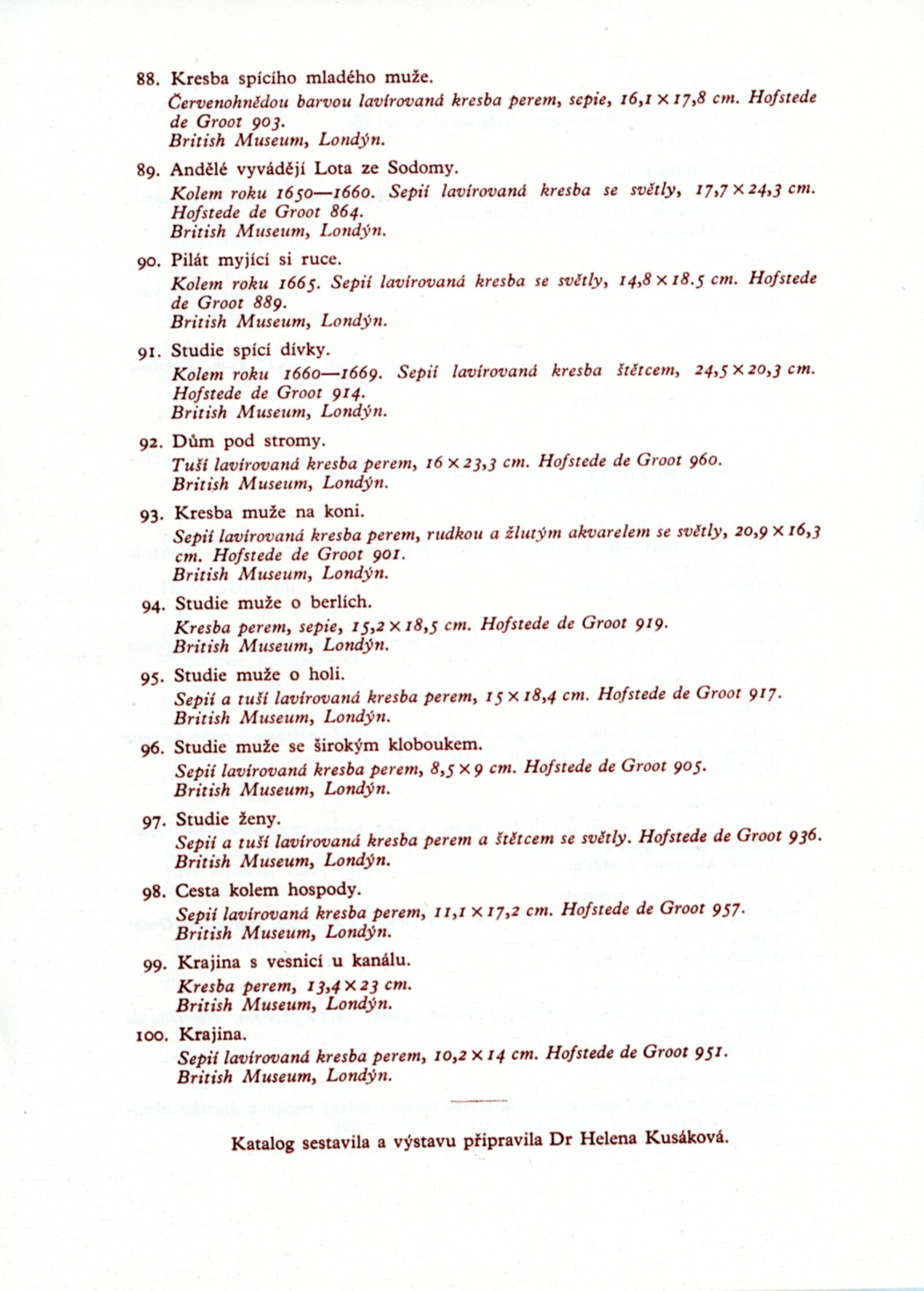 Rembrandt. Výstava kreseb a grafiky k 350. výročí narození: Dům umění města Brna, 22. 4. – 20. 5. 1956 / Text: Helena Kusáková. – Brno: DUmB, 1956. – 11 s., odborné popisy exponátů, DU 247. – MG