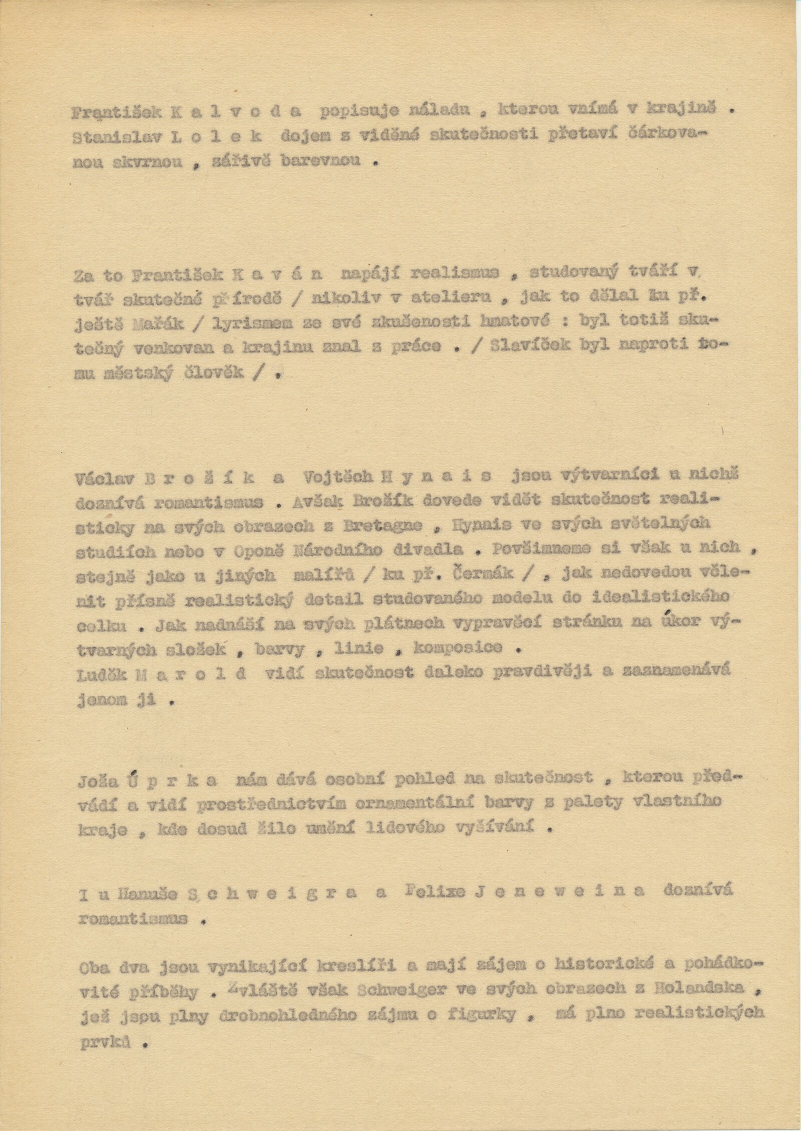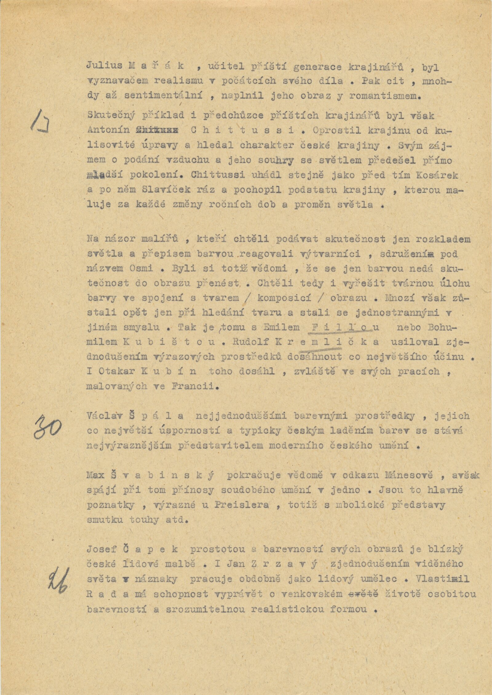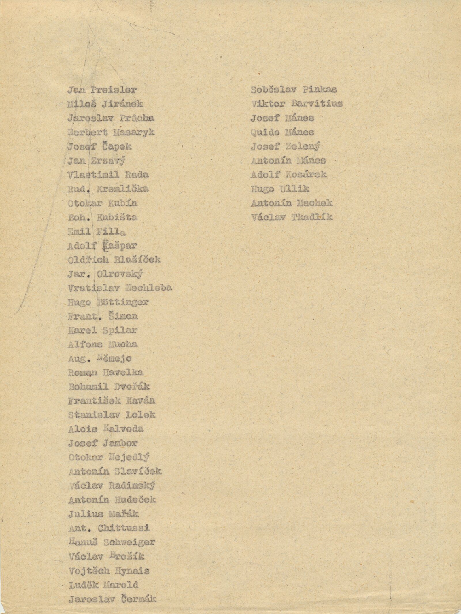 Jan Preisler, Miloš Jiránek, Jaroslav Průcha, Herbert Masaryk, Josef Čapek, Jan Zrzavý, Vlastimil Rada, Rudolf Kremlička, Otokar Kubín, Bohumil Kubišta, Emil Filla, Adolf Kašpar, Oldřich Blažíček, Jaroslav Orlovský, Vratislav Nechleba, Hugo Böttinger, František Šimon, Karel Špillar, Alfons Mucha, Augustin Němejc, Roman Havelka, Bohumil Dvořák, František Kaván, Stanislav Lolek, Alois Kalvoda, Josef Jambor, Otokar Nejedlý, Antonín Slavíček, Václav Radimský, Antonín Hudeček, Julius Mařák, Antonín Chittussi, Hanuš Schweiger, Václav Brožík, Vojtěch Hynais, Luděk Marold, Jaroslav Čermák, Soběslav Pinkas, Viktor Barvitius, Josef Mánes, Quido Mánes, Josef Zelený, Antonín Mánes, Adolf Kosárek, Hugo Ullik, Antonín Machek, Václav Tkadlík, Karel Holan, Vincenc Beneš, Bořivoj Župan, Bohumil Dvorský, Miloslav Holý, Vladimír Hroch, Vojtěch Sedláček, Václav Rabas, Janko Alexy, Mikuláš Gelanda, Cyprián Majerník, Eugen Lehotský, Eduard Milén, Linka Procházková, Jaroslav Král, Milan Mitrovský, František Foltýn, Jaroslav Dvořáček, Vincenc Makovský, Karel Pokorný, Josef Brož, Jaroslav Kousal, Jan Čumpelík, František Tkadlík, Felix Jenewein