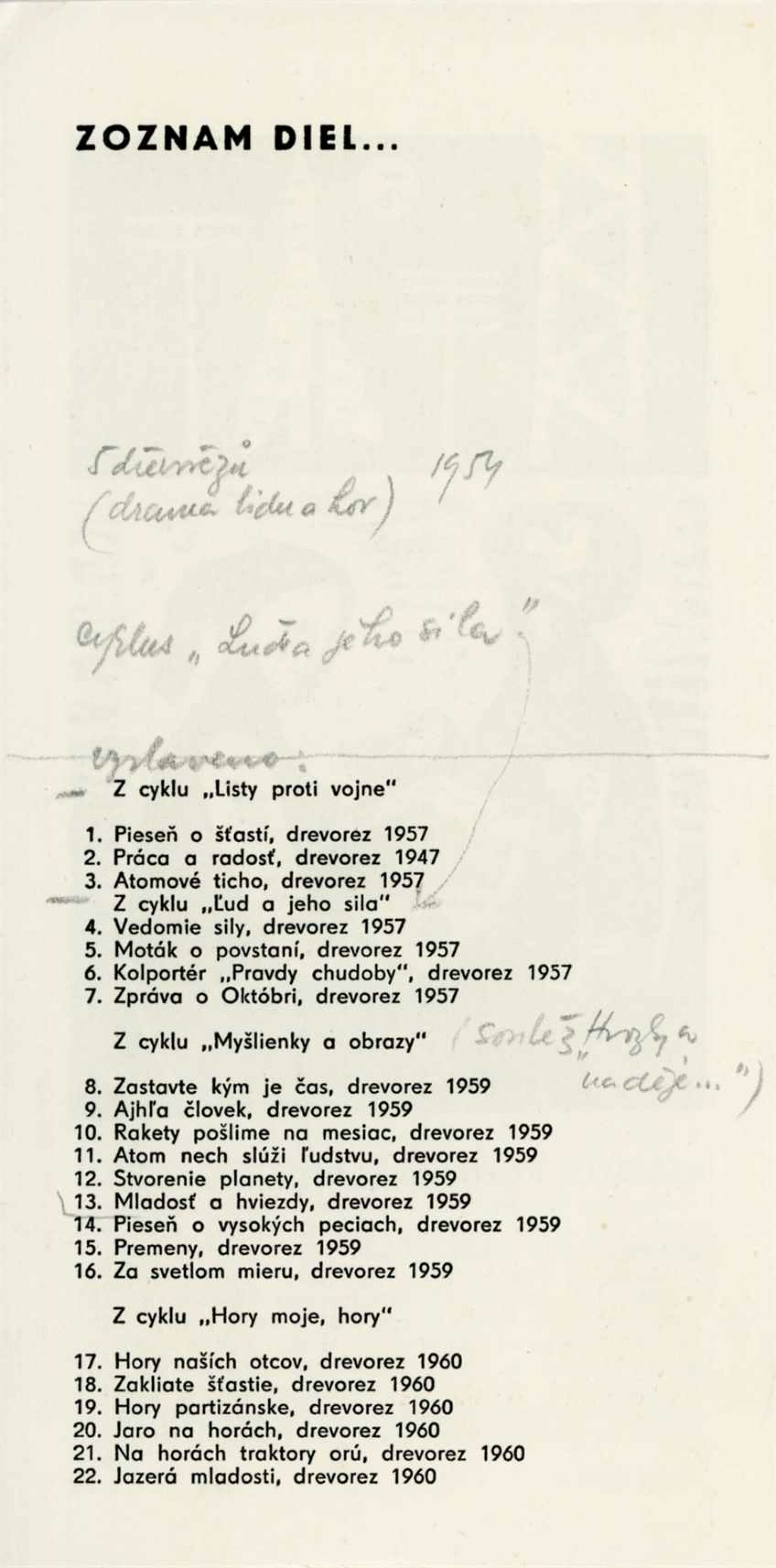 společná pozvánka DPK 147 a 148, katalog, fotografie díla, podmínky pro uspořádání výstavy, korespondence (změna termínu, příprava katalogu, provozní korespondence), recenze v tisku (časopis Výtvarný život IV, 1960 „Z atelierov“, reprodukce)