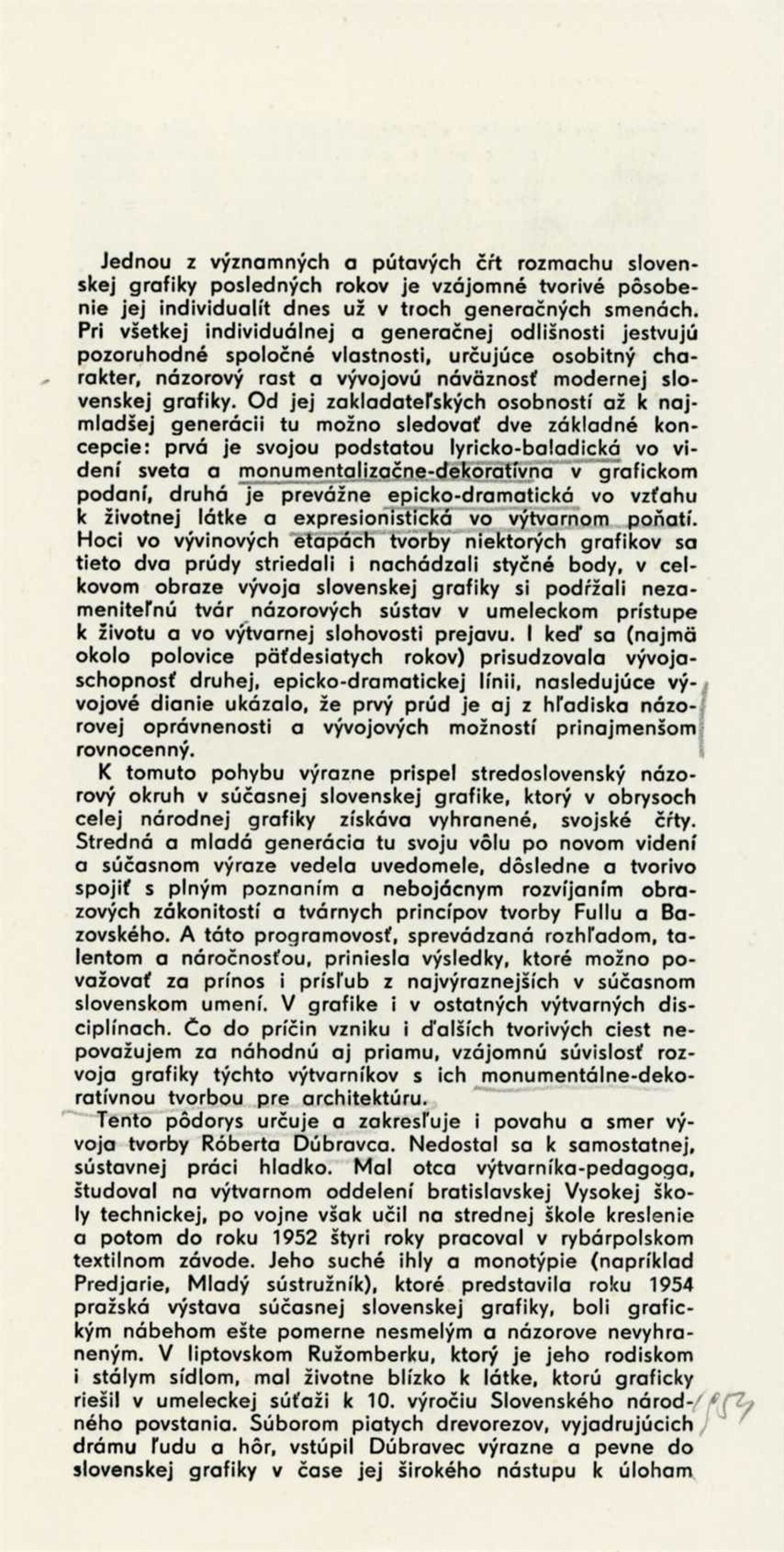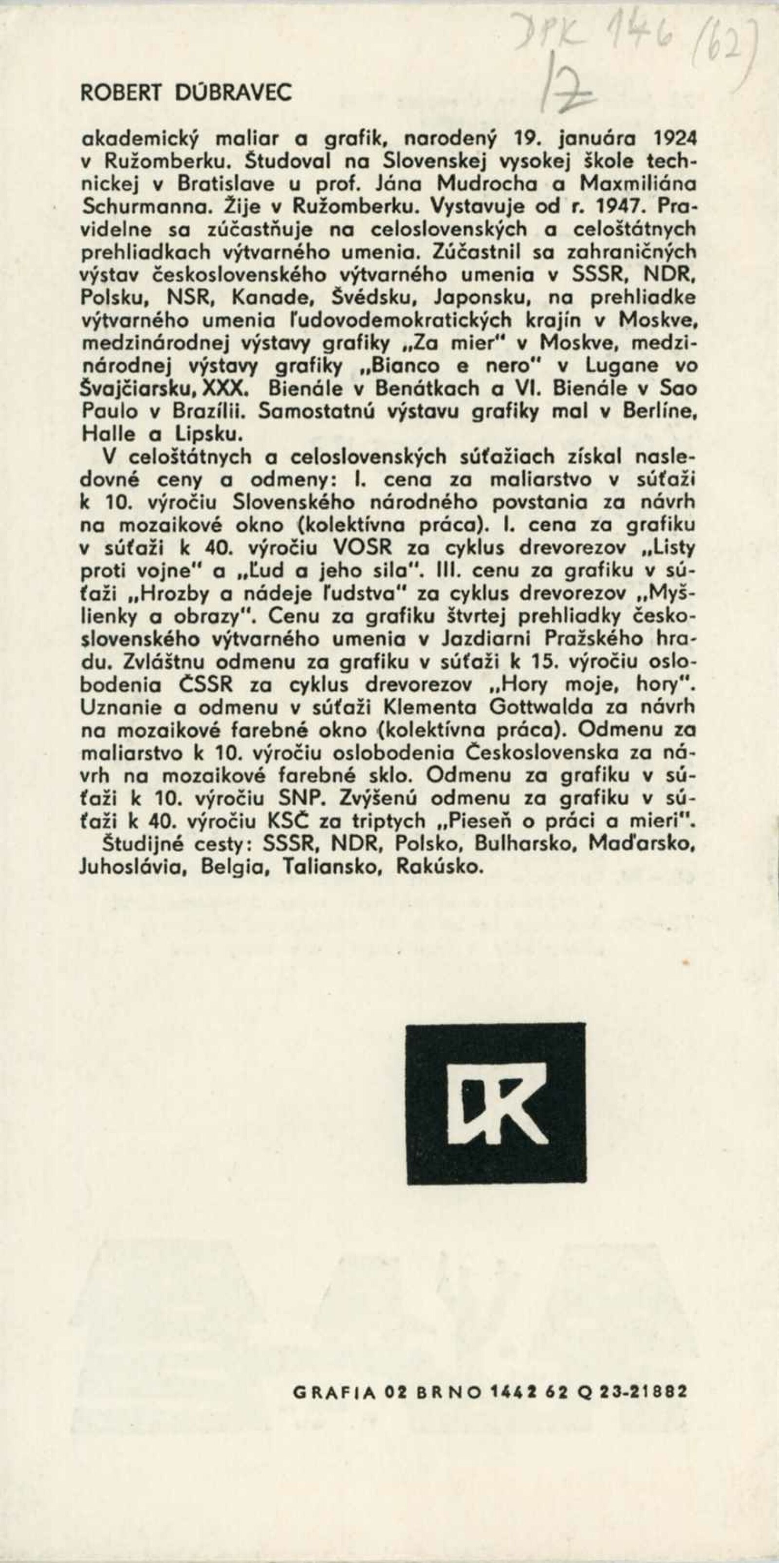 Robert Dúbravec. Grafika 1957–1962: Dům umění města Brna / Dům pánů z Kunštátu, 32. výstava Kabinetu grafiky, 6. 4. – 1. 5. 1962 / Text: Ľubor Kára. – B.m.n., 1962. – 8 s., obr., životopis, DPK 146. – MG; MMB