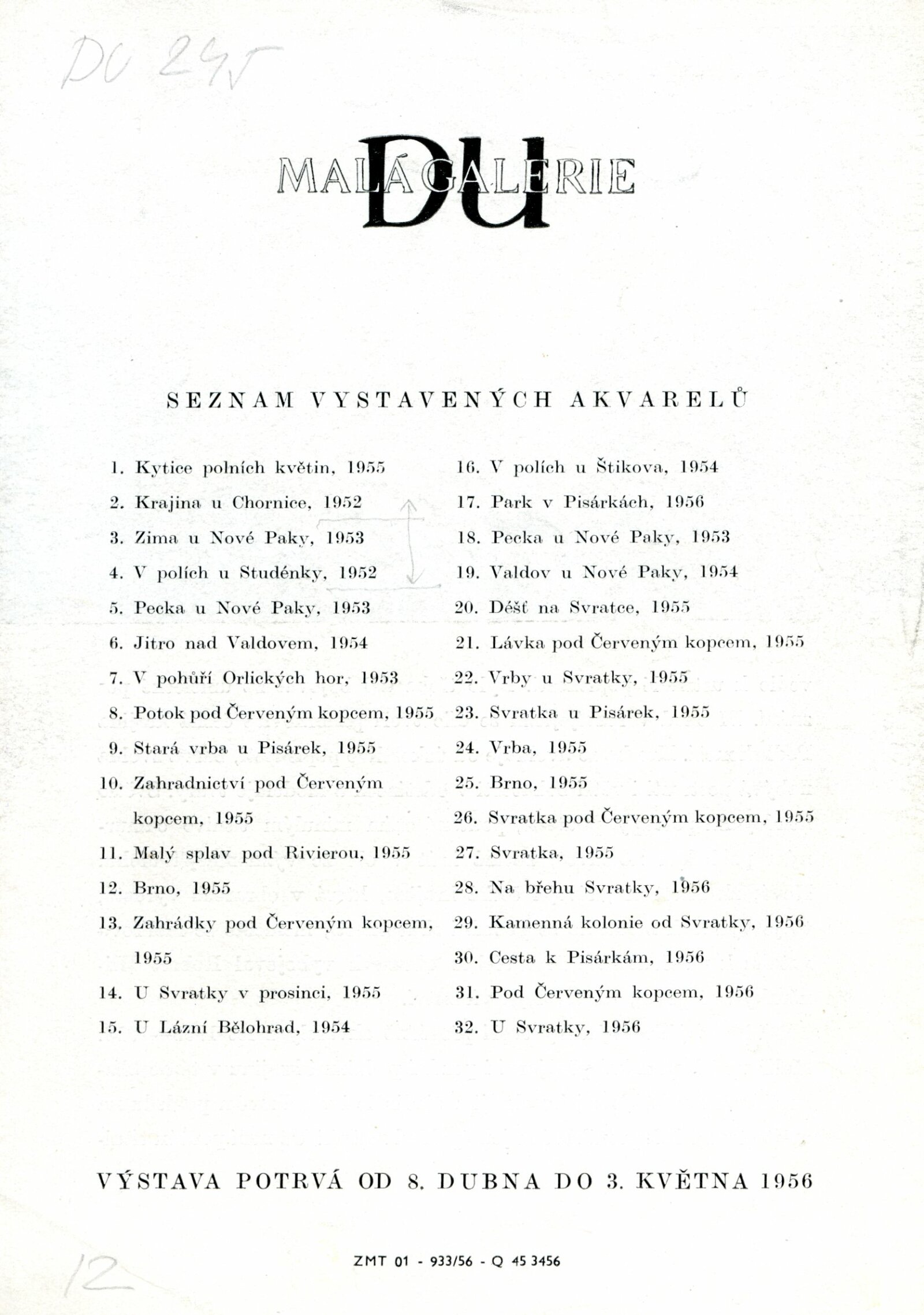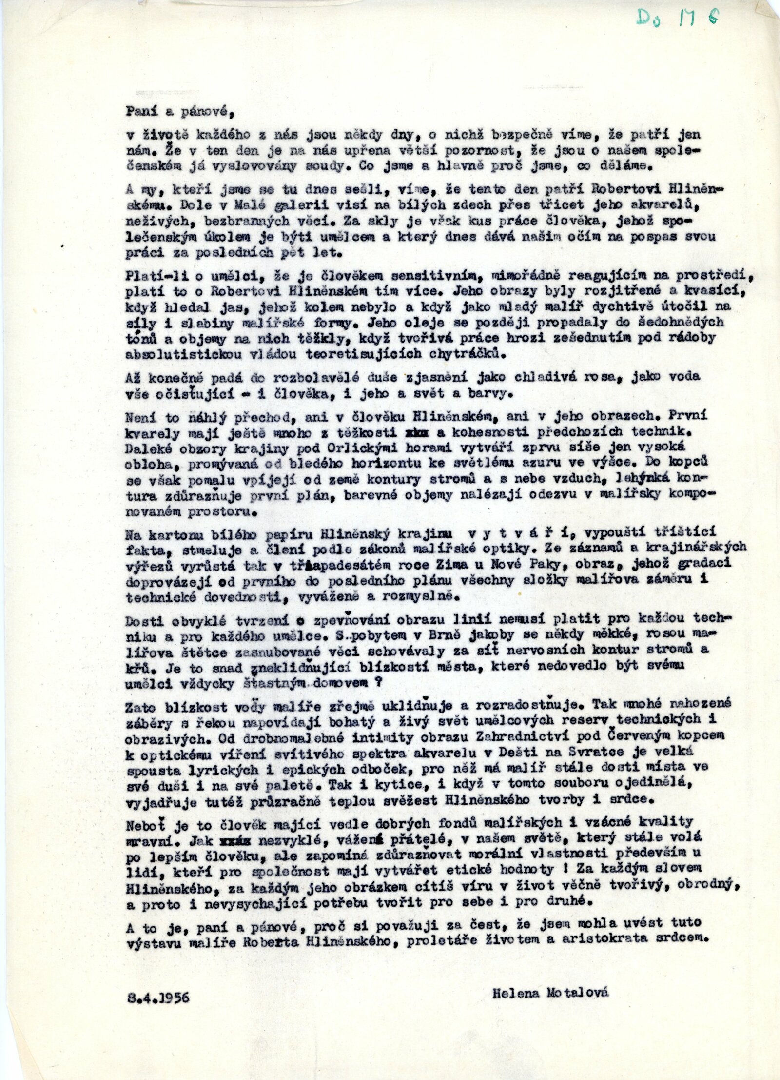 pozvánka, úvod vernisáže (Adolf Kroupa a Helena Motalová), katalog se soupisem vystavených děl, korespondence, žádost o výstavu, recenze v tisku