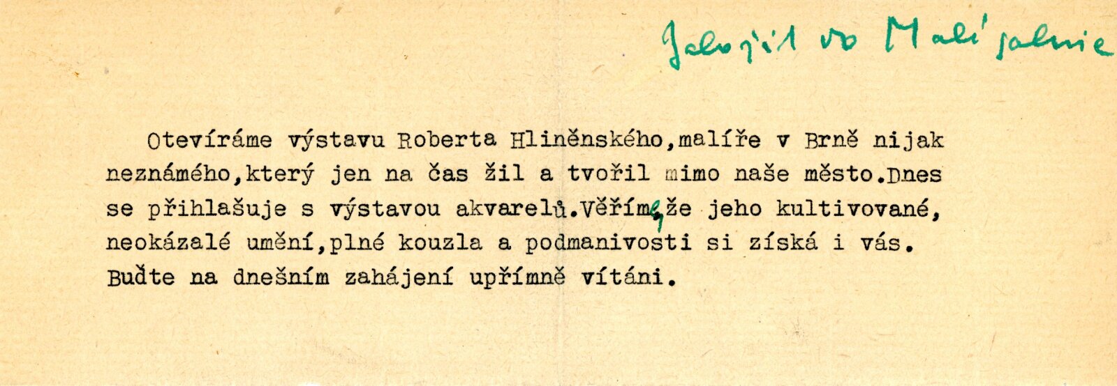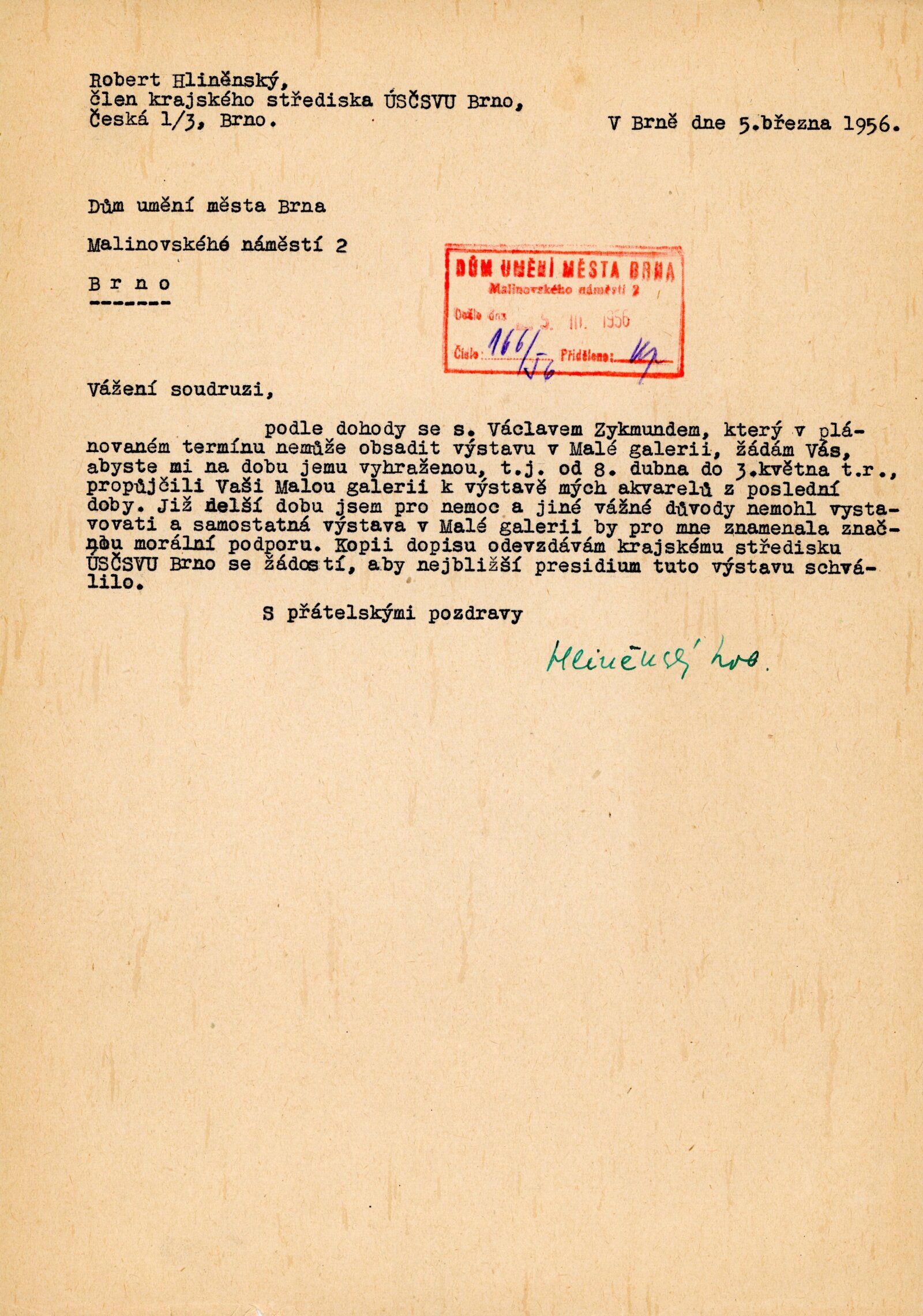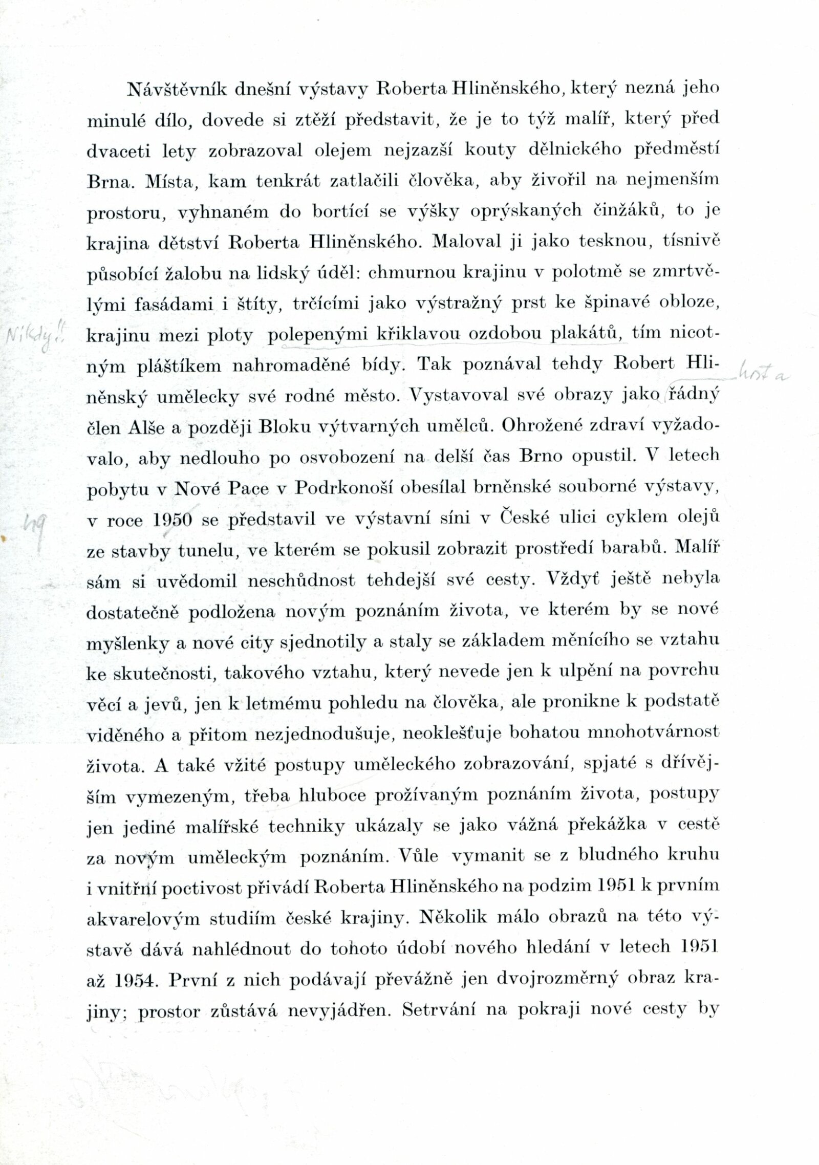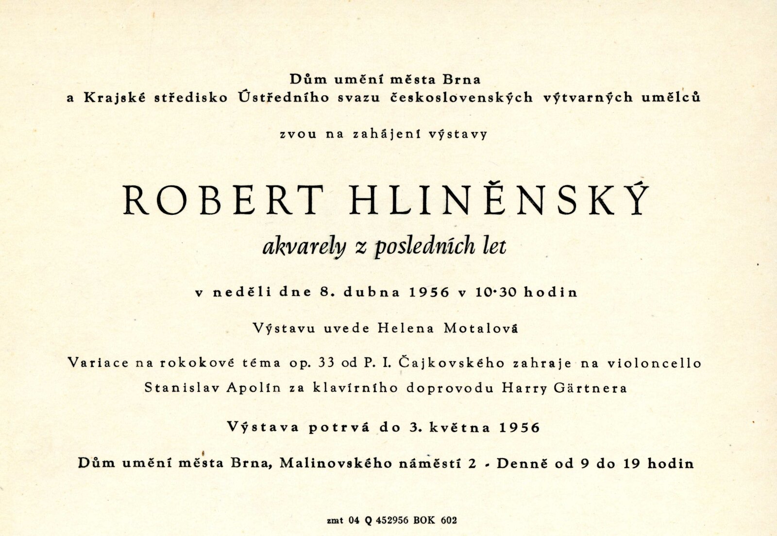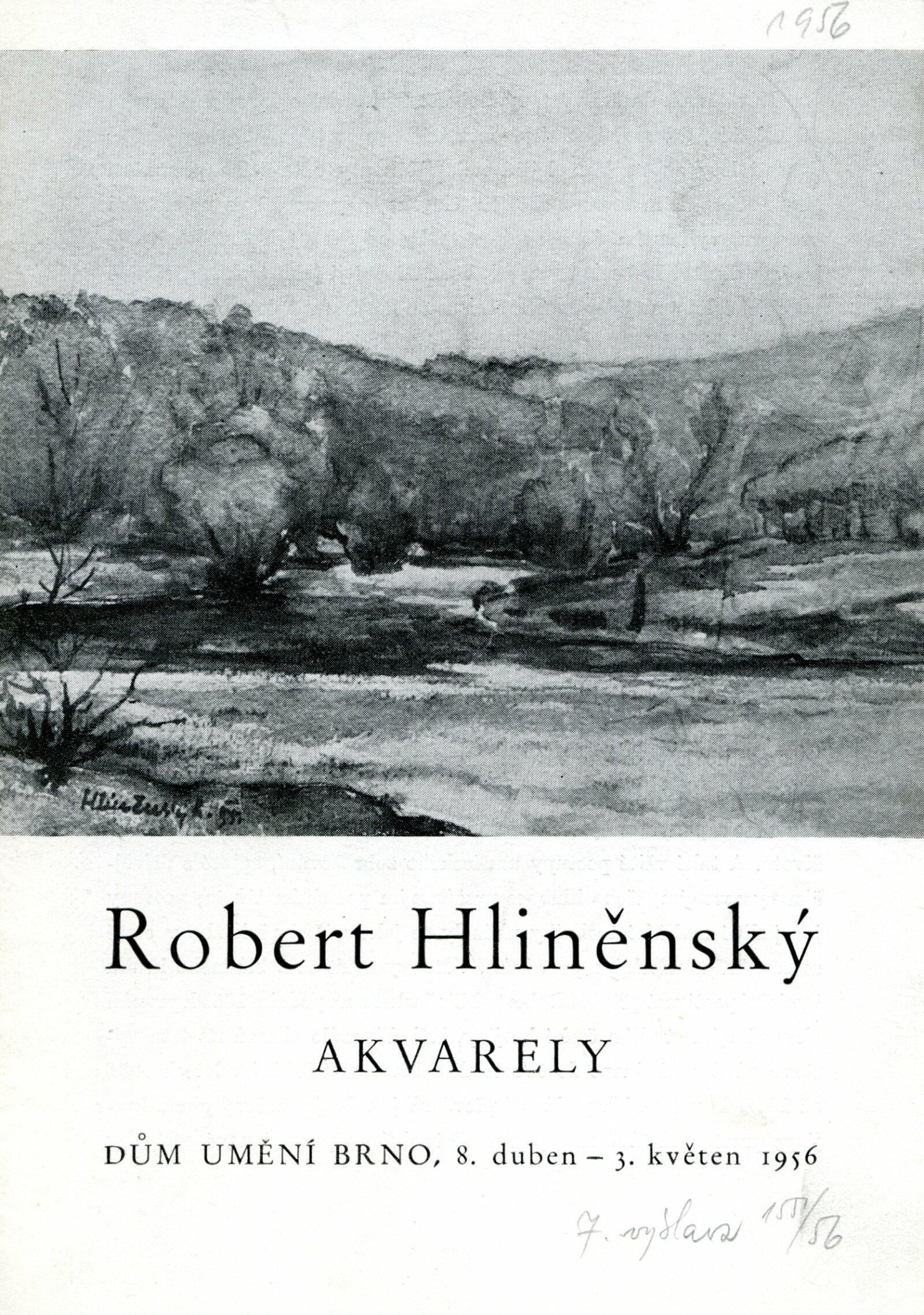 Robert Hliněnský. Akvarely: Dům umění, Malá galerie, 8. 4. – 3. 5. 1956 / Text: František Tenčík. – Brno: DUmB, 1956. – skládačka, 6 s., obr., DU 245. – MZK; MG; MMB