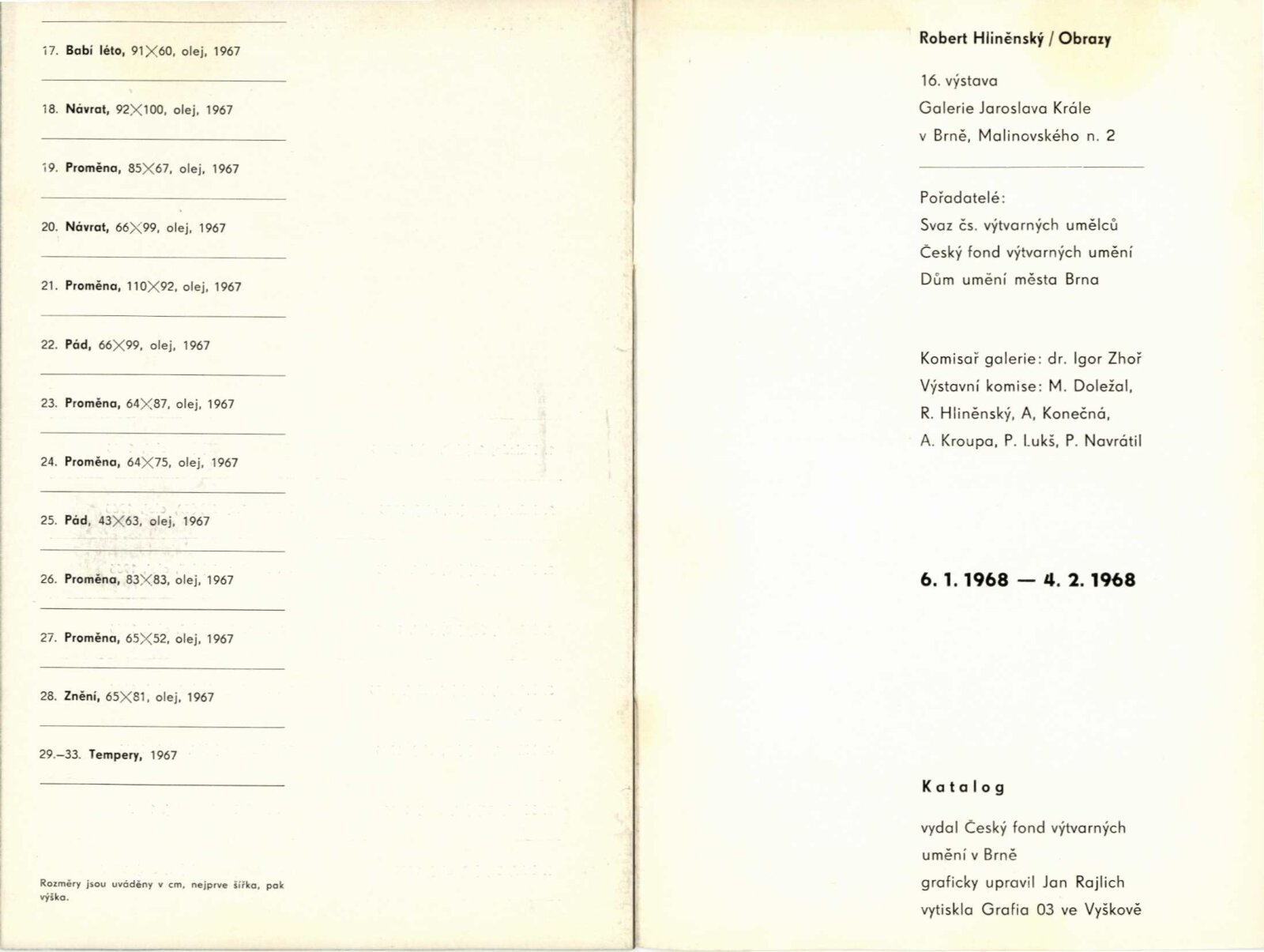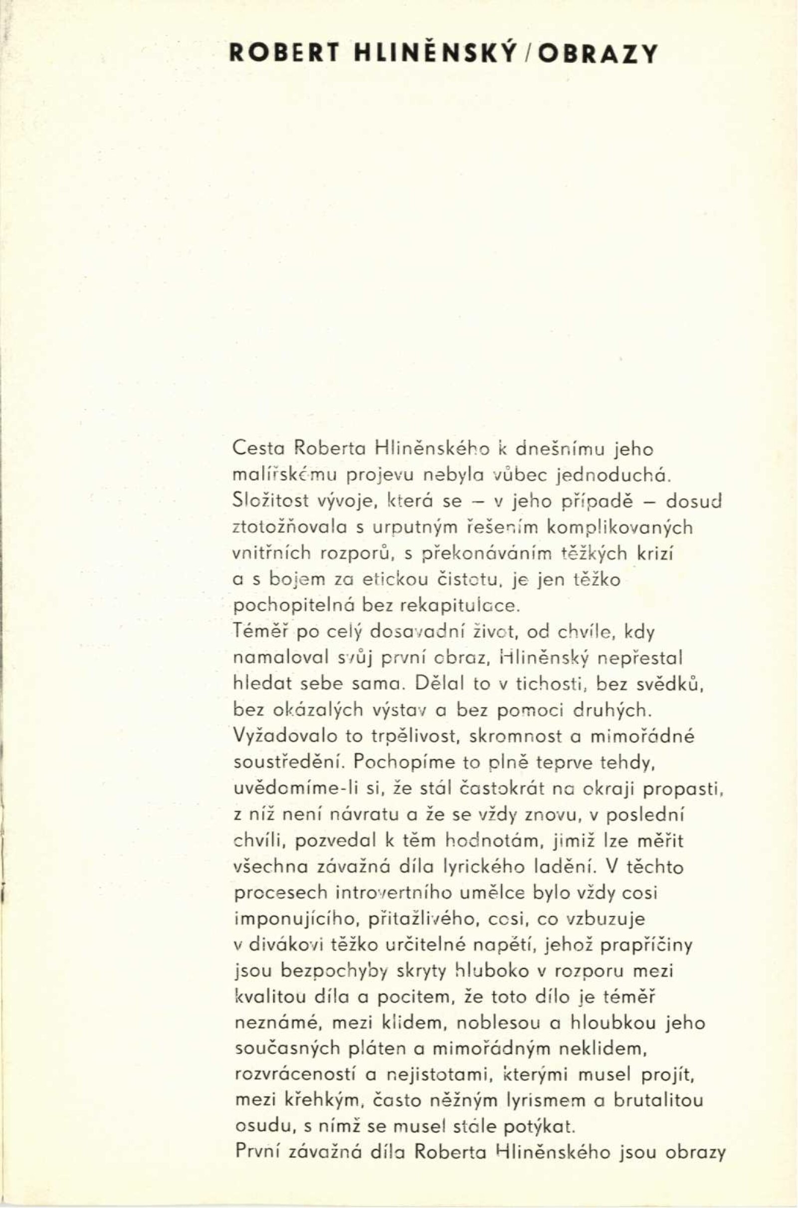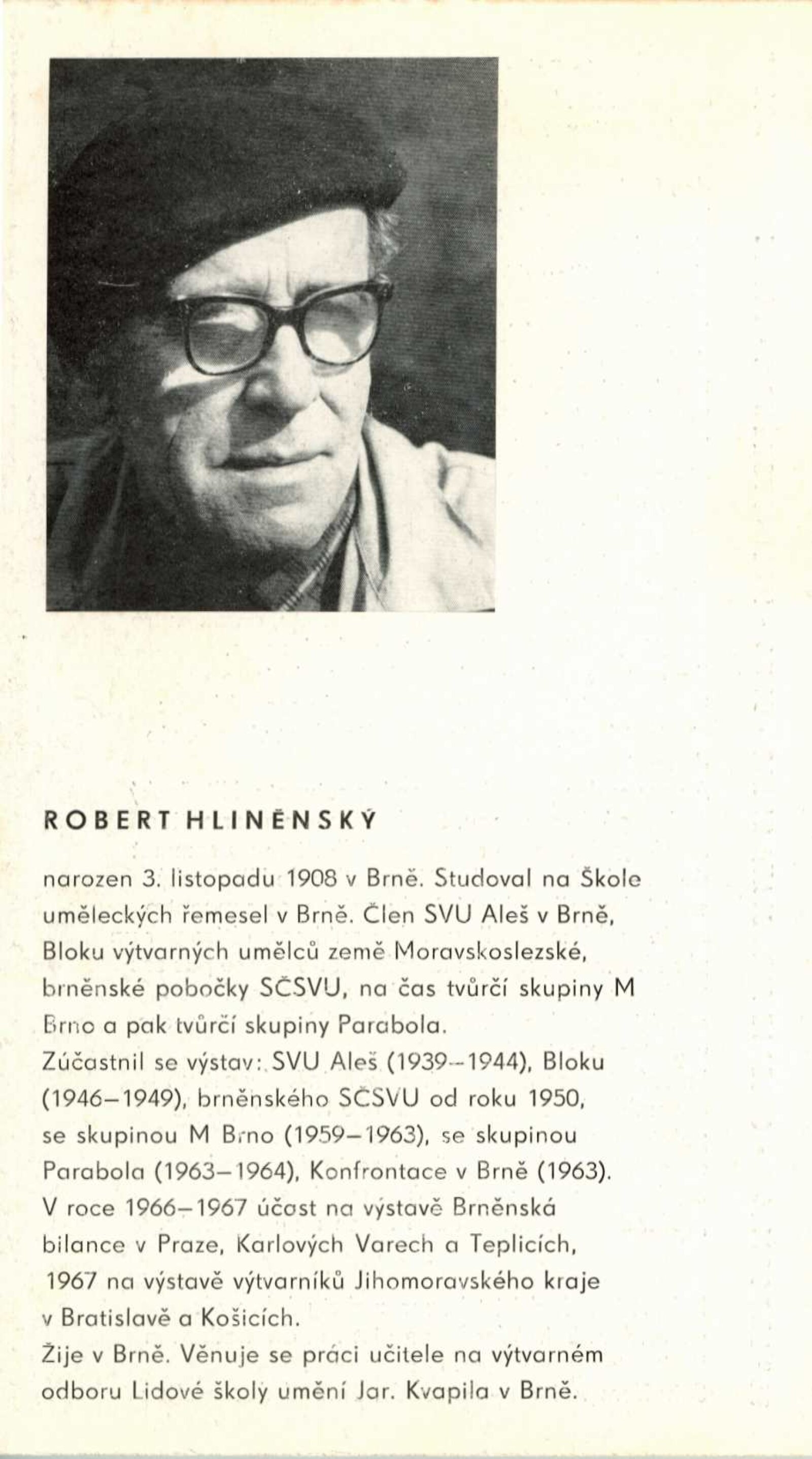Robert Hliněnský. Obrazy: Dům umění, 16. výstava Galerie Jaroslava Krále, 6. 1. – 4. 2. 1968/ Text: Václav Zykmund. – Brno: ČFVU, 1968. – 10 s., obr., portrét, životopis, DU 495. – MG