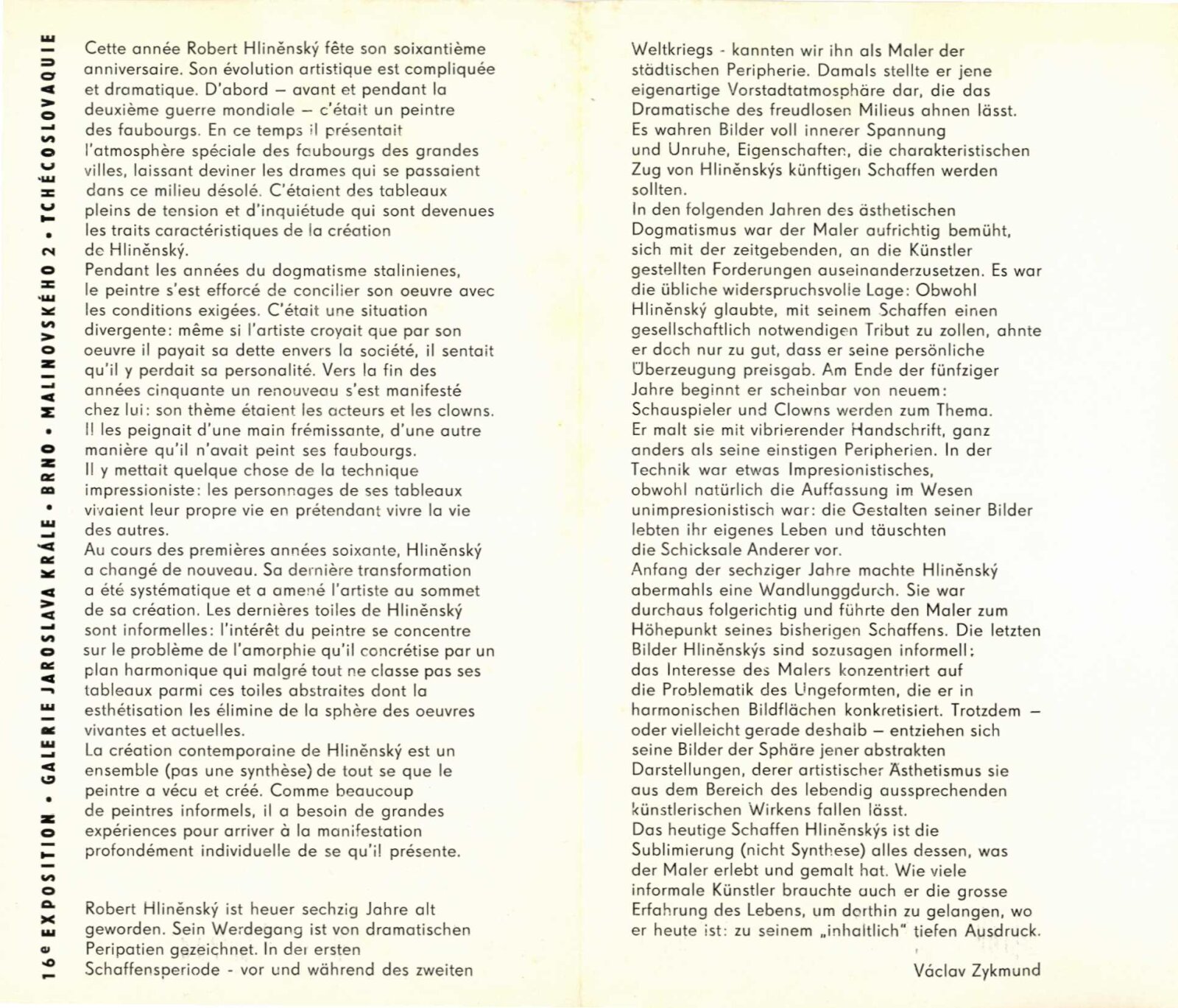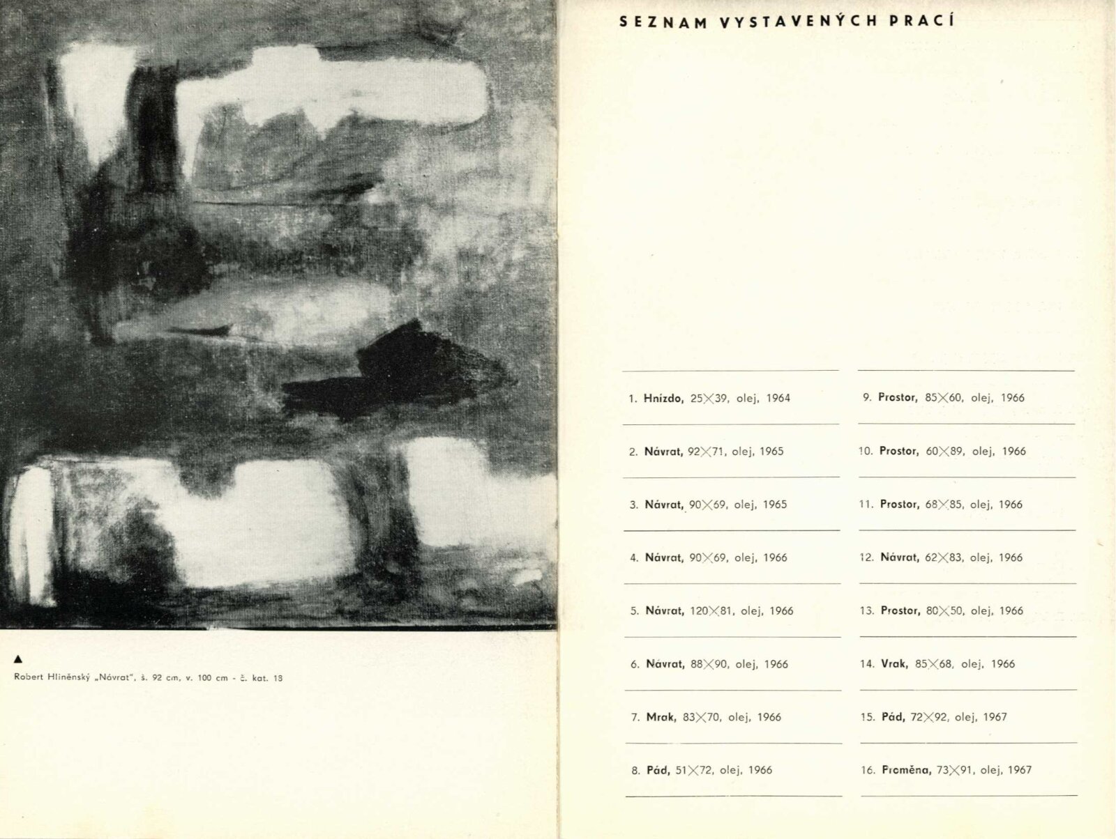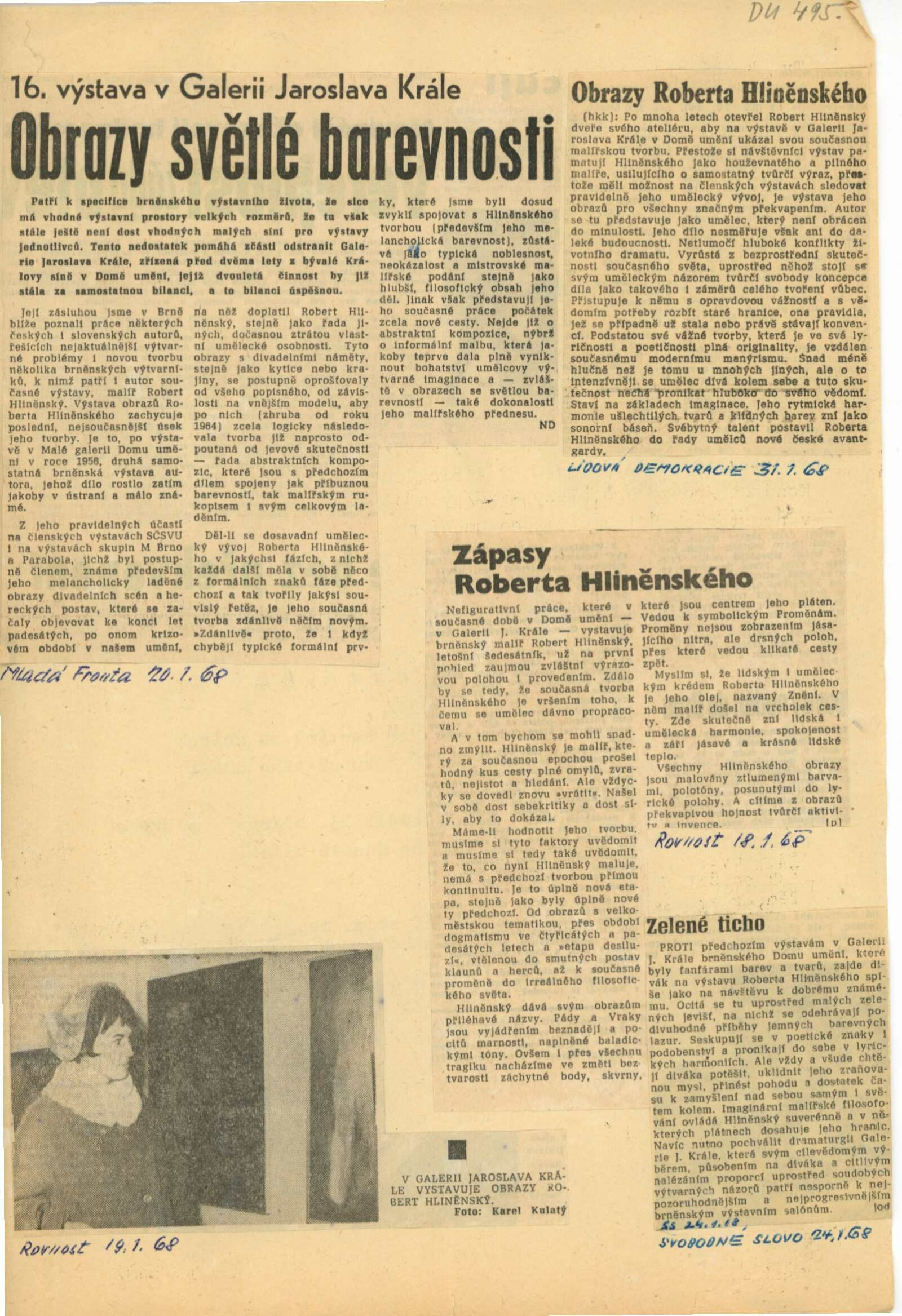Robert Hliněnský. Obrazy: Dům umění, 16. výstava Galerie Jaroslava Krále, 6. 1. – 4. 2. 1968/ Text: Václav Zykmund. – Brno: ČFVU, 1968. – 10 s., obr., portrét, životopis, DU 495. – MG
