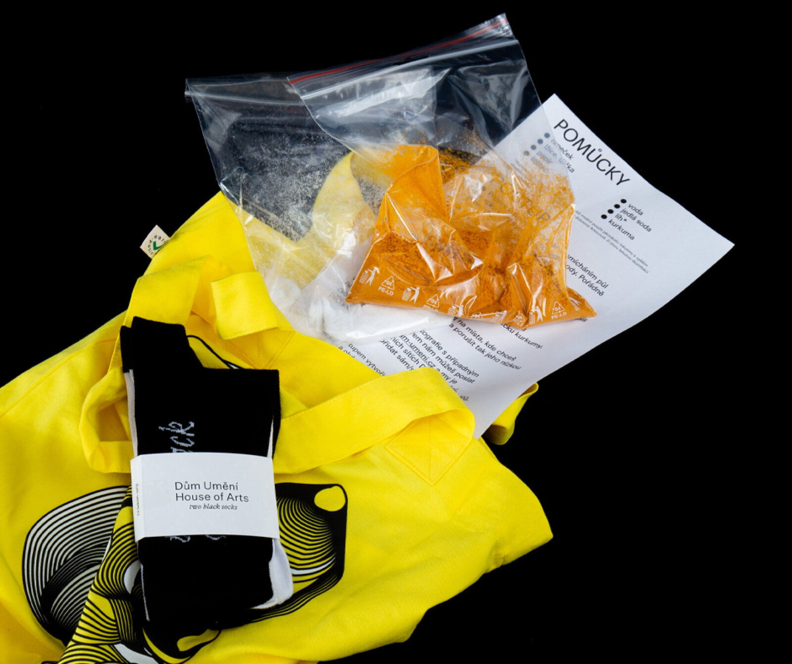 Taška obsahuje ponožky exkluzivně vyrobené pro Dům umění (velikost dle výběru), návod k aktivitě, kurkumu a sodu… To zní hodně zajímavě, že?
