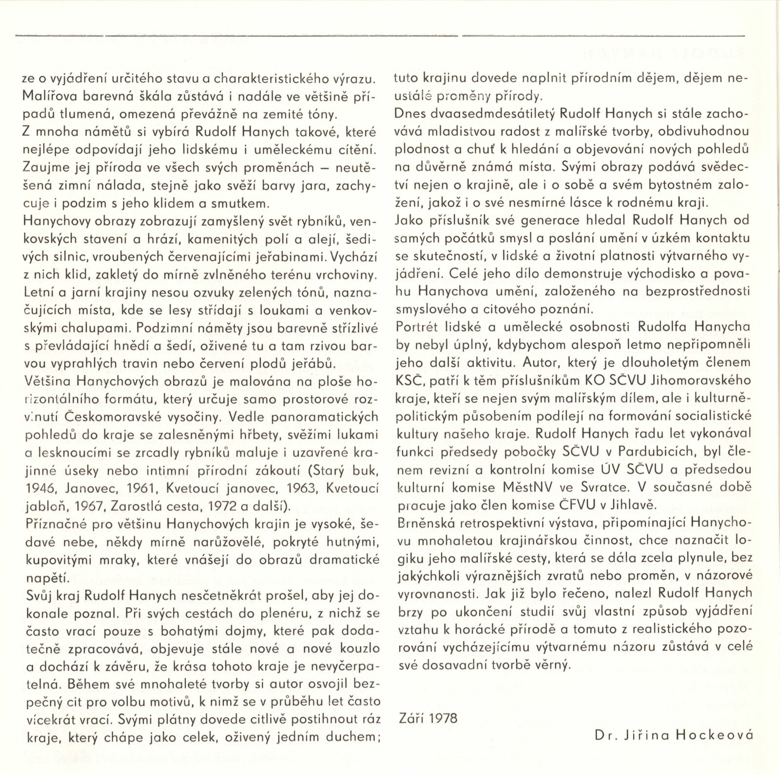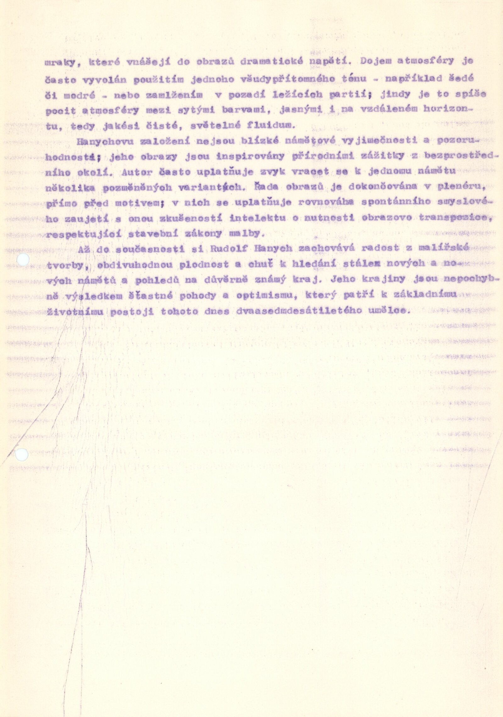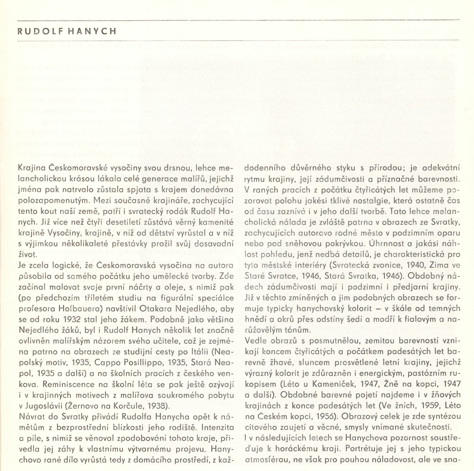 pozvánka, katalogy předchozích výstav (Žďár nad Sázavou 1968, Pardubice 1973, Brno 1975, Jihlava), seznam vystavených děl, fotoreprodukce děl, foto autora, strojopis úvodního textu vernisáže, podklady pro katalog, korespondence (rukopisy Rudolfa Hanycha), provozní korespondence, reversy, žádost o výstavu, recenze v tisku