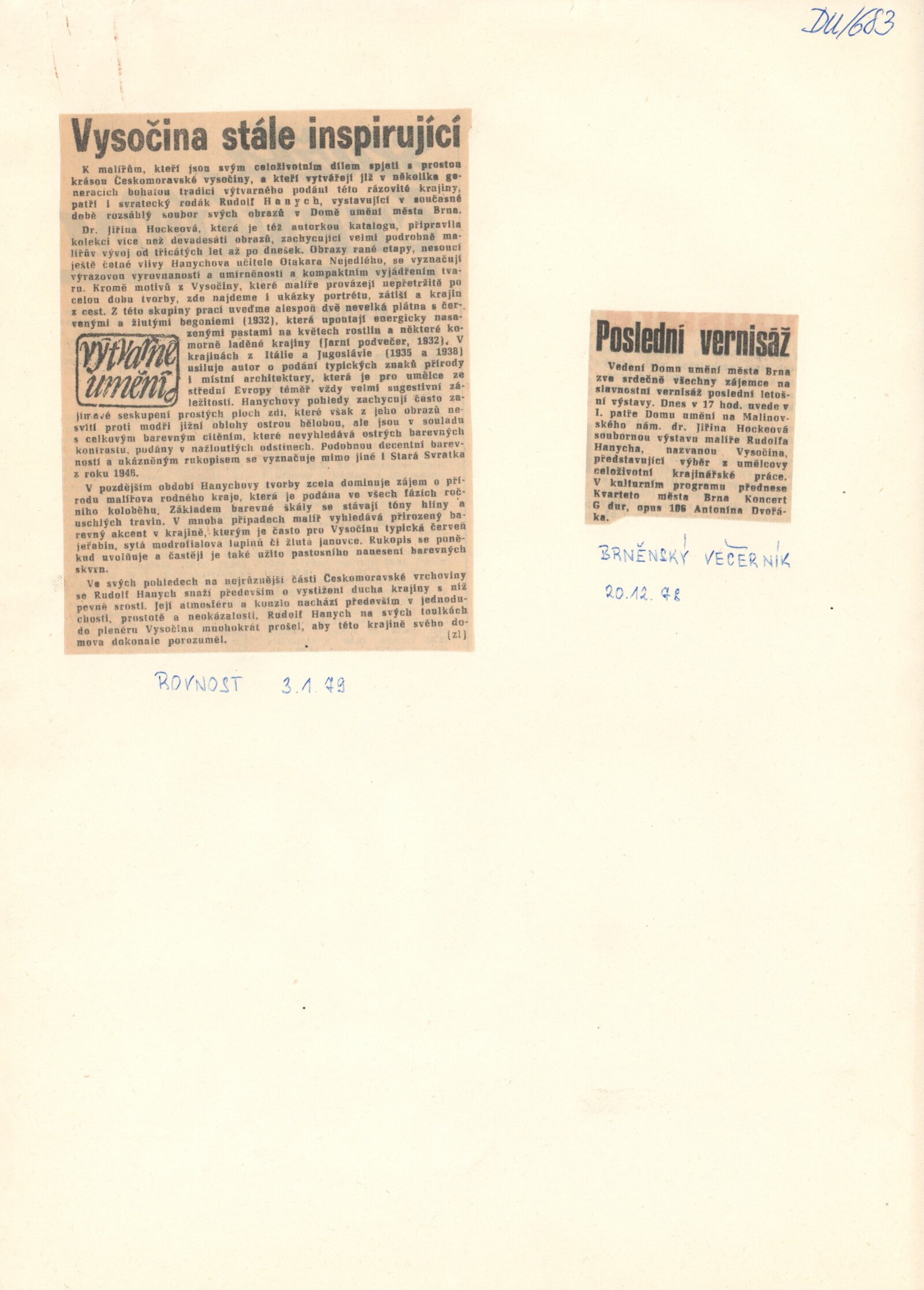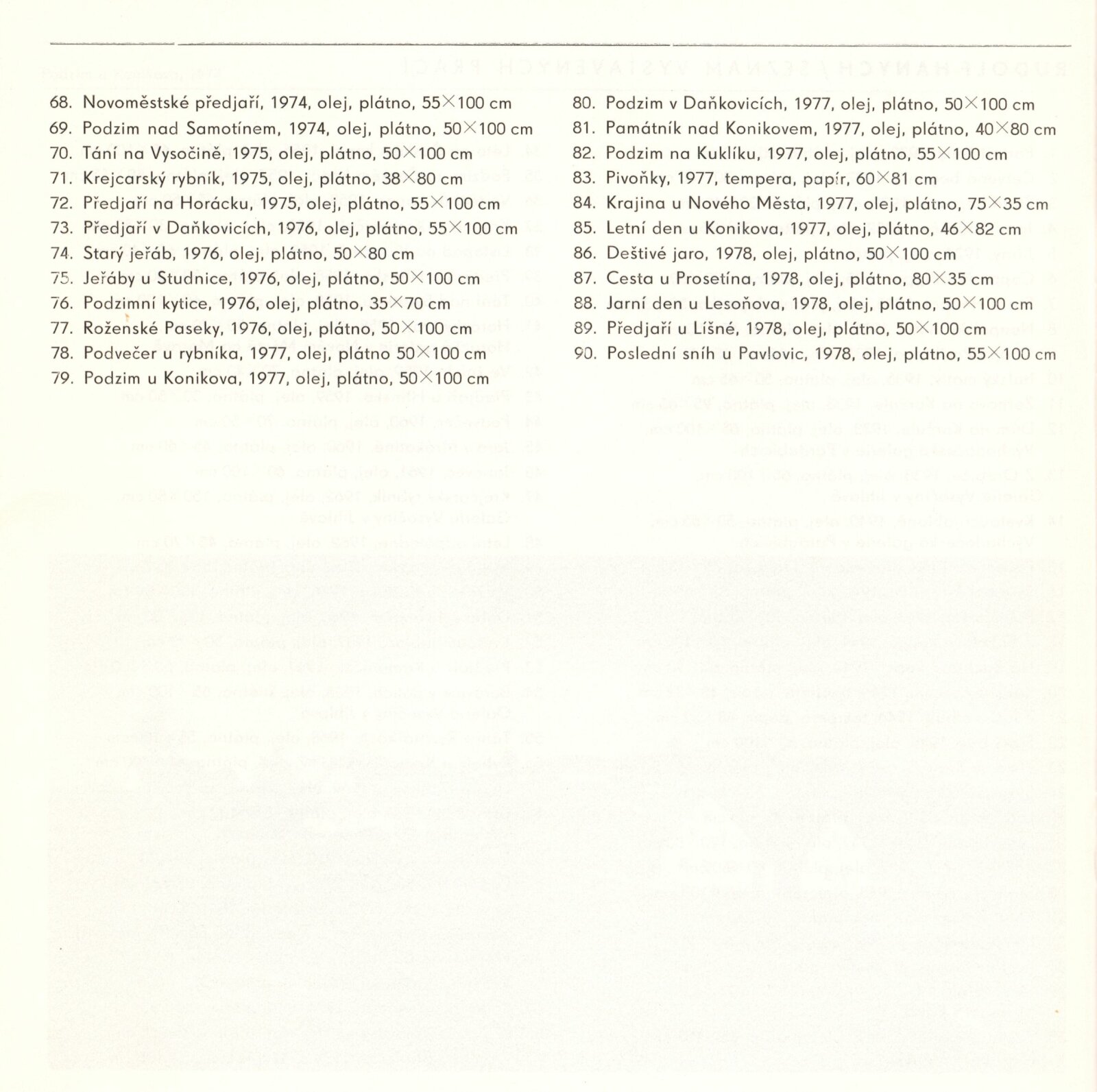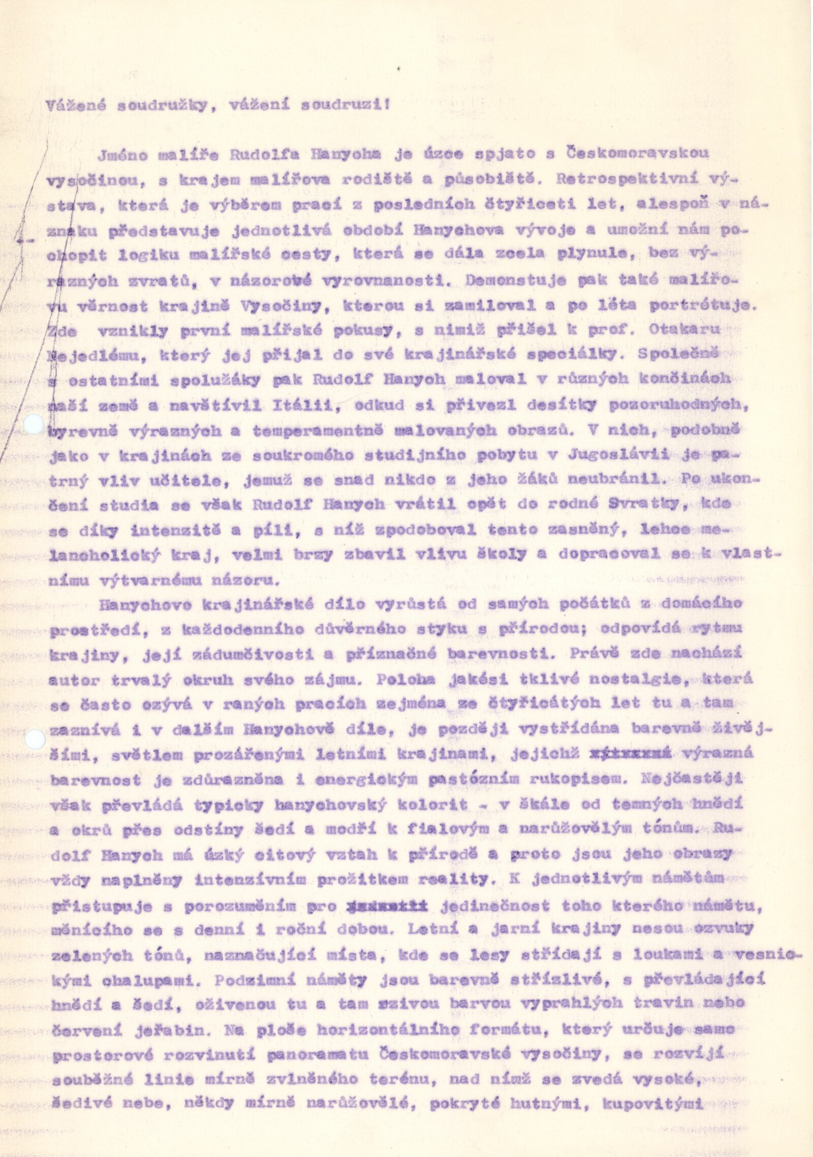 pozvánka, katalogy předchozích výstav (Žďár nad Sázavou 1968, Pardubice 1973, Brno 1975, Jihlava), seznam vystavených děl, fotoreprodukce děl, foto autora, strojopis úvodního textu vernisáže, podklady pro katalog, korespondence (rukopisy Rudolfa Hanycha), provozní korespondence, reversy, žádost o výstavu, recenze v tisku