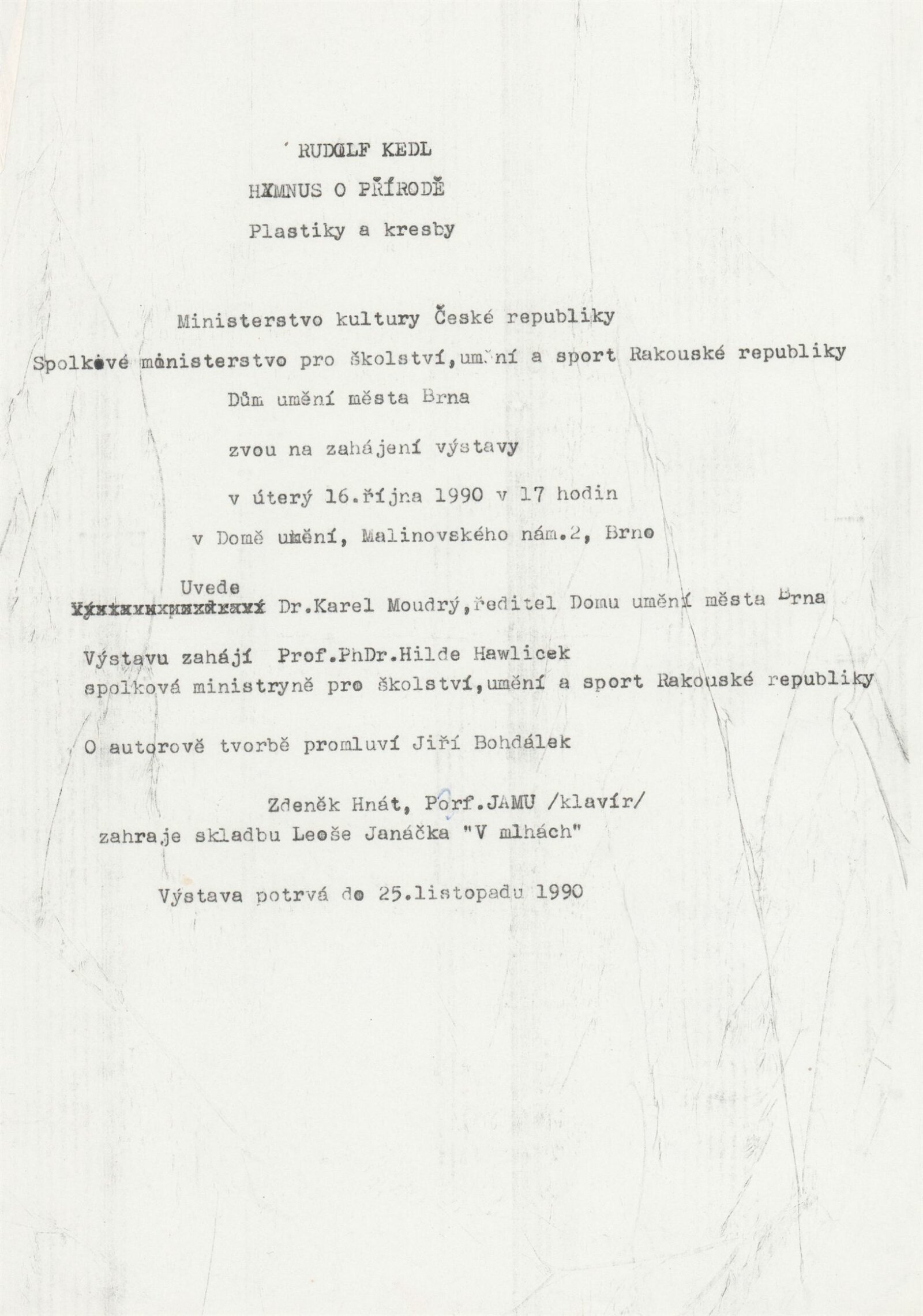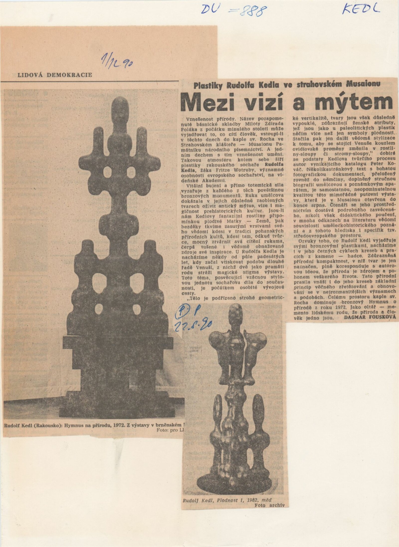 Rudolf Kedl. Hymnus o přírodě. Pastiky a kresby: Dům umění města Brna, Galerie Jaroslava Krále, hala, 16. 10. 1990 – 25. 11. 1990 / Text: Peter Kováč. – B. m. n., 1990. – [30] s., 99 s. obr. příl., [8] s., současně vydána skládačka Rudolf Kedl s textem Petra Kováče o 8 s., DU 888. – MG