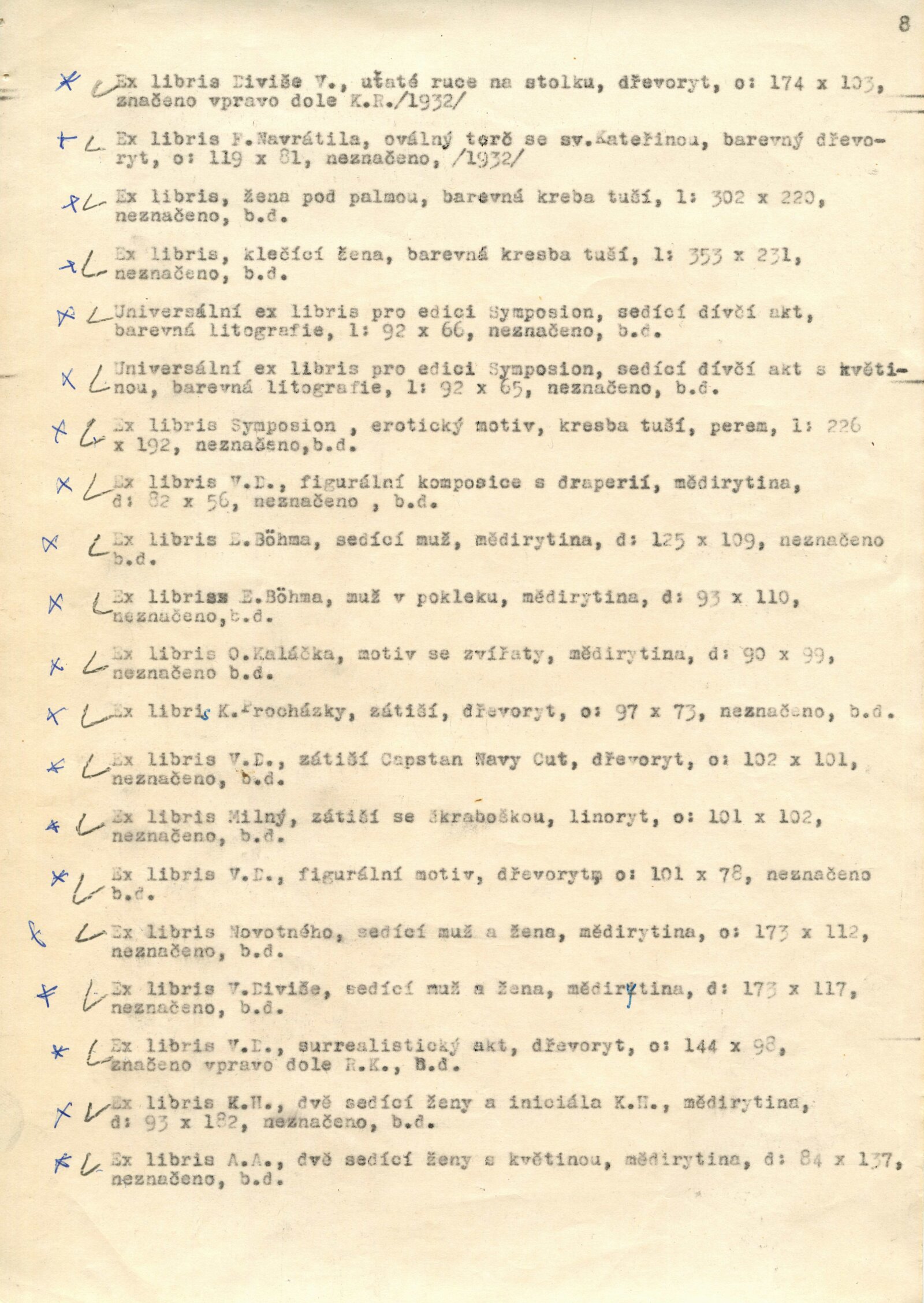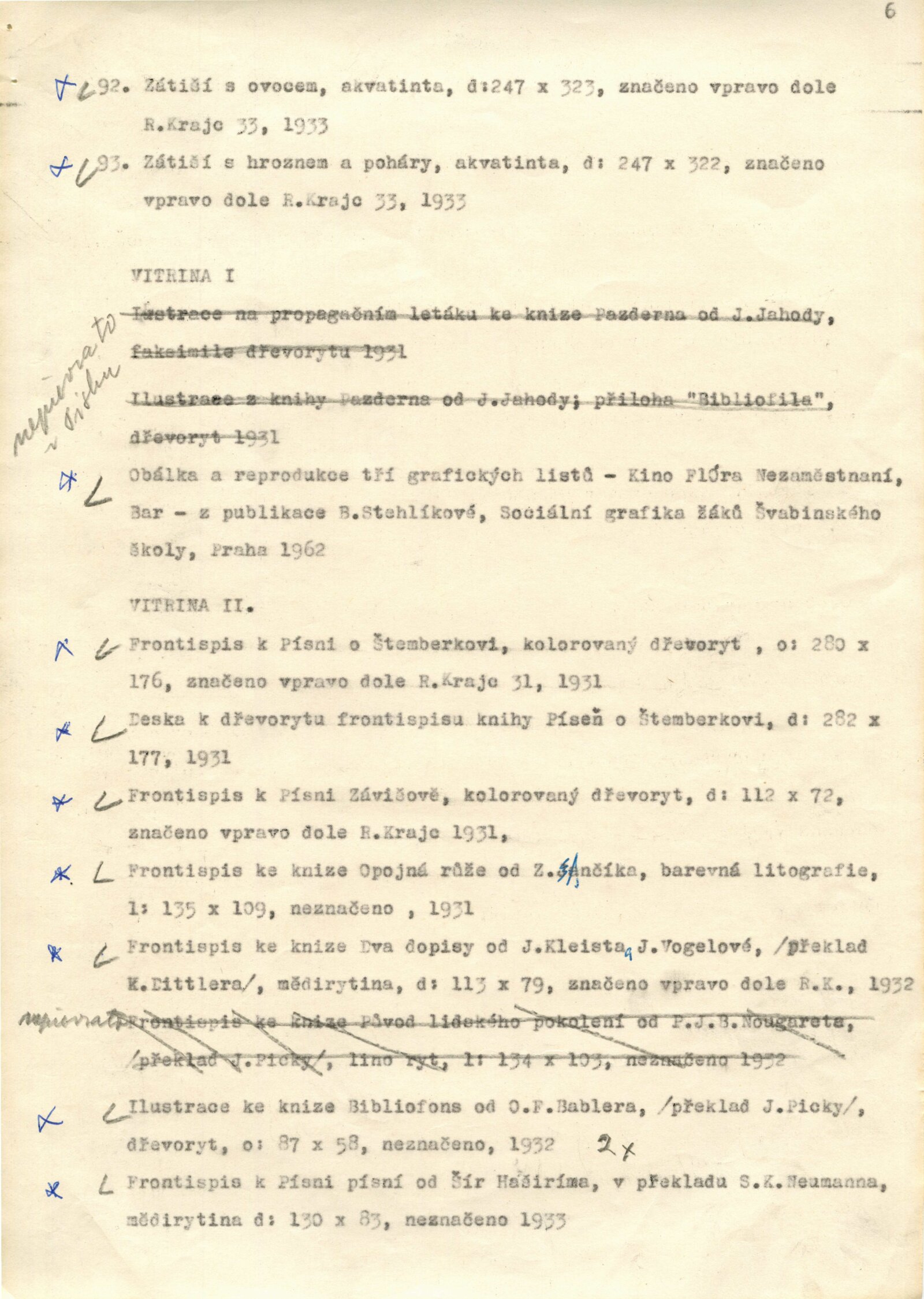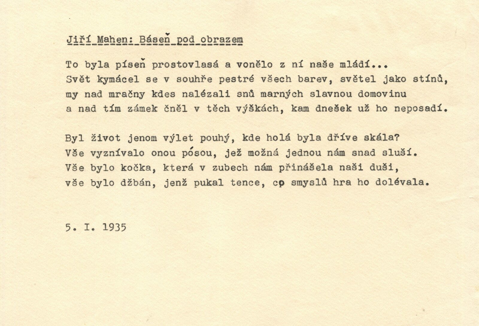 pozvánka, fotografie vernisáže, pozvánka na tiskovou konferenci, adresy zvaných, seznam vystavených děl, korespondence (návrh realizace výstavy, strojopis básní Františka Halase, Václava Hraběte a Jiřího Mahena, dopis Karly Mahenové s přiloženou dosud nepublikovanou básní Jiřího Mahena), provozní korespondence, žádost o povolení výstavy, pozvánka (PNP Praha), pozvánka na tiskovou konferece (PNP Praha), katalog (PNP Praha), program vernisáže (PNP Praha), recenze v tisk