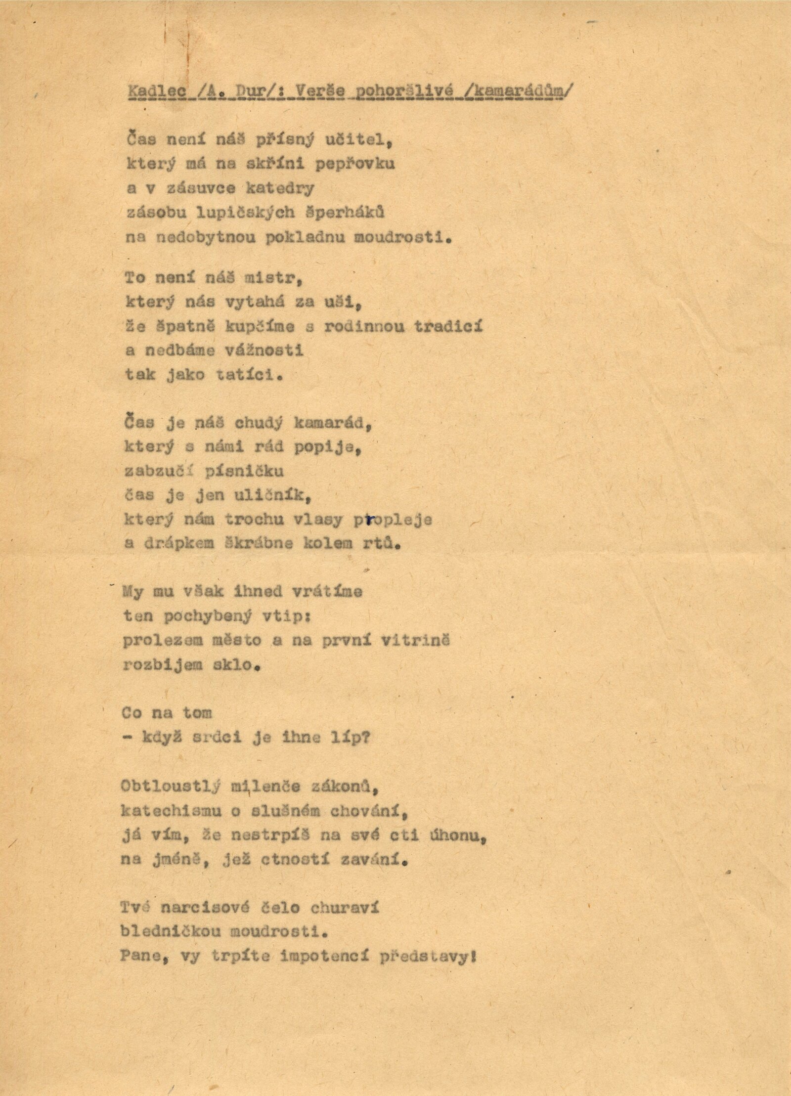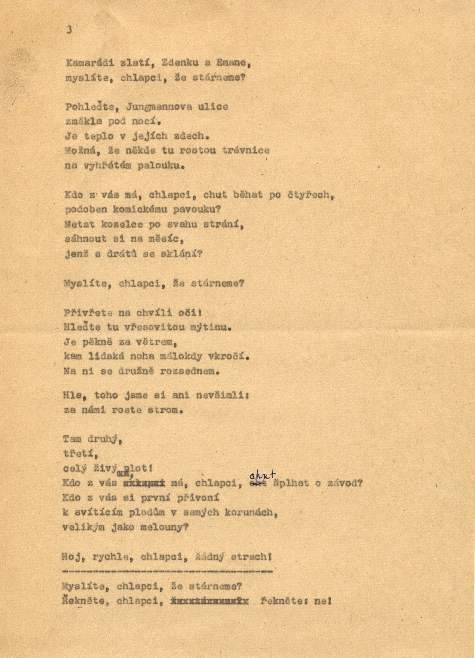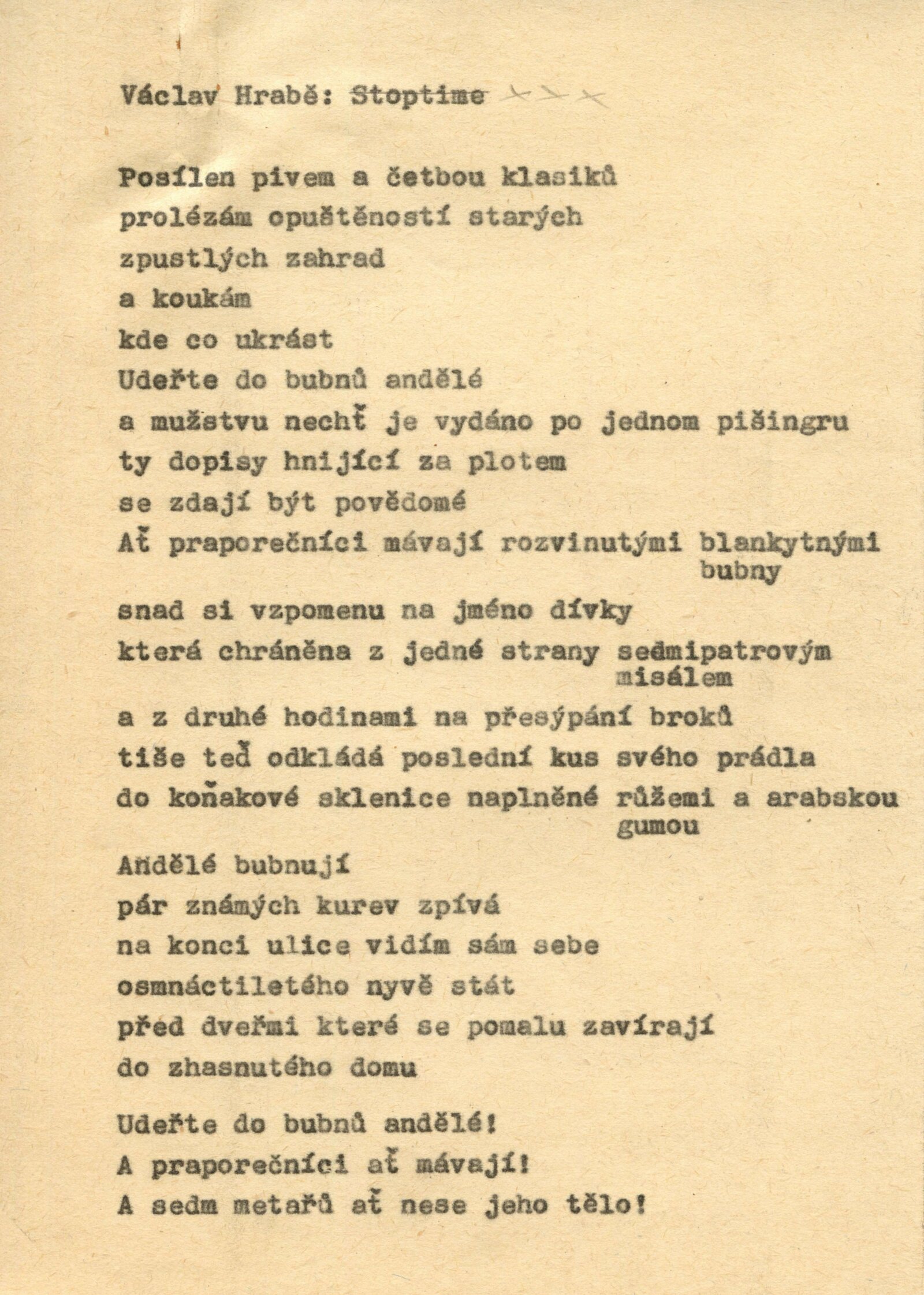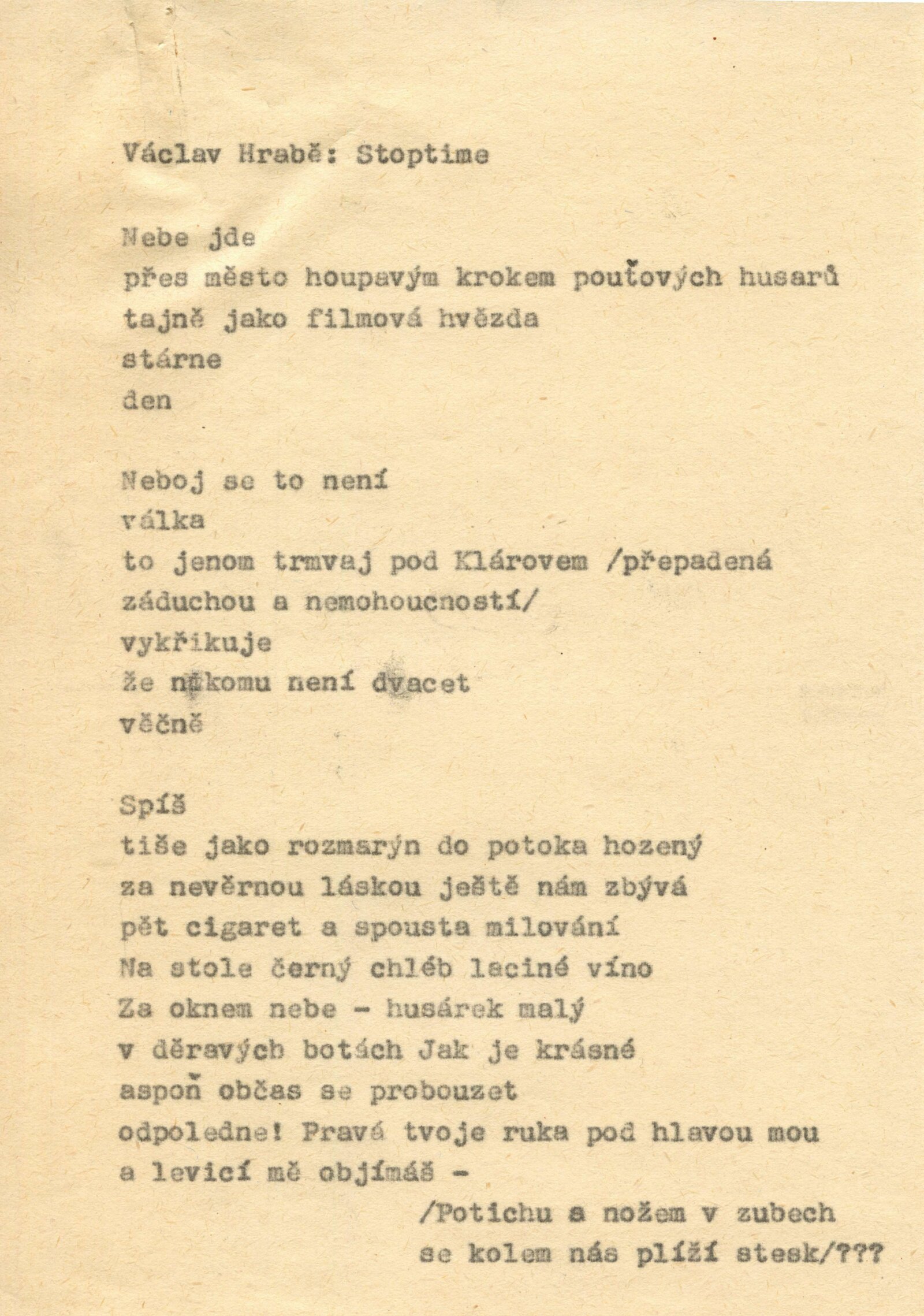 pozvánka, fotografie vernisáže, pozvánka na tiskovou konferenci, adresy zvaných, seznam vystavených děl, korespondence (návrh realizace výstavy, strojopis básní Františka Halase, Václava Hraběte a Jiřího Mahena, dopis Karly Mahenové s přiloženou dosud nepublikovanou básní Jiřího Mahena), provozní korespondence, žádost o povolení výstavy, pozvánka (PNP Praha), pozvánka na tiskovou konferece (PNP Praha), katalog (PNP Praha), program vernisáže (PNP Praha), recenze v tisk