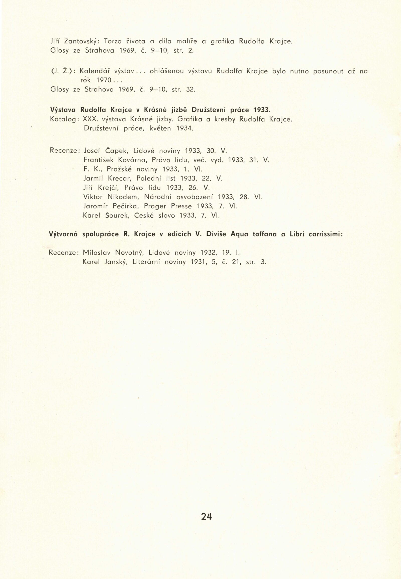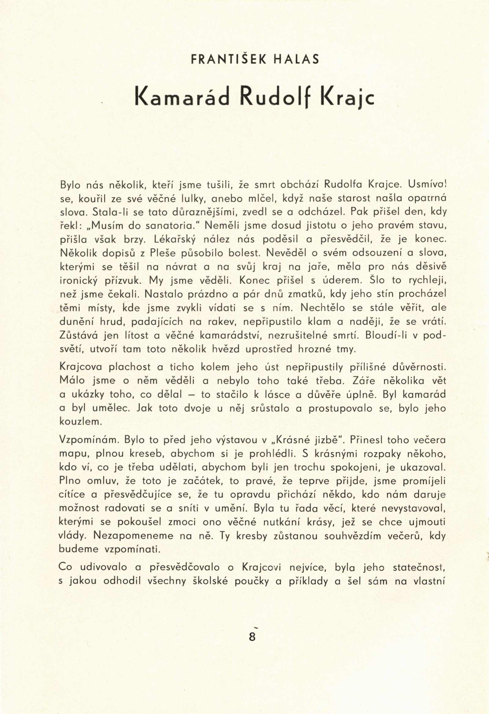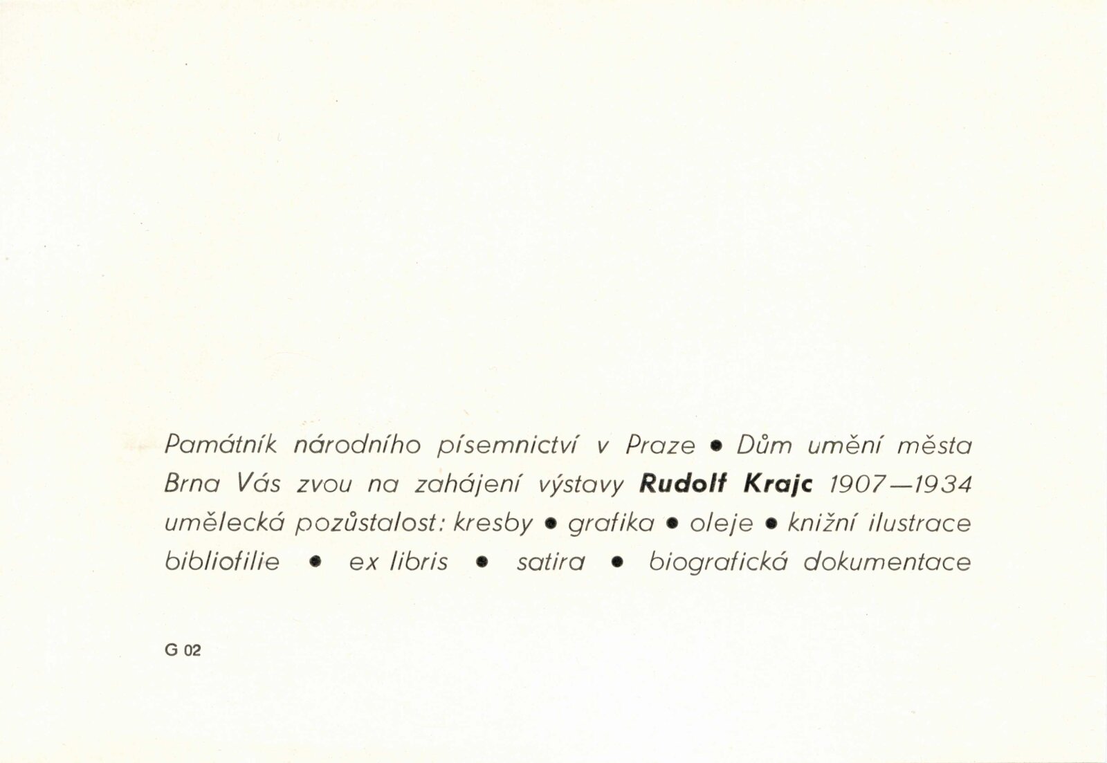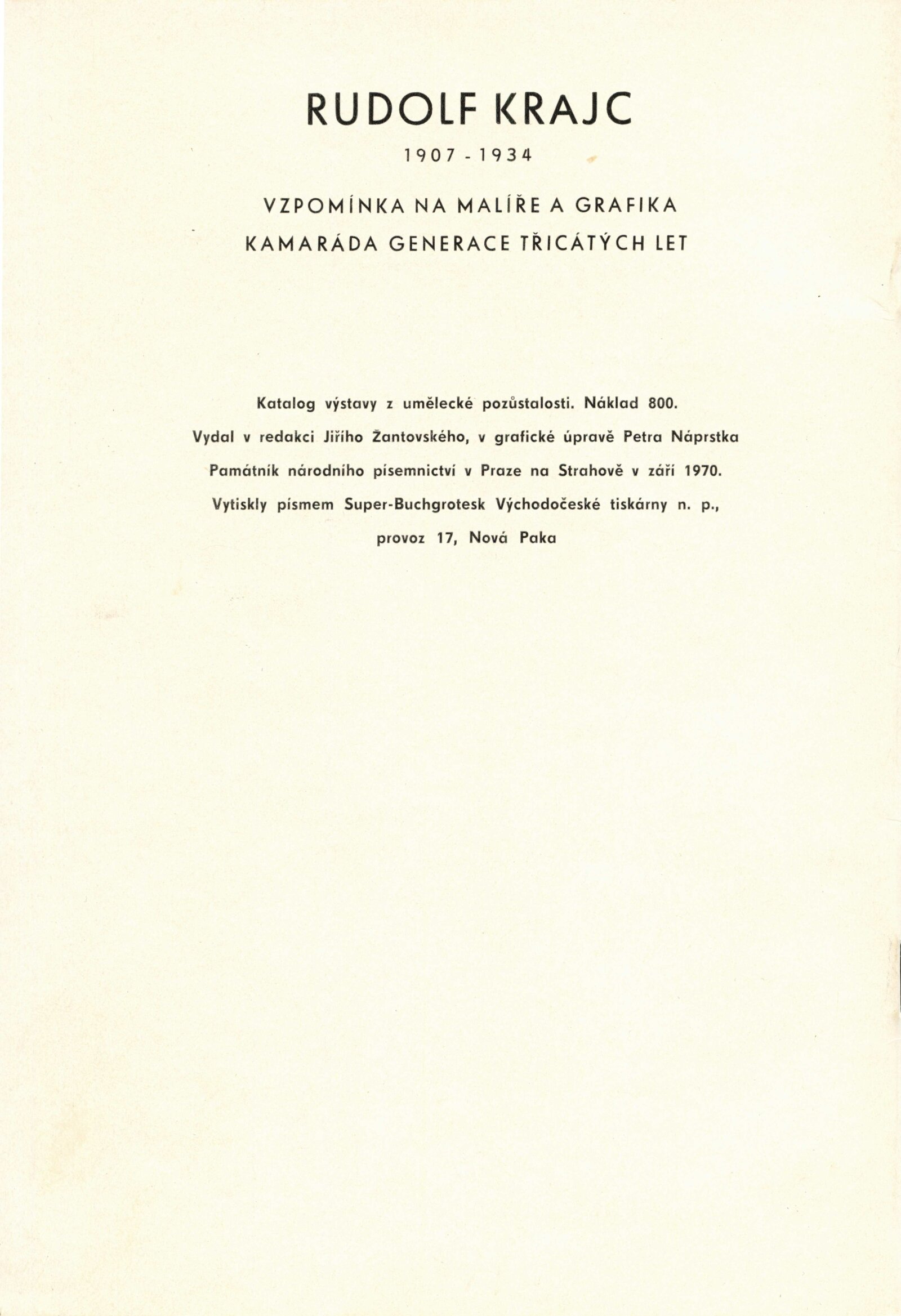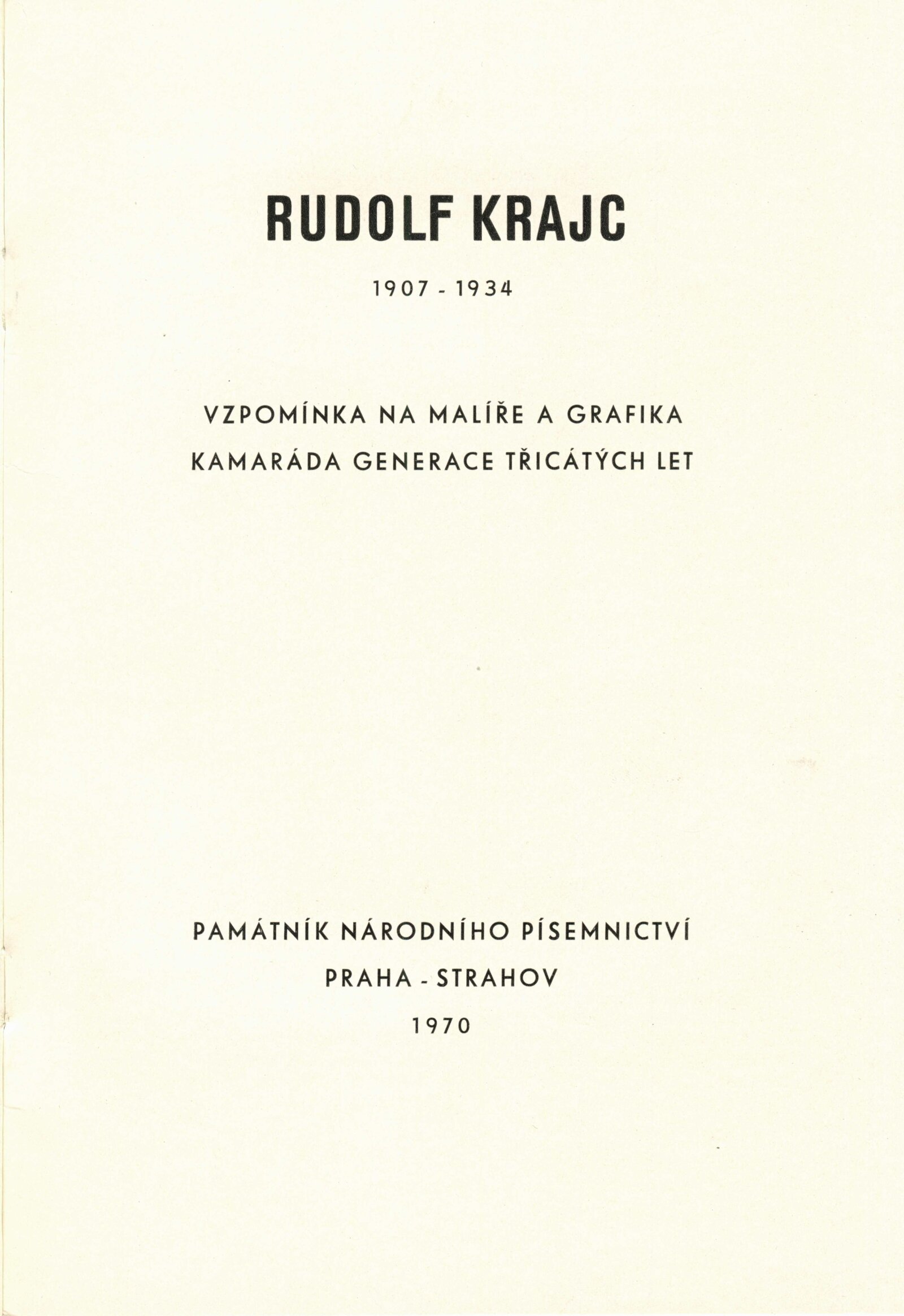 Rudolf Krajc 1907–1934. Umělecká pozůstalost. Kresby, grafika, oleje, knižní ilustrace, bibliofilie, exlibris, satira, biografická dokumentace: Dům umění města Brna / Dům pánů z Kunštátu, 4. 6. – 26. 6. 1971 / Převzatý katalog. Rudolf Krajc 1907–1934. Vzpomínka na malíře a grafika, kamaráda generace třicátých let: Strahov, Praha, září–říjen 1970 / Texty: František Halas, Jiří Žantovský, Vladimír Diviš. – Praha-Strahov: Památník národního písemnictví, 1970. – 24 s., 47 s. obr. příl., portrét, životní data, soupis knižní grafiky, bibliografie, báseň Františka Halase, DPK 473. – MG