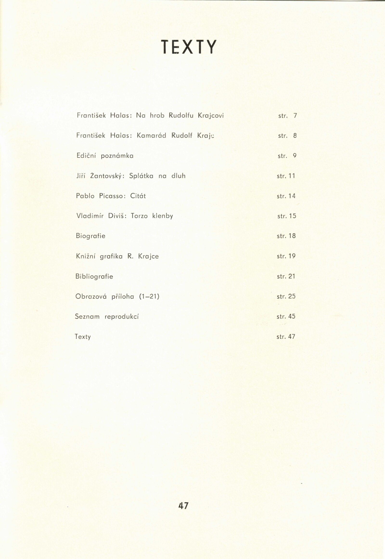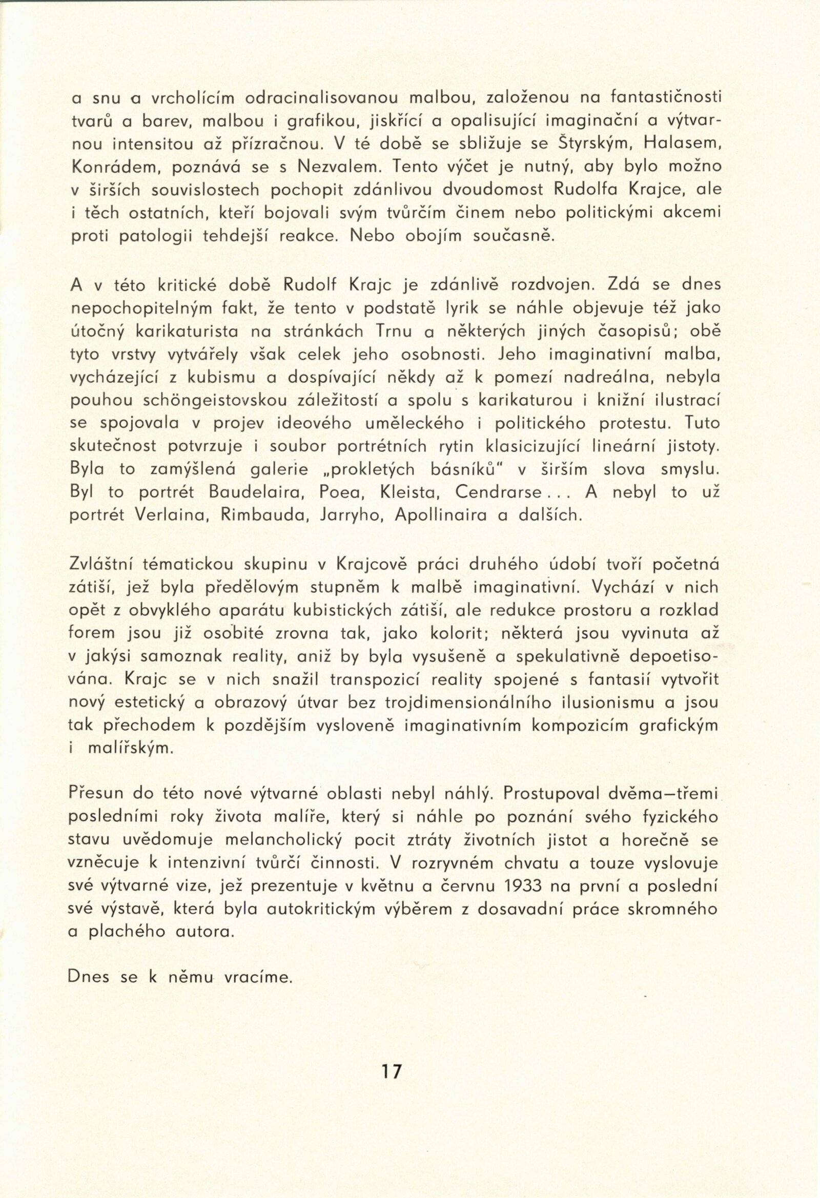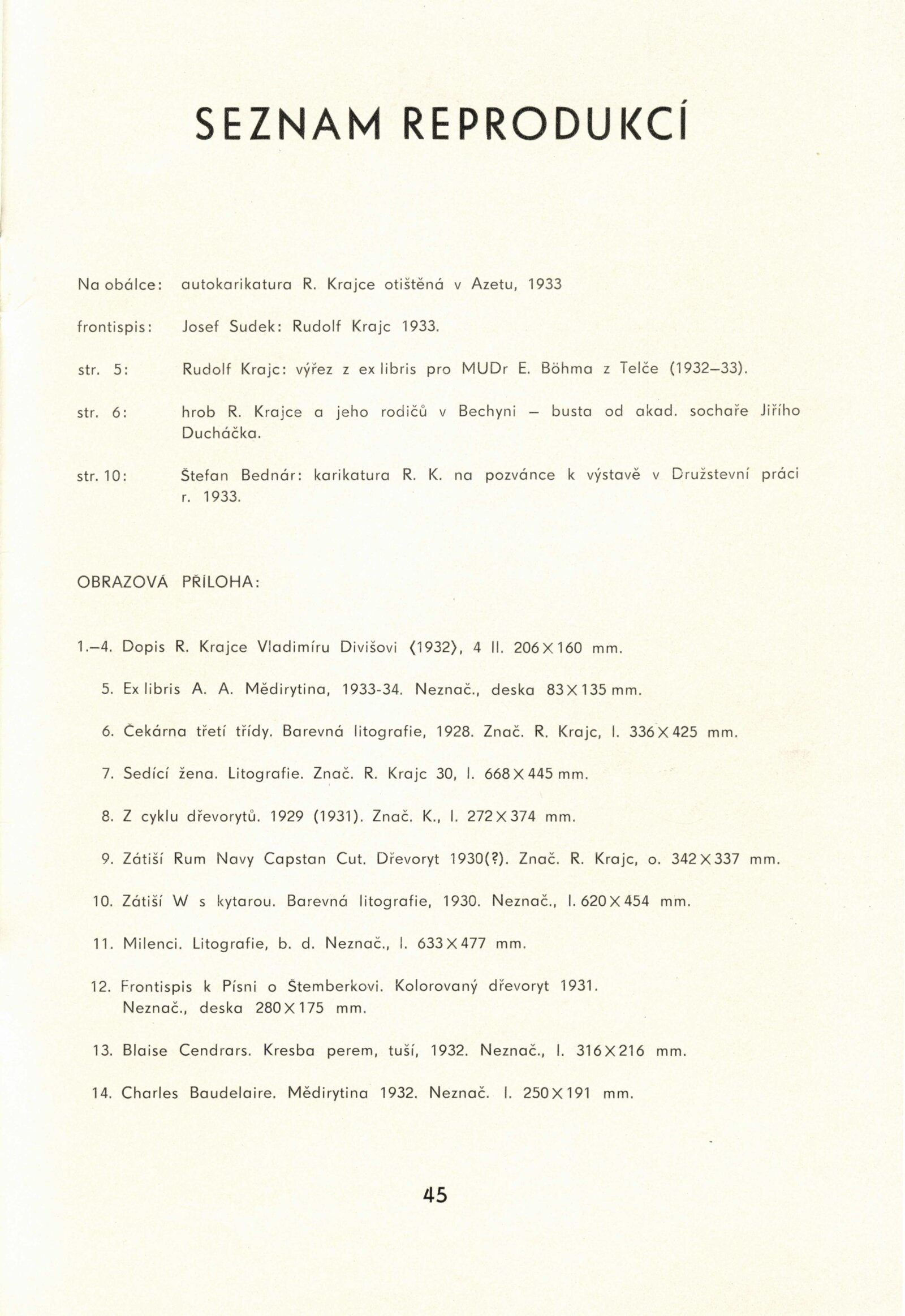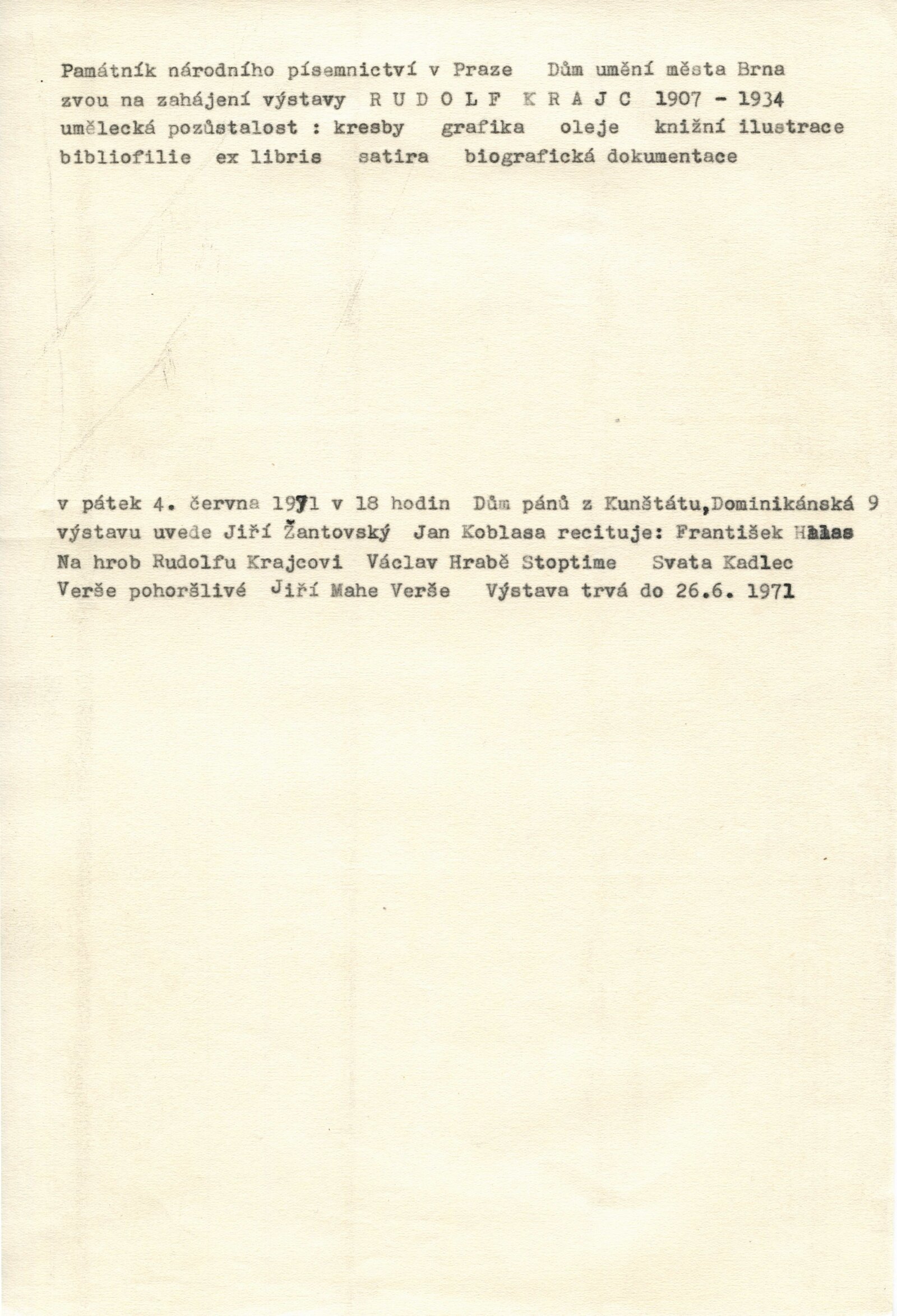 Rudolf Krajc 1907–1934. Umělecká pozůstalost. Kresby, grafika, oleje, knižní ilustrace, bibliofilie, exlibris, satira, biografická dokumentace: Dům umění města Brna / Dům pánů z Kunštátu, 4. 6. – 26. 6. 1971 / Převzatý katalog. Rudolf Krajc 1907–1934. Vzpomínka na malíře a grafika, kamaráda generace třicátých let: Strahov, Praha, září–říjen 1970 / Texty: František Halas, Jiří Žantovský, Vladimír Diviš. – Praha-Strahov: Památník národního písemnictví, 1970. – 24 s., 47 s. obr. příl., portrét, životní data, soupis knižní grafiky, bibliografie, báseň Františka Halase, DPK 473. – MG
