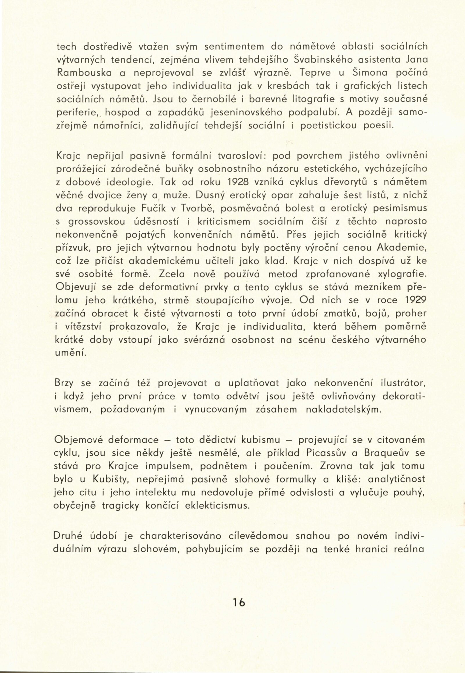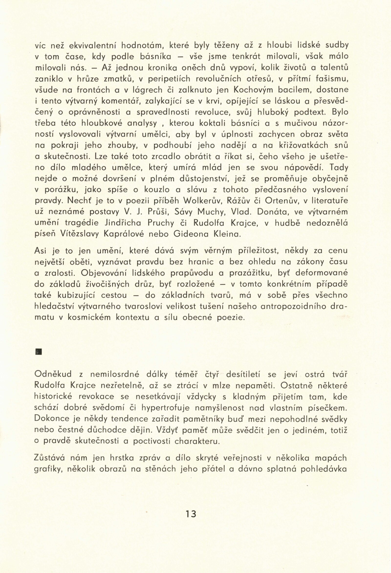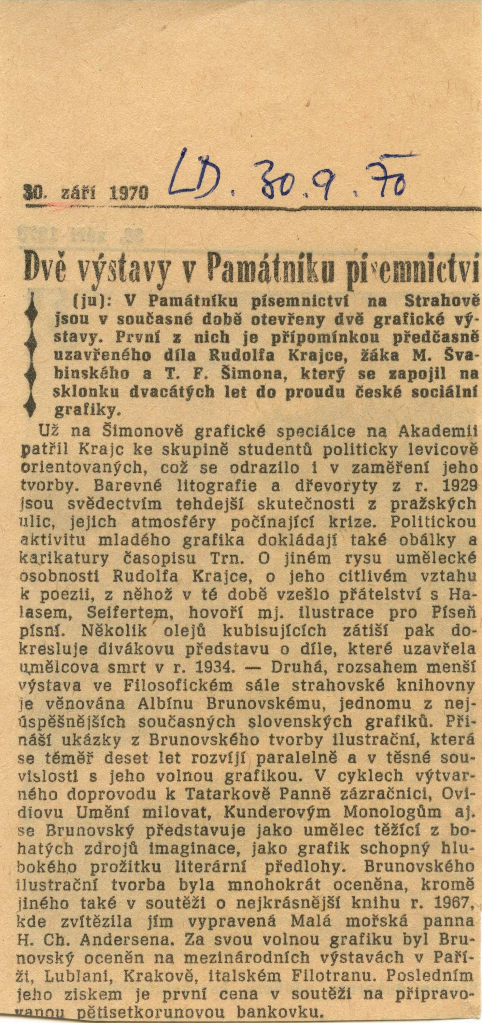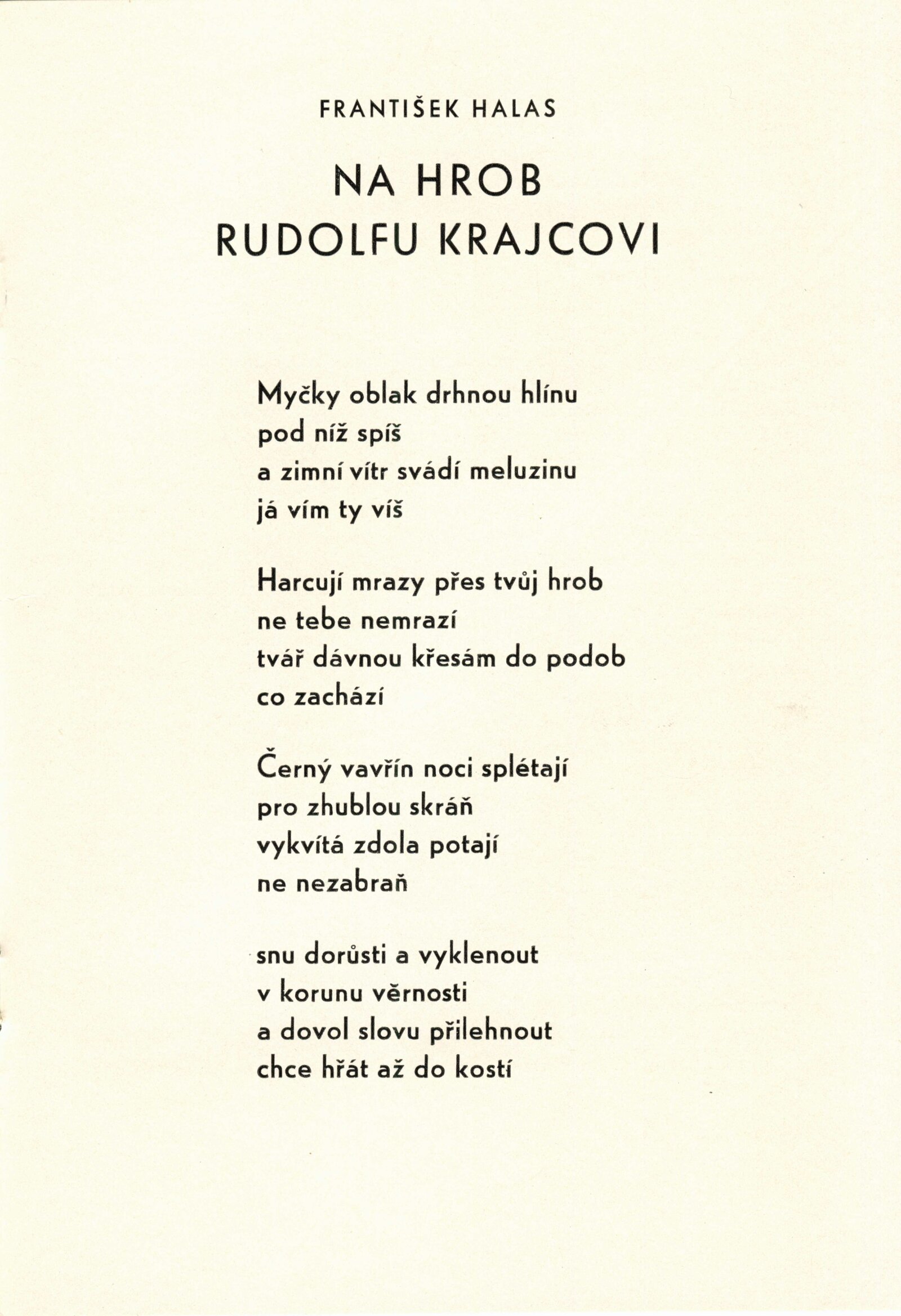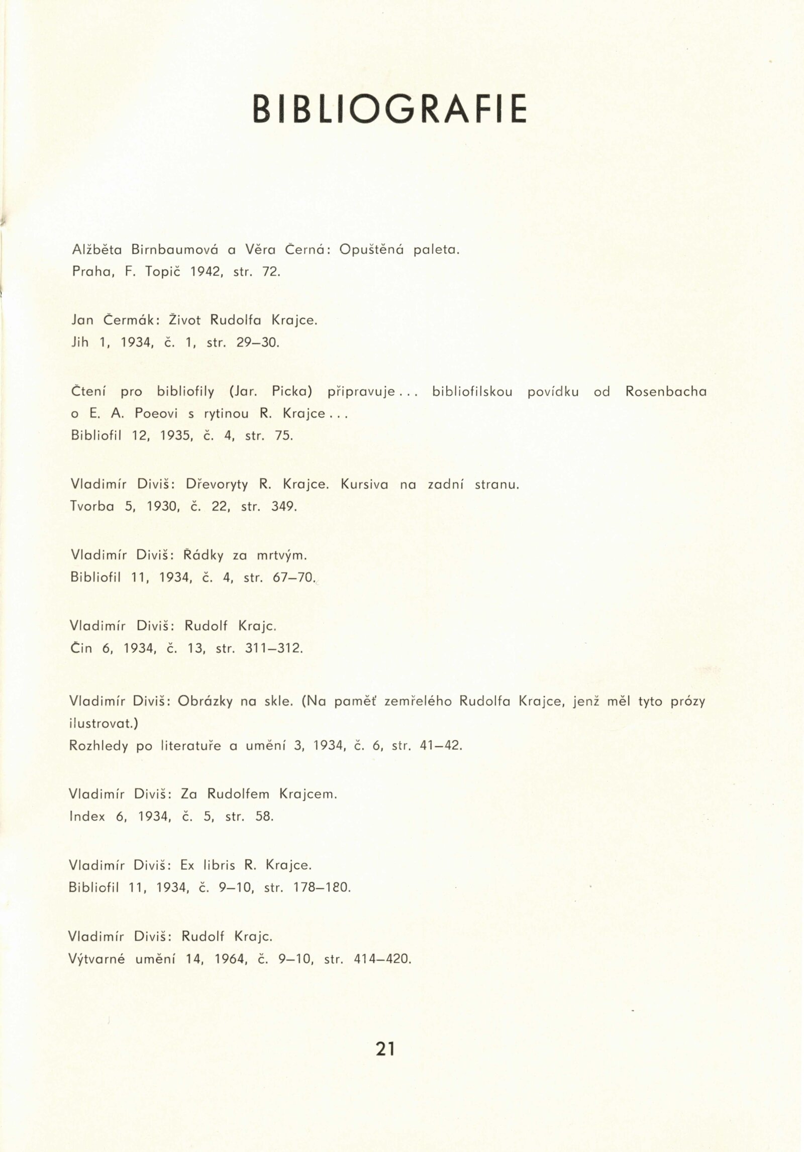Rudolf Krajc 1907–1934. Umělecká pozůstalost. Kresby, grafika, oleje, knižní ilustrace, bibliofilie, exlibris, satira, biografická dokumentace: Dům umění města Brna / Dům pánů z Kunštátu, 4. 6. – 26. 6. 1971 / Převzatý katalog. Rudolf Krajc 1907–1934. Vzpomínka na malíře a grafika, kamaráda generace třicátých let: Strahov, Praha, září–říjen 1970 / Texty: František Halas, Jiří Žantovský, Vladimír Diviš. – Praha-Strahov: Památník národního písemnictví, 1970. – 24 s., 47 s. obr. příl., portrét, životní data, soupis knižní grafiky, bibliografie, báseň Františka Halase, DPK 473. – MG