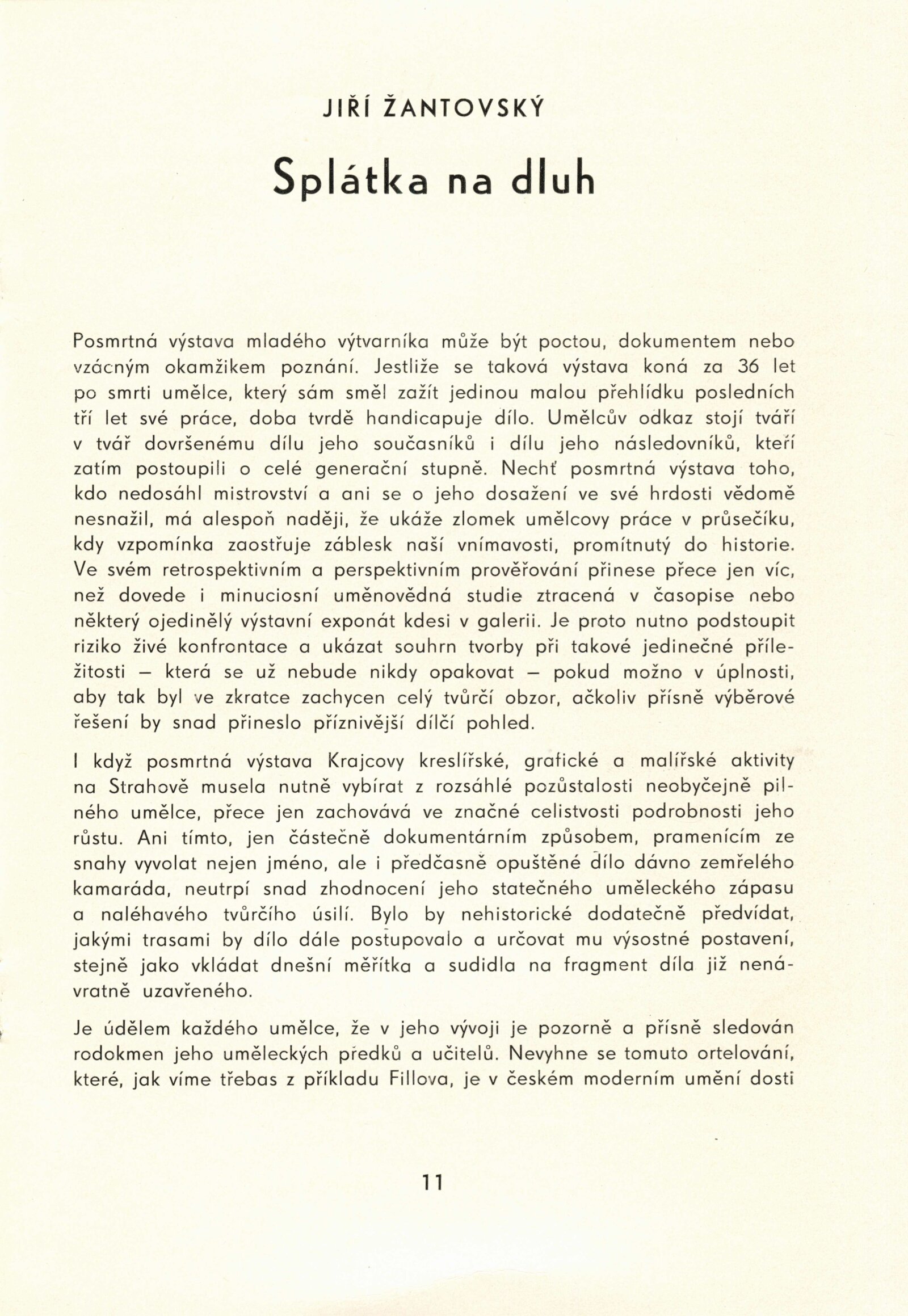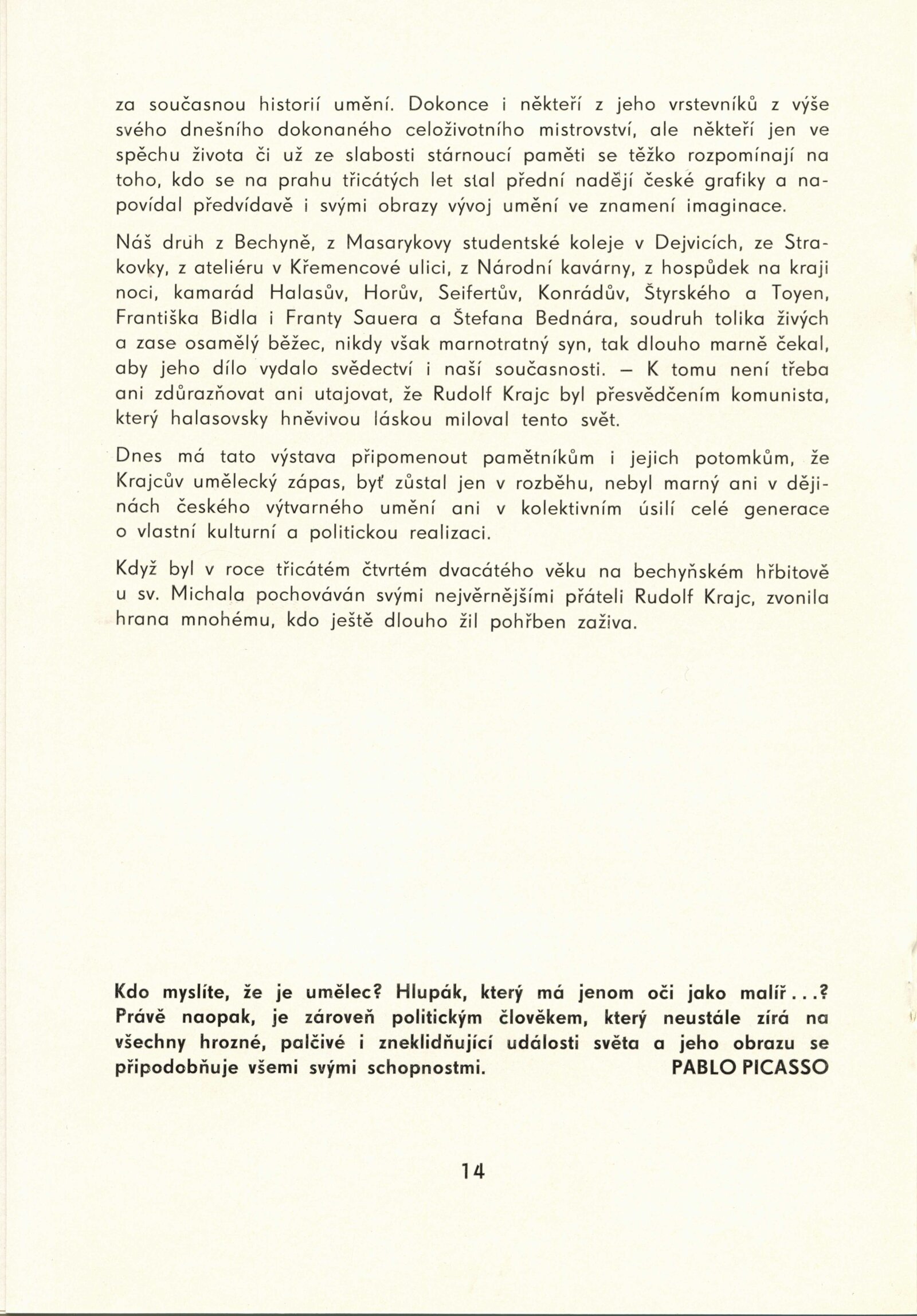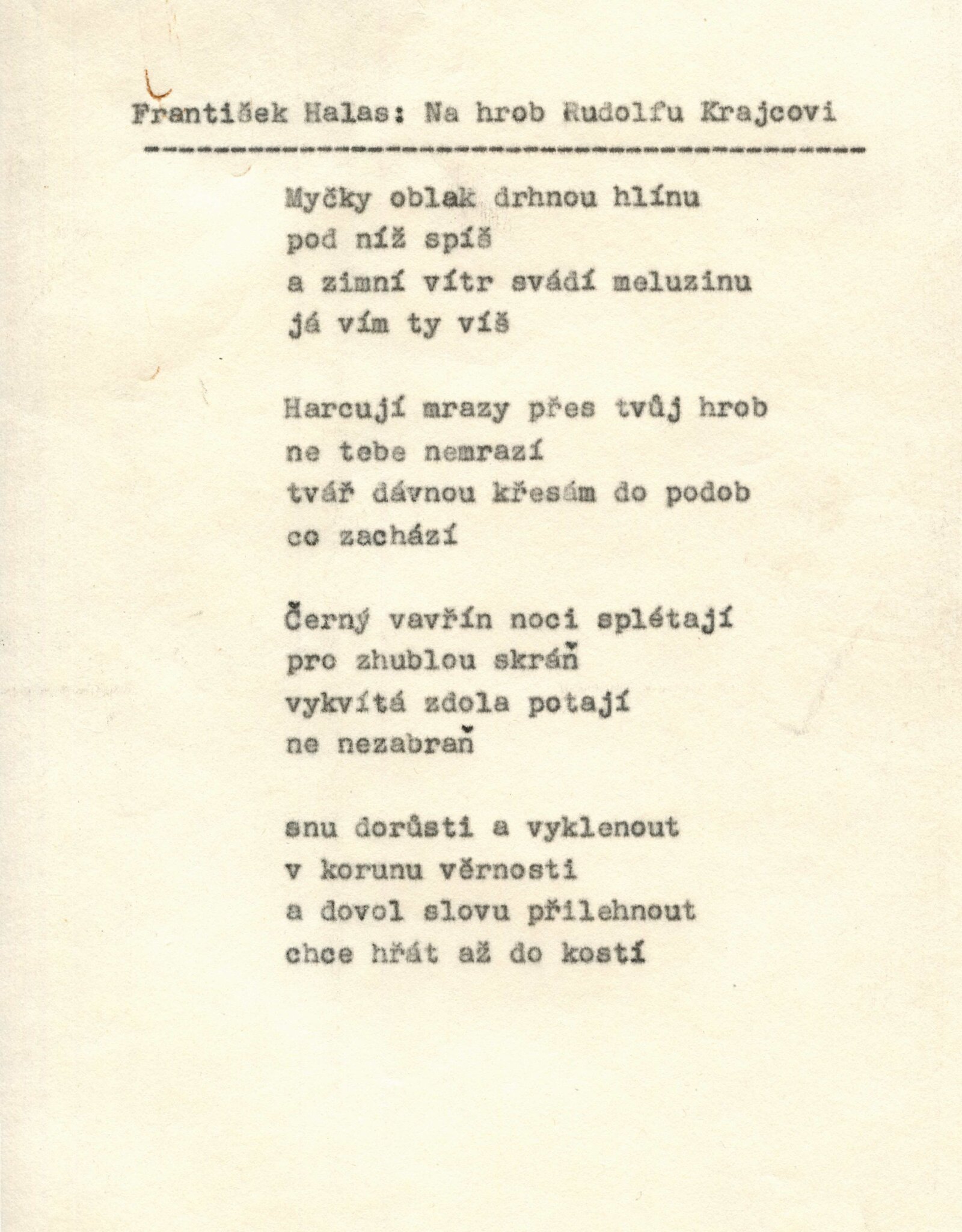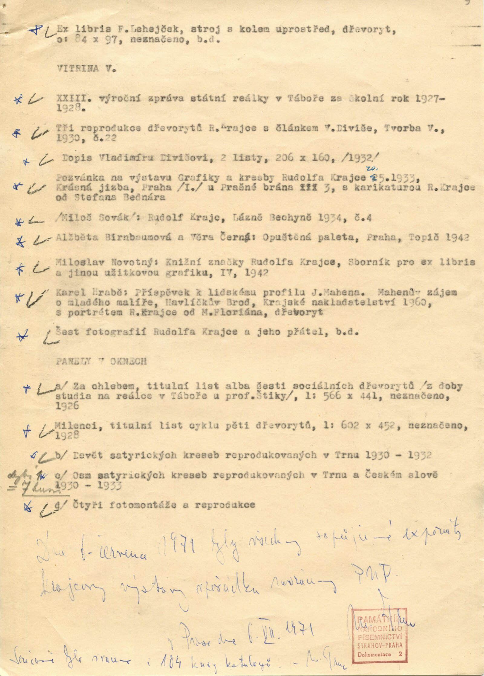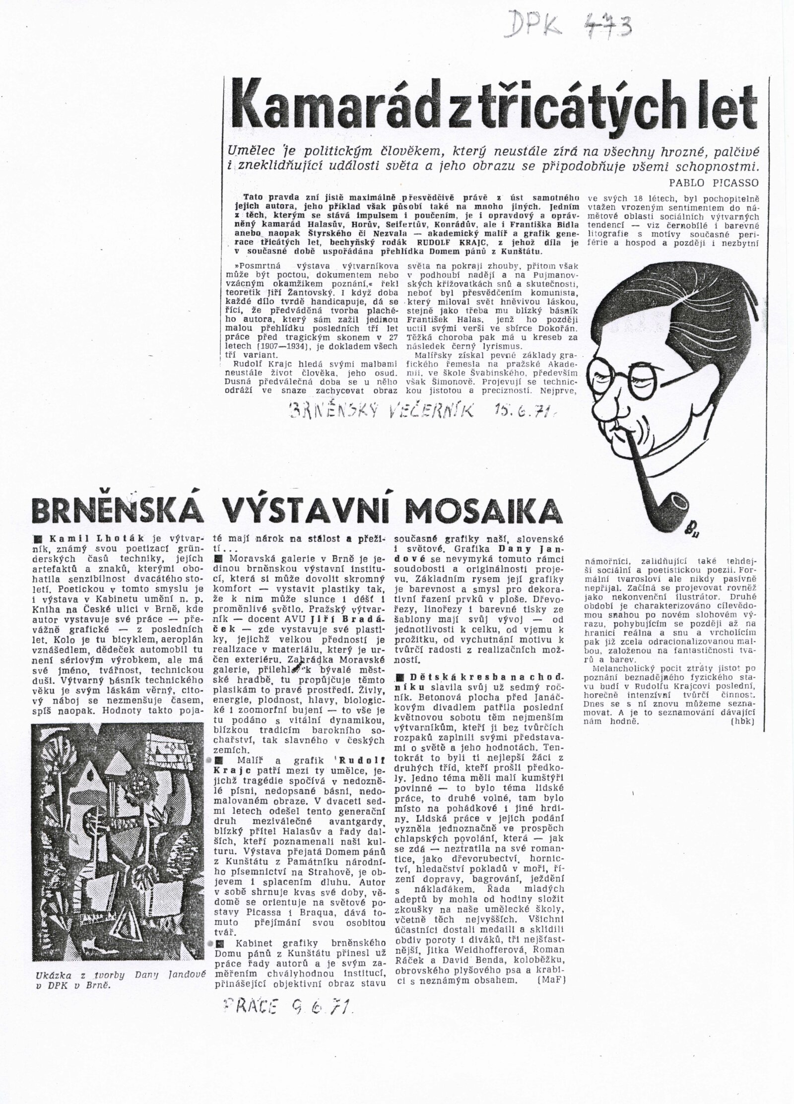 Rudolf Krajc 1907–1934. Umělecká pozůstalost. Kresby, grafika, oleje, knižní ilustrace, bibliofilie, exlibris, satira, biografická dokumentace: Dům umění města Brna / Dům pánů z Kunštátu, 4. 6. – 26. 6. 1971 / Převzatý katalog. Rudolf Krajc 1907–1934. Vzpomínka na malíře a grafika, kamaráda generace třicátých let: Strahov, Praha, září–říjen 1970 / Texty: František Halas, Jiří Žantovský, Vladimír Diviš. – Praha-Strahov: Památník národního písemnictví, 1970. – 24 s., 47 s. obr. příl., portrét, životní data, soupis knižní grafiky, bibliografie, báseň Františka Halase, DPK 473. – MG