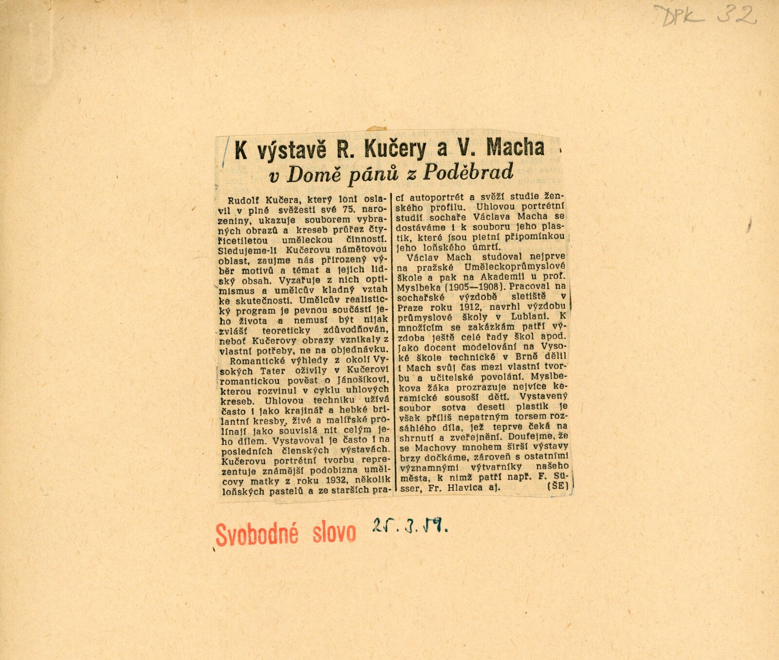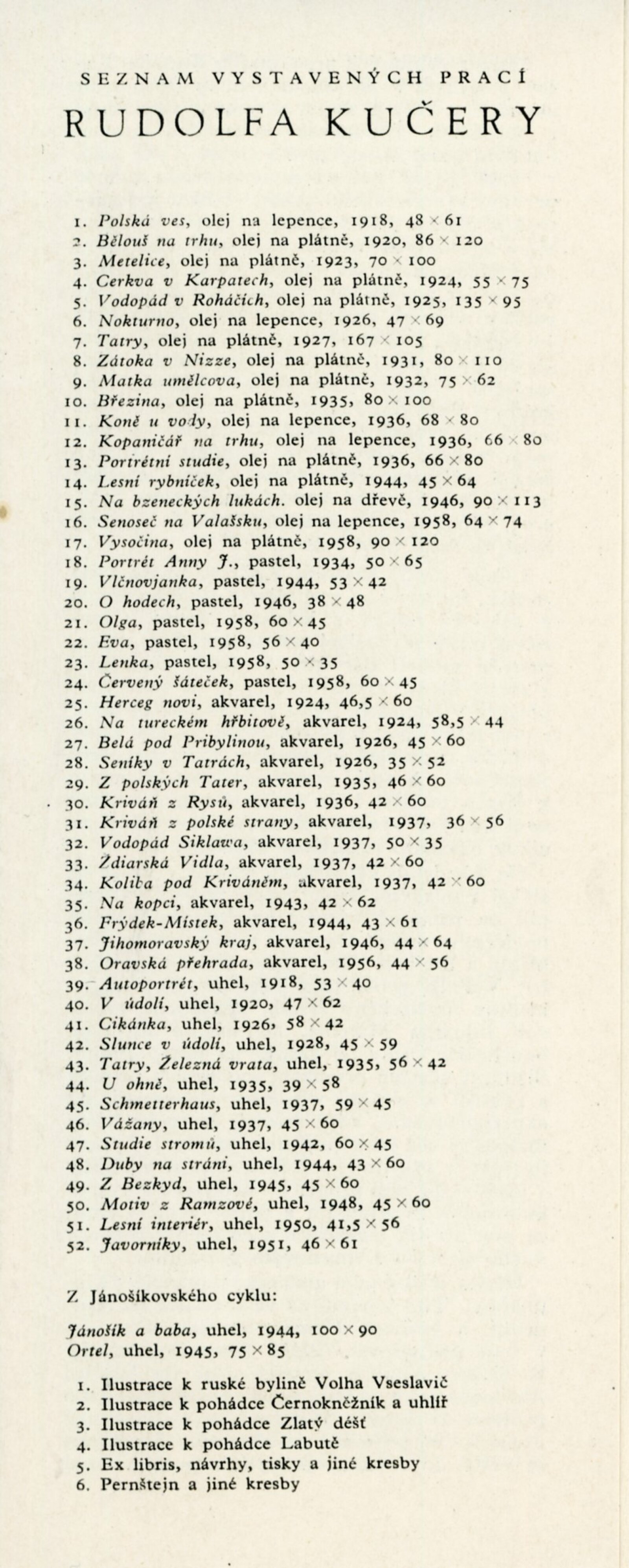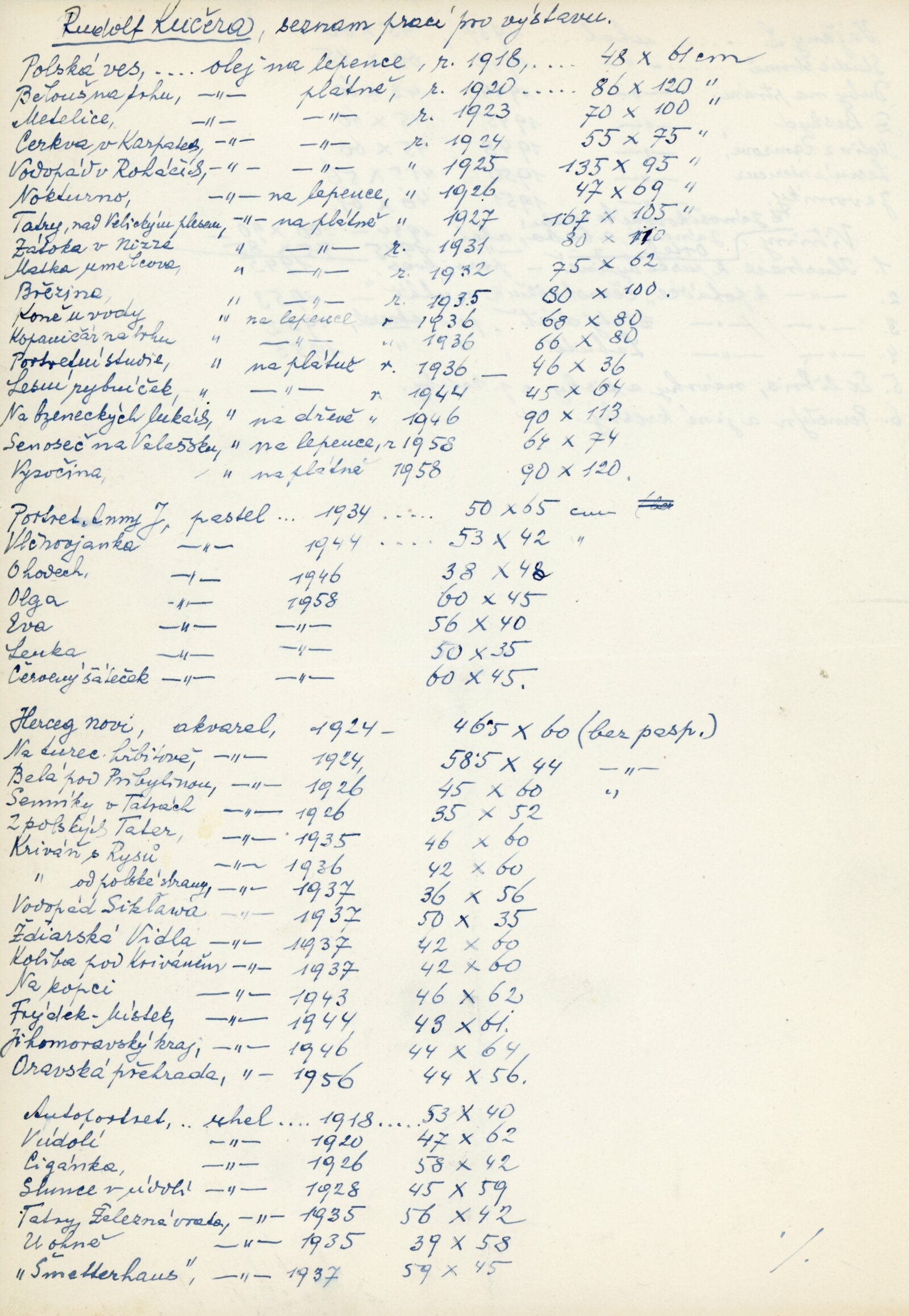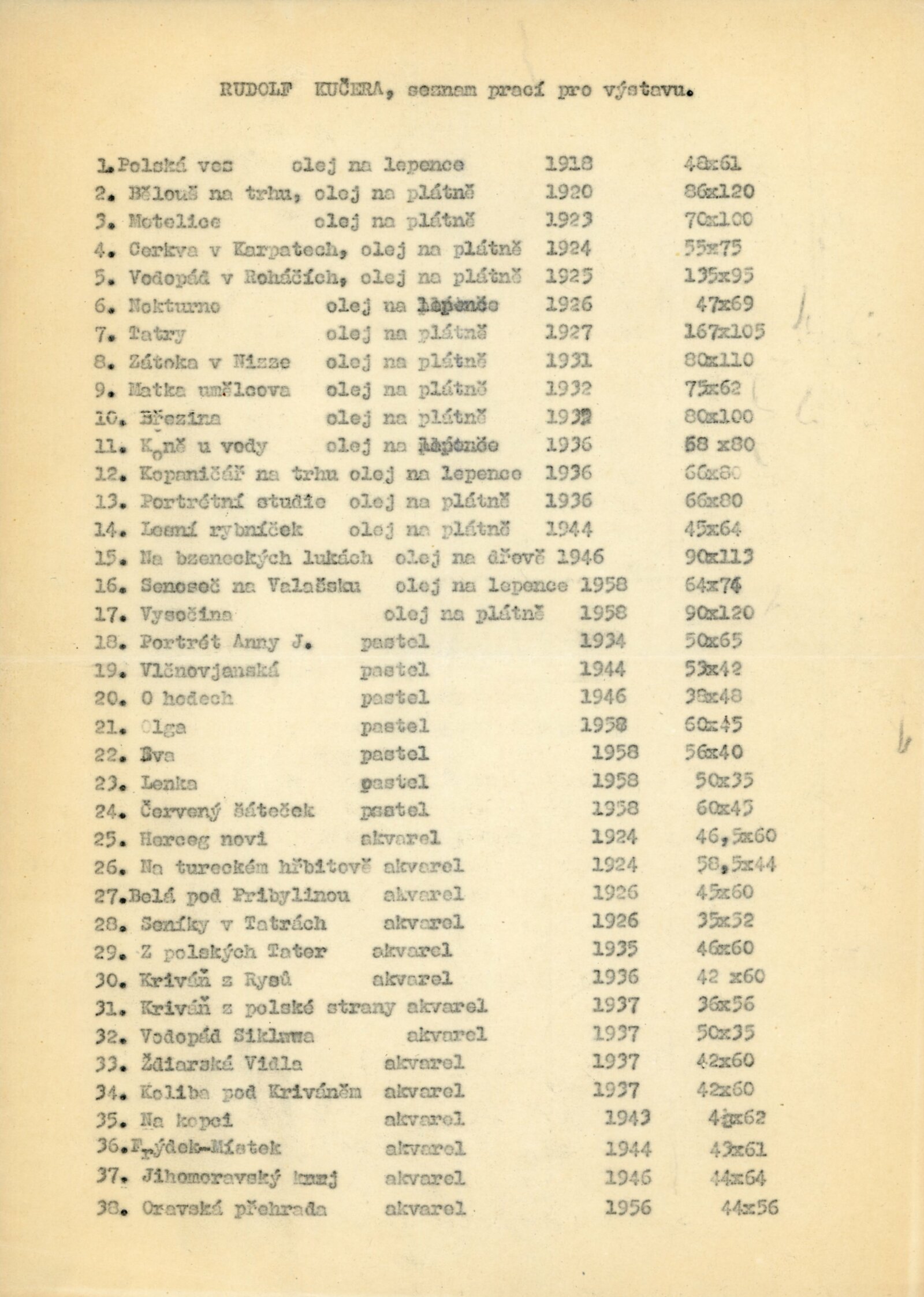 pozvánka, katalog, seznam vystavených děl, strojopis textu ke katalogu, fotografie pro katalog, korespondence (Rudolf Kučera, J. B. Svrček, L. Machová – recenze), výpůjční reverzy, zprávy a recenze v tisku
