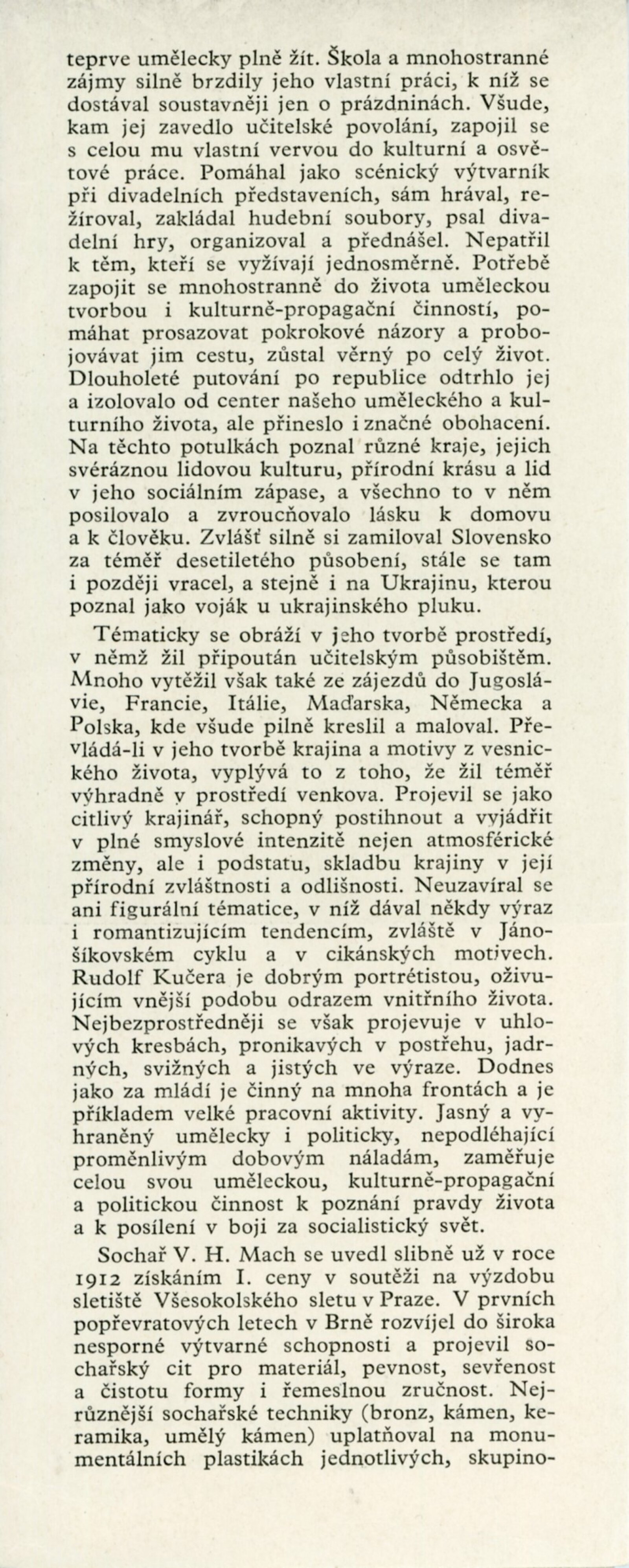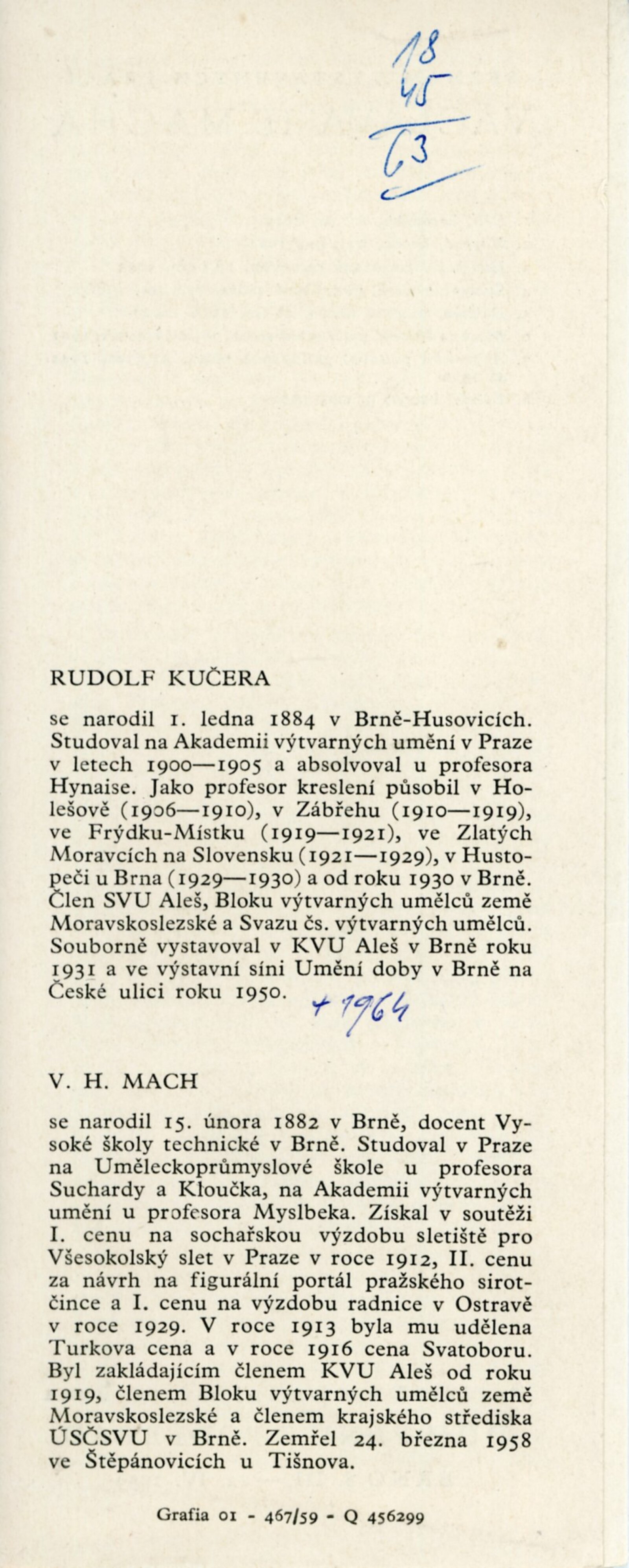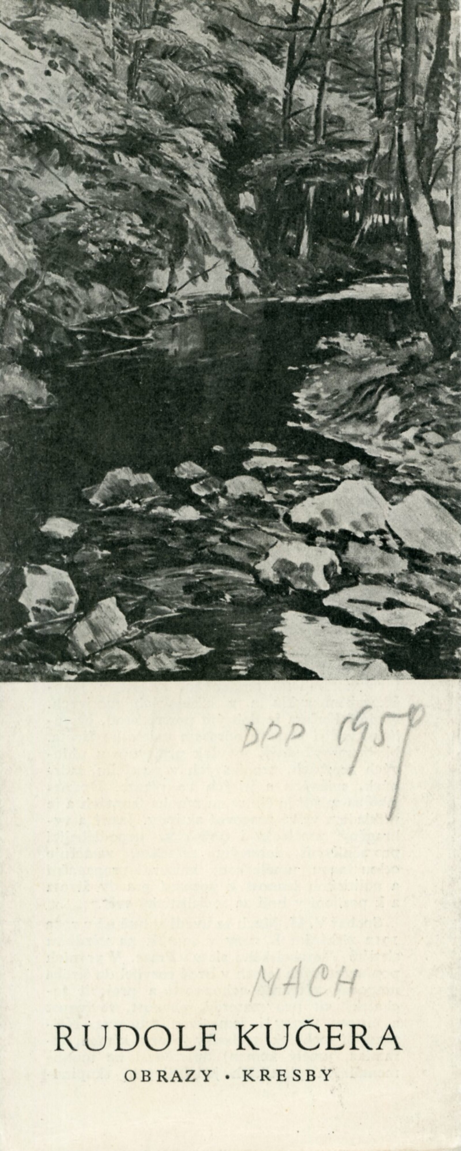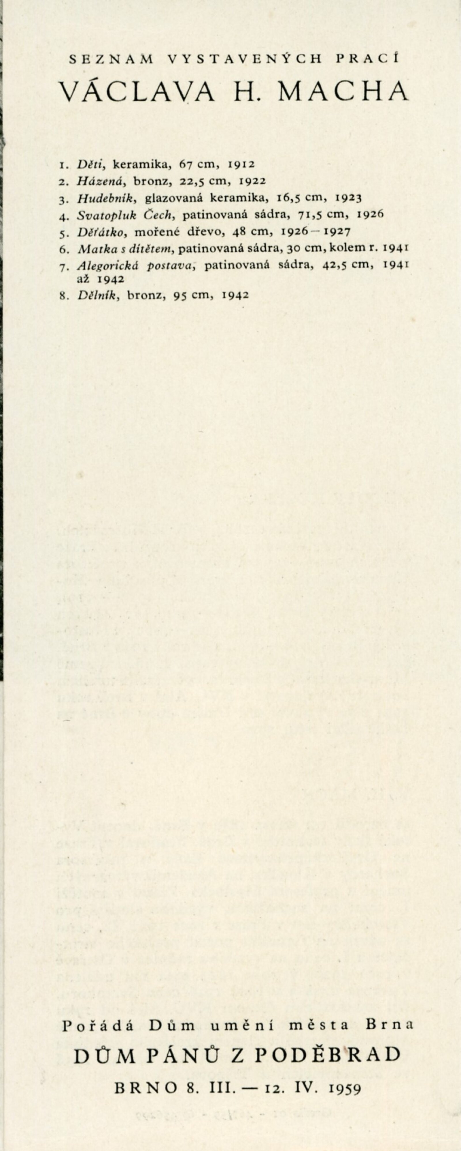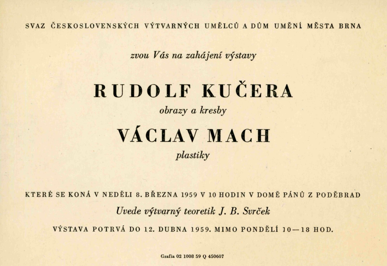 Rudolf Kučera. Obrazy, kresby. Václav H.Mach. Plastiky: Dům umění města Brna / Dům pánů z Poděbrad, 8. 3. – 12. 4.1959 / Text: J. B. Svrček. – Brno: DUmB, 1959. – skládačka, 8 s., obr., životopisy, DPK 32.– MZK; MG