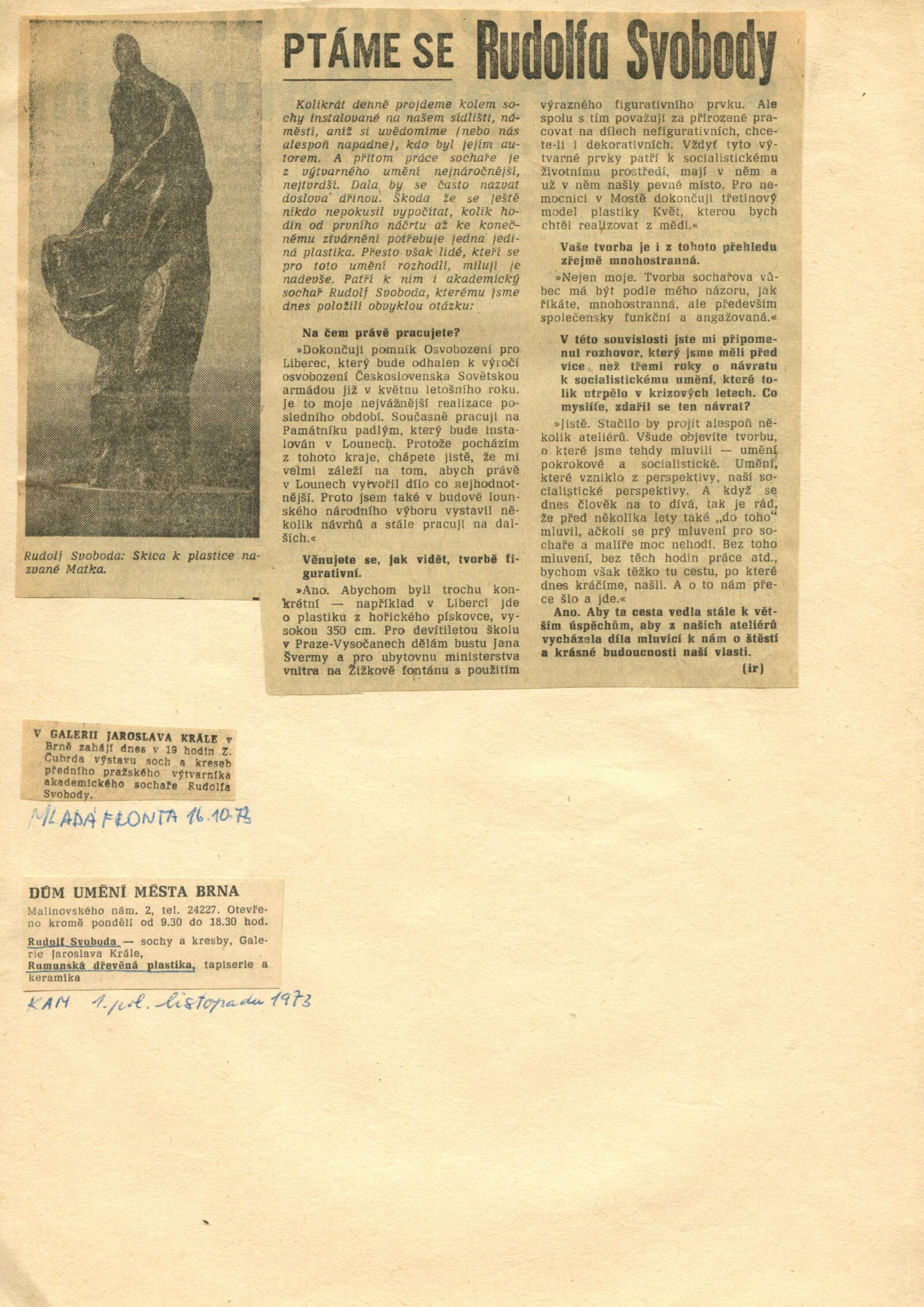 Rudolf Svoboda. Sochy a kresby: Dům umění, 55. výstava v Galerii Jaroslava Krále, 16. 10. – 18. 11. 1973 / Text: Zdeněk Čubrda. – Brno: ČFVU, 1973. – 14 s., obr., seznam vystavených prací 2 s., portrét, životní data, výstavy, ceny, realizace v architektuře, DU 598. – MZK