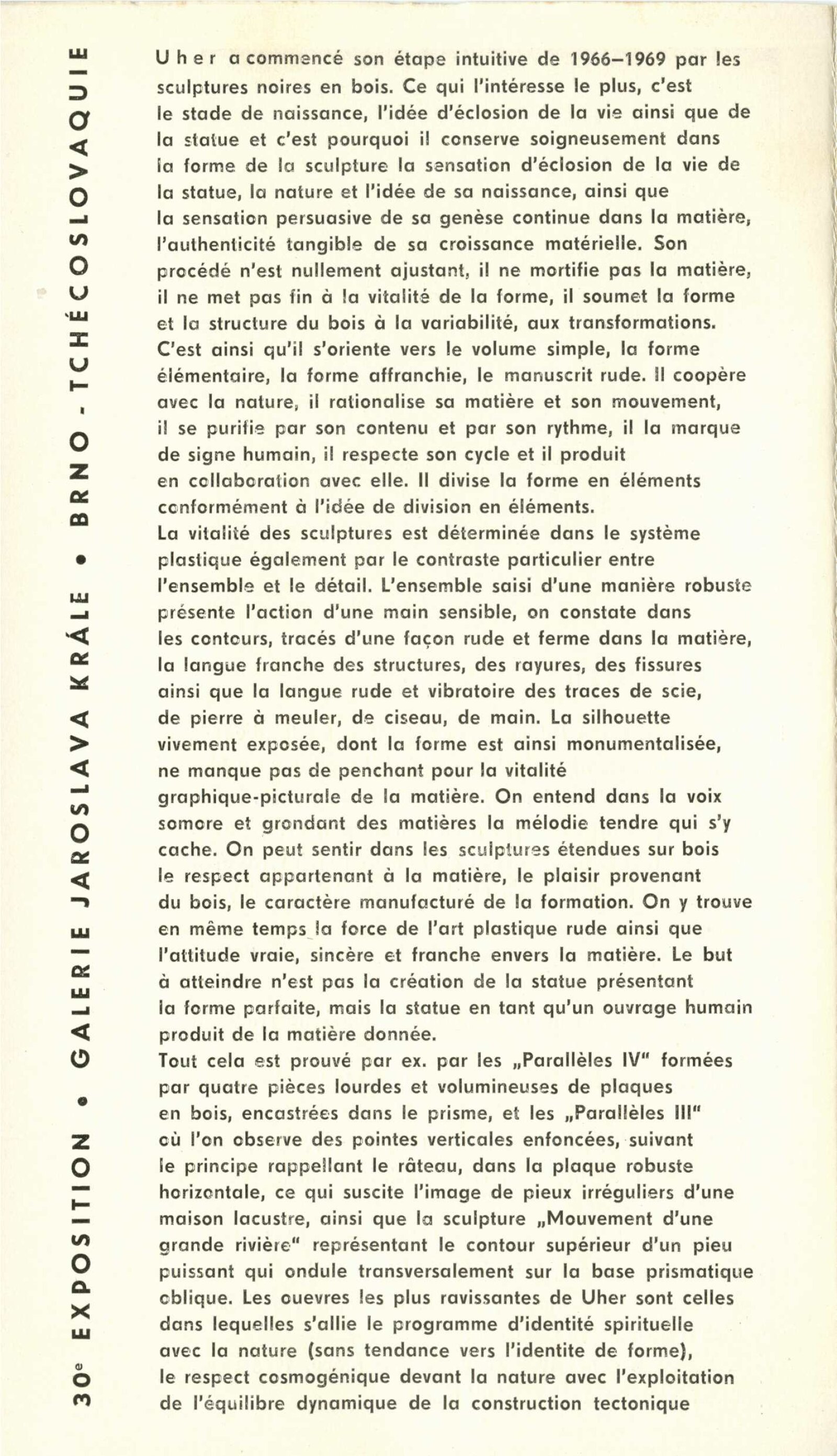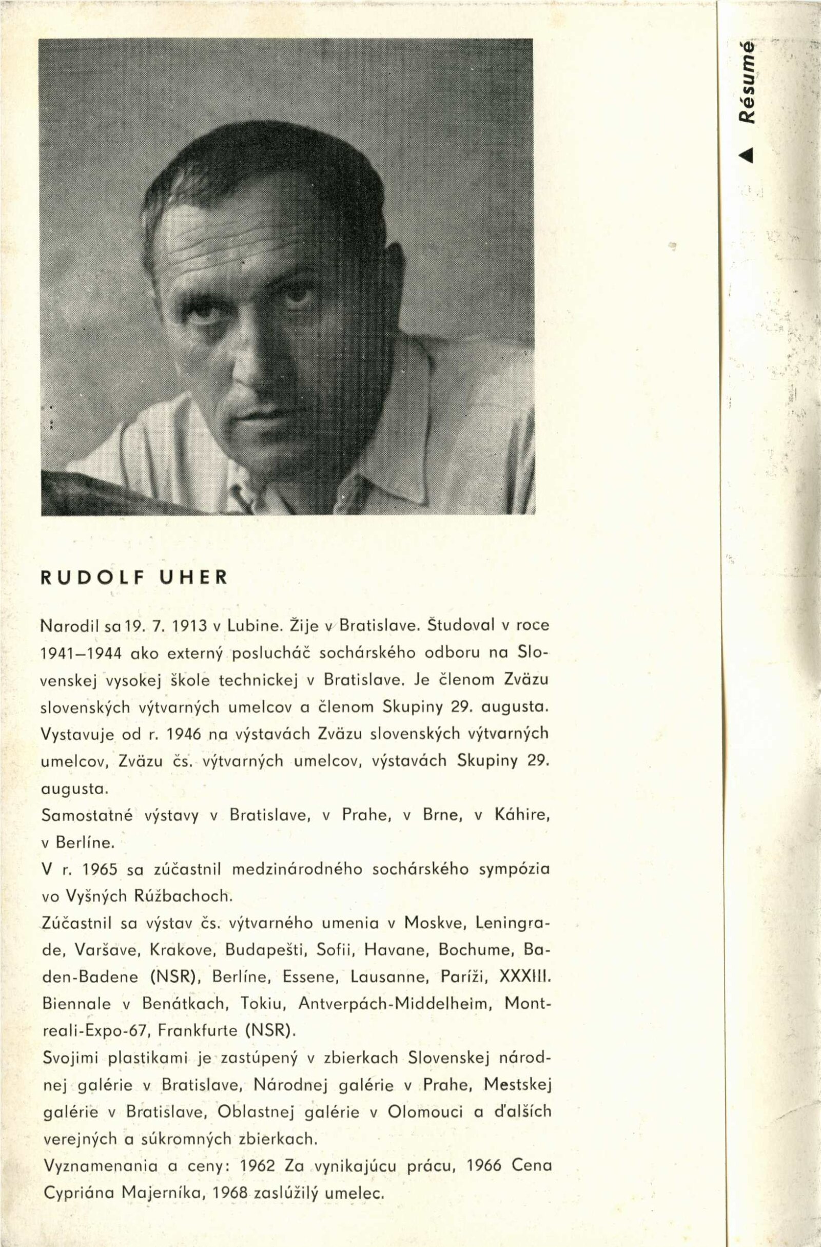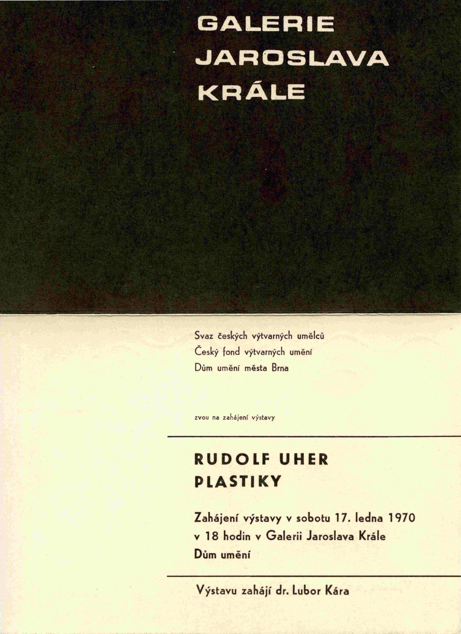 Rudolf Uher. Plastiky: Dům umění, 30. výstava v Galerii Jaroslava Krále, 17. 1. 1970 – 22. 2. 1970 / Text: Lubor Kára. – Brno: ČFVU, 1970. – 10 s., obr., portrét, životopis, DU 540. – MZK; MG; MMB