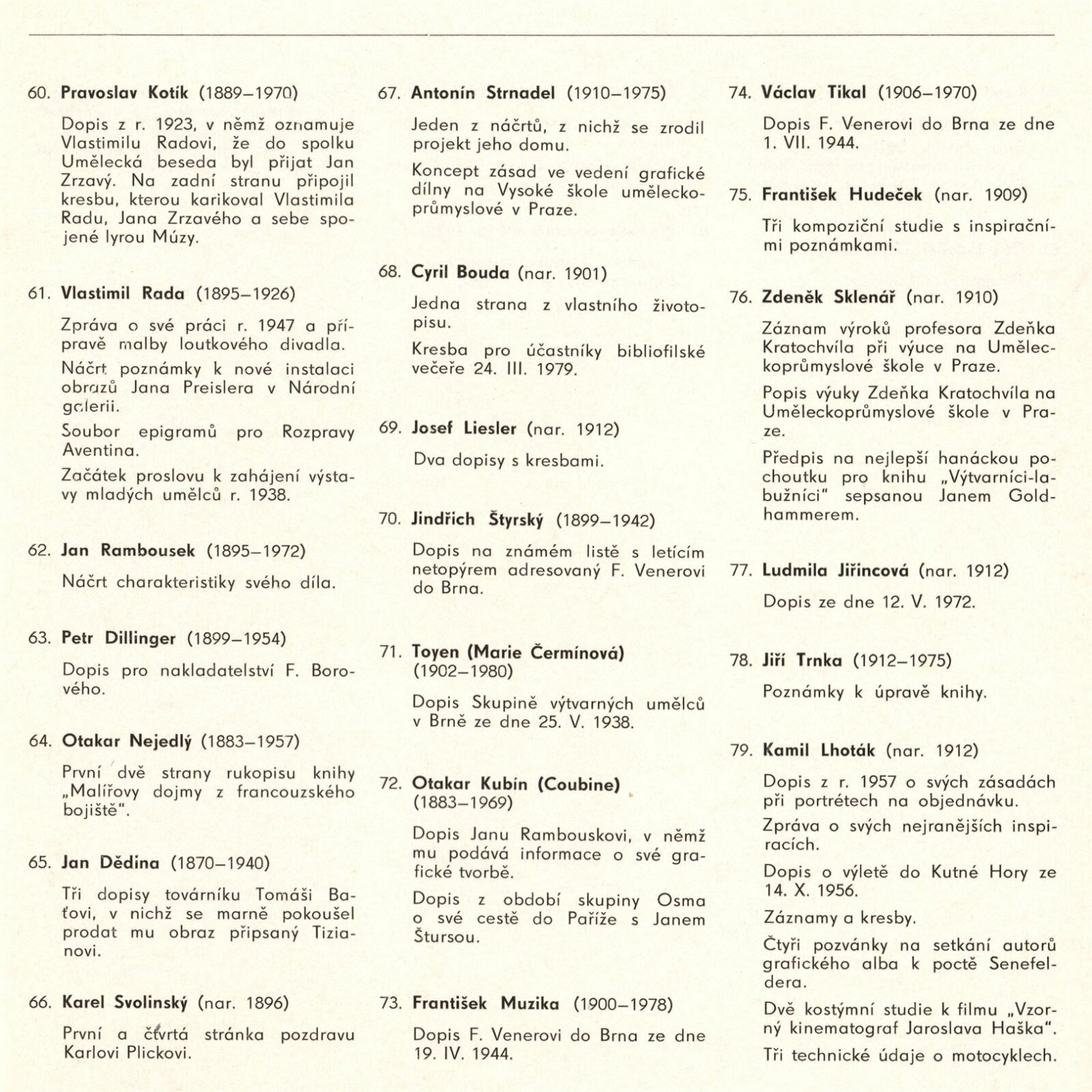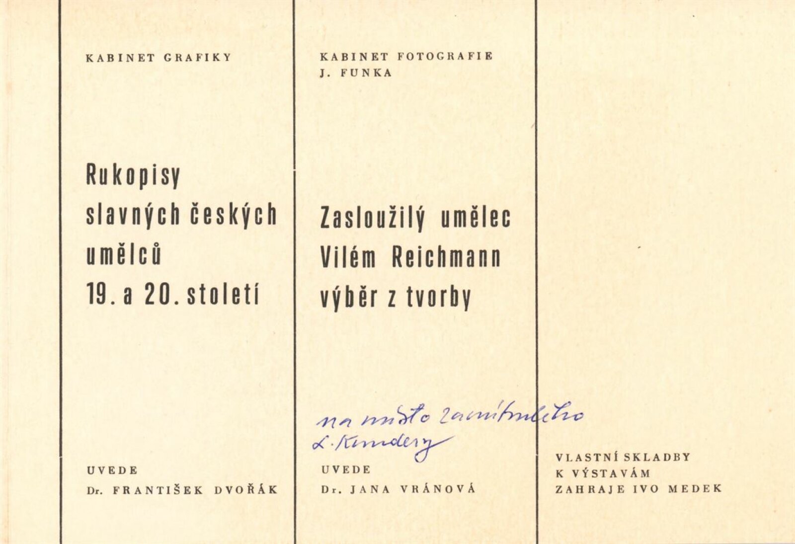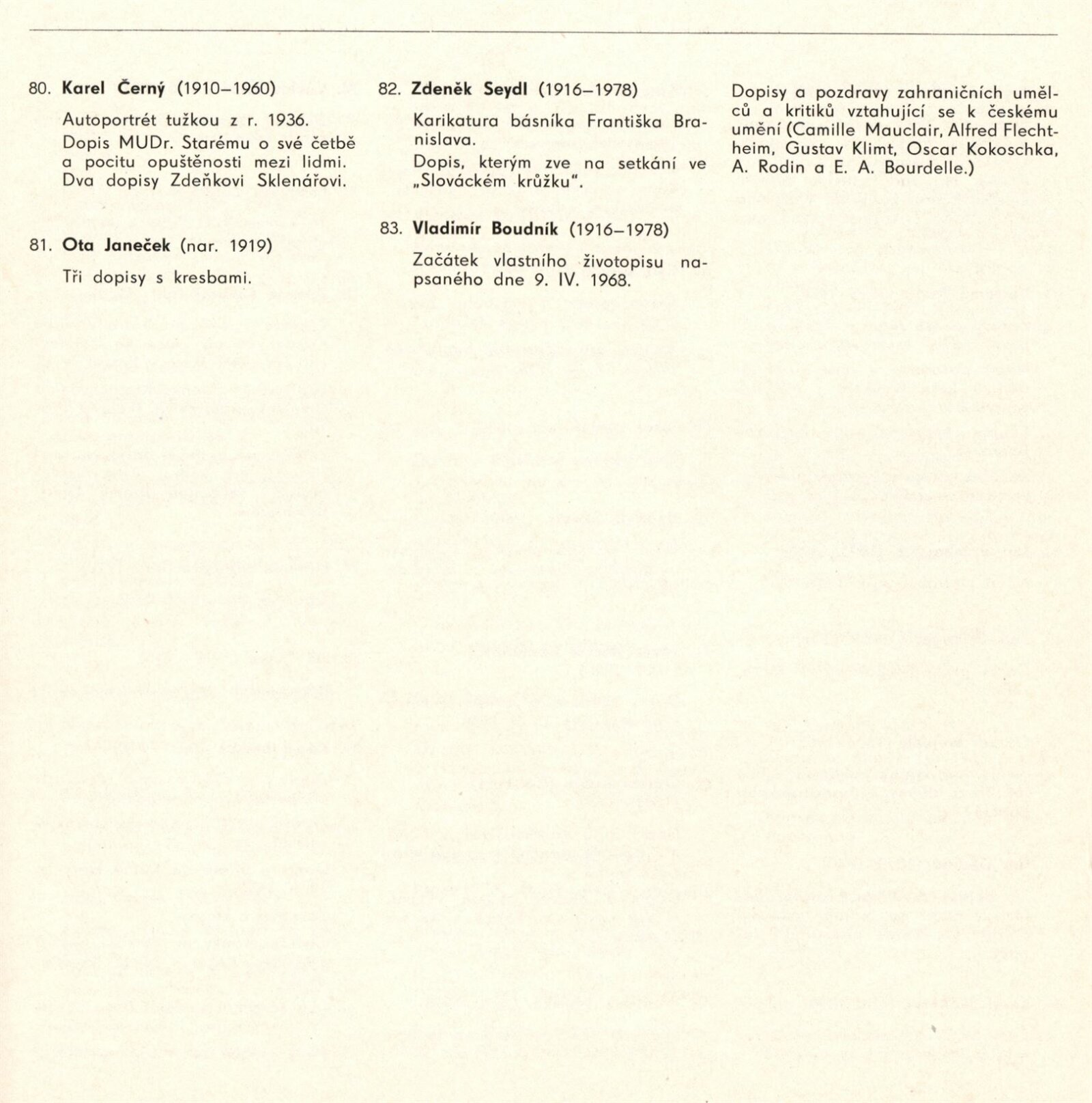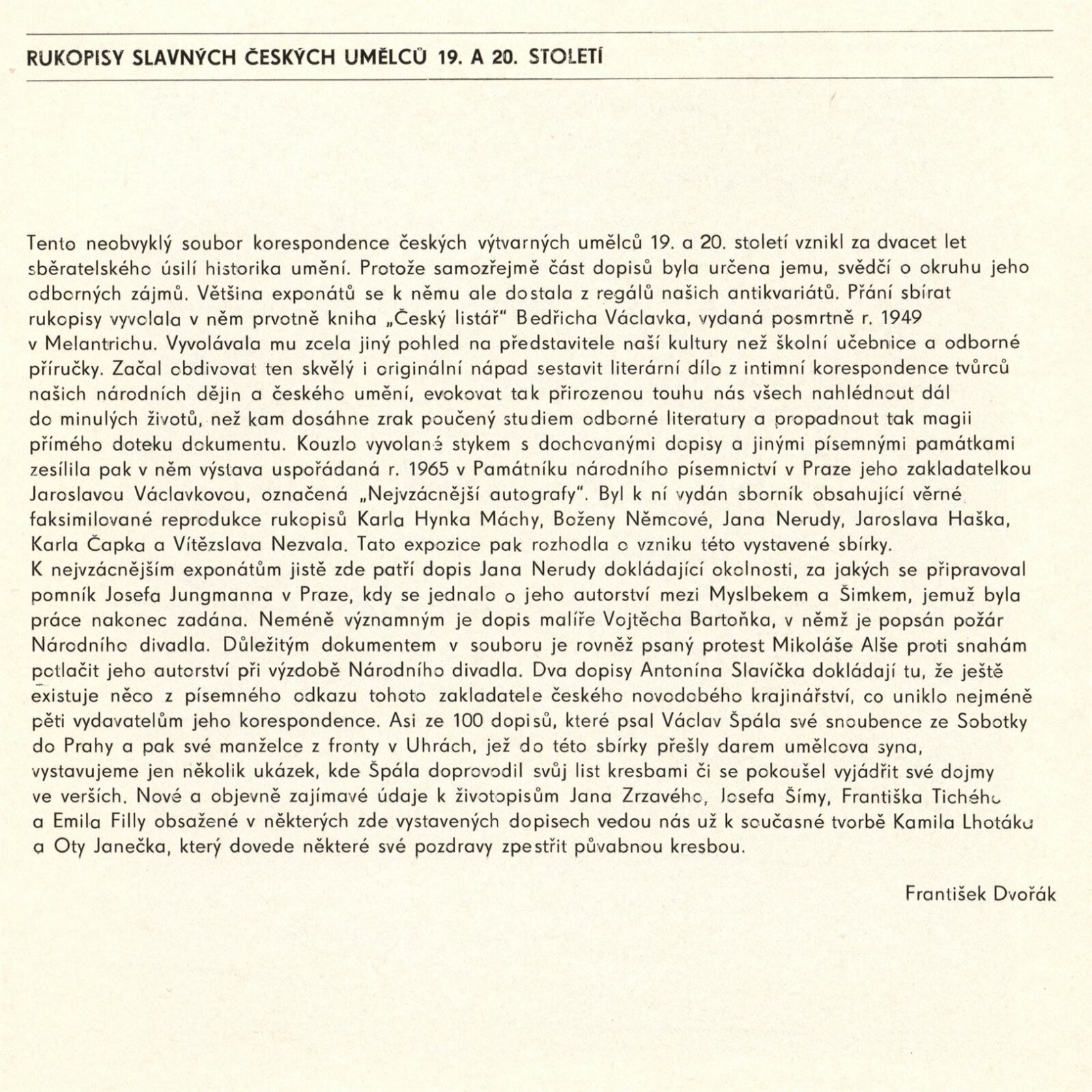 Rukopisy slavných českých umělců 19. a 20. století. Korespondence: Dům umění / Dům pánů z Kunštátu, Kabinet grafiky, 25. 1. – 20. 2. 1983 / Text: František Dvořák. – Brno: DUmB, 1983. – 8 s., DPK 791. – MZK; MG; MMB