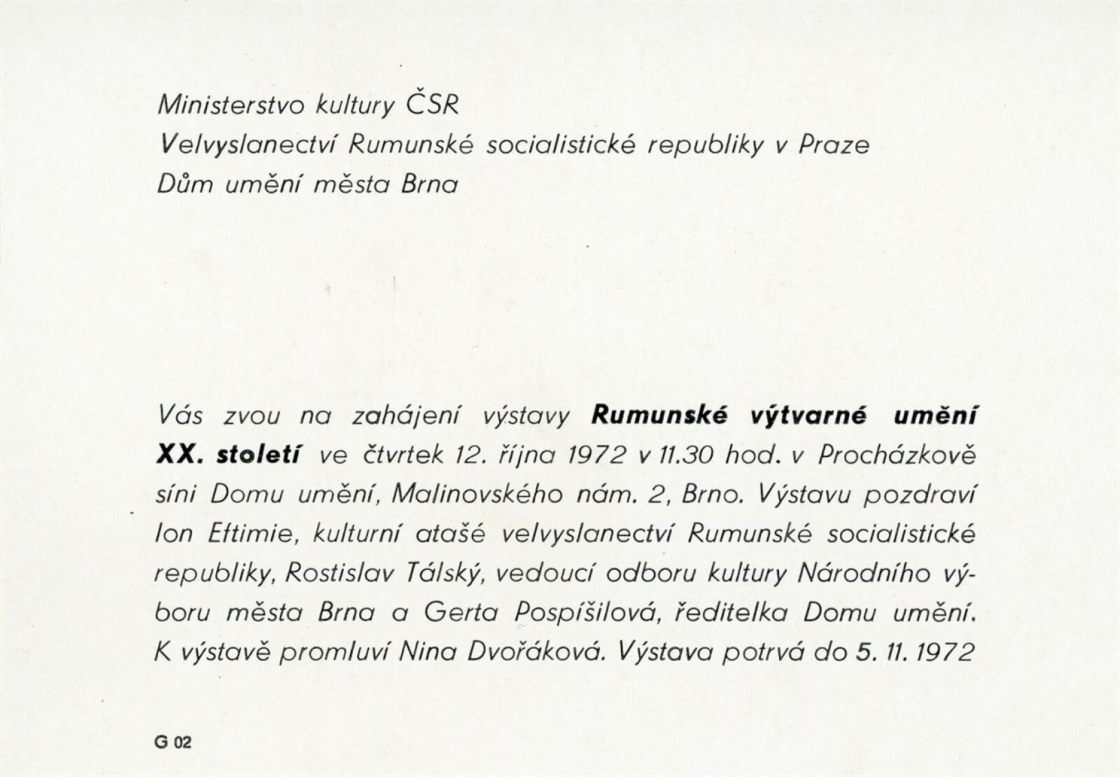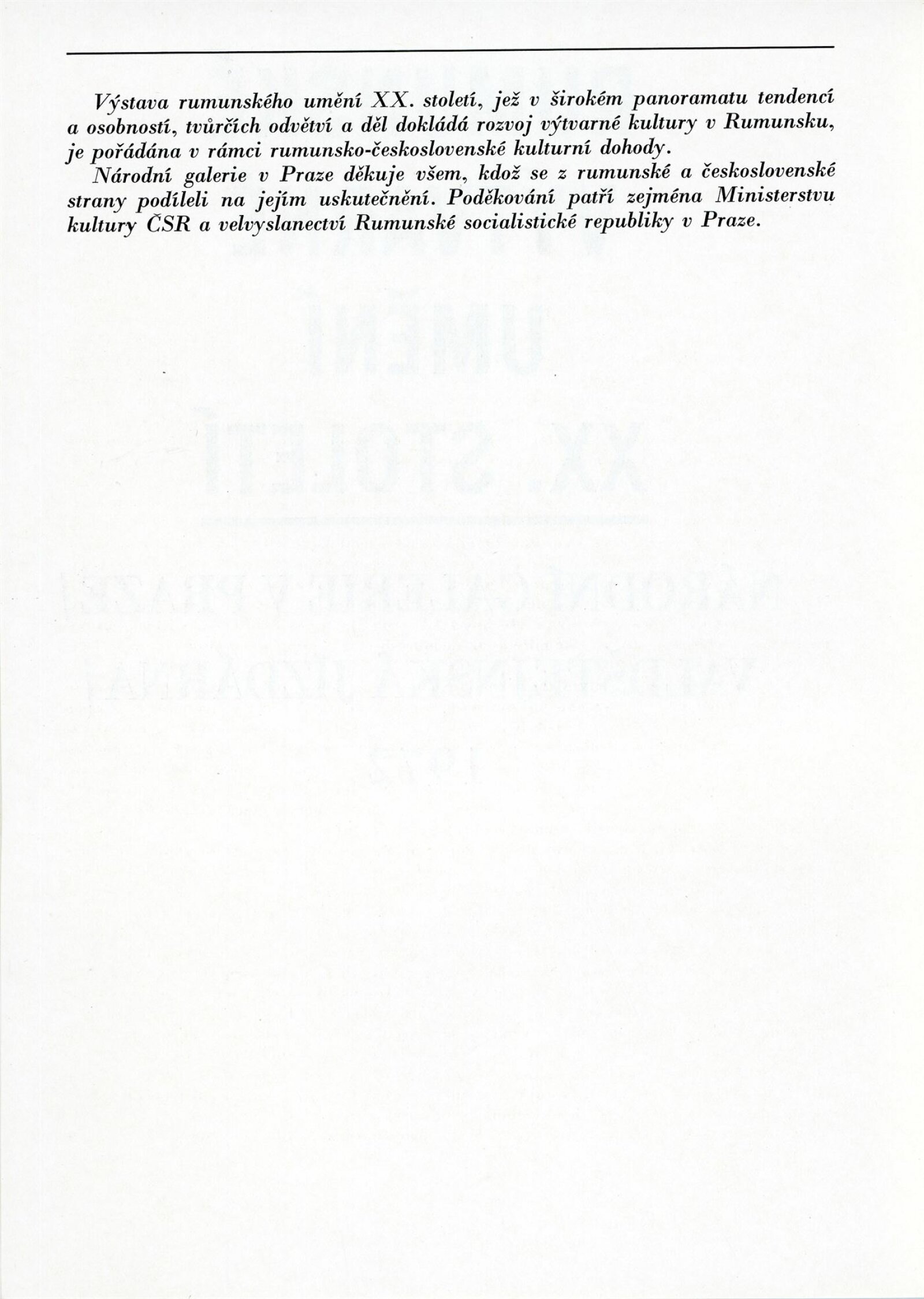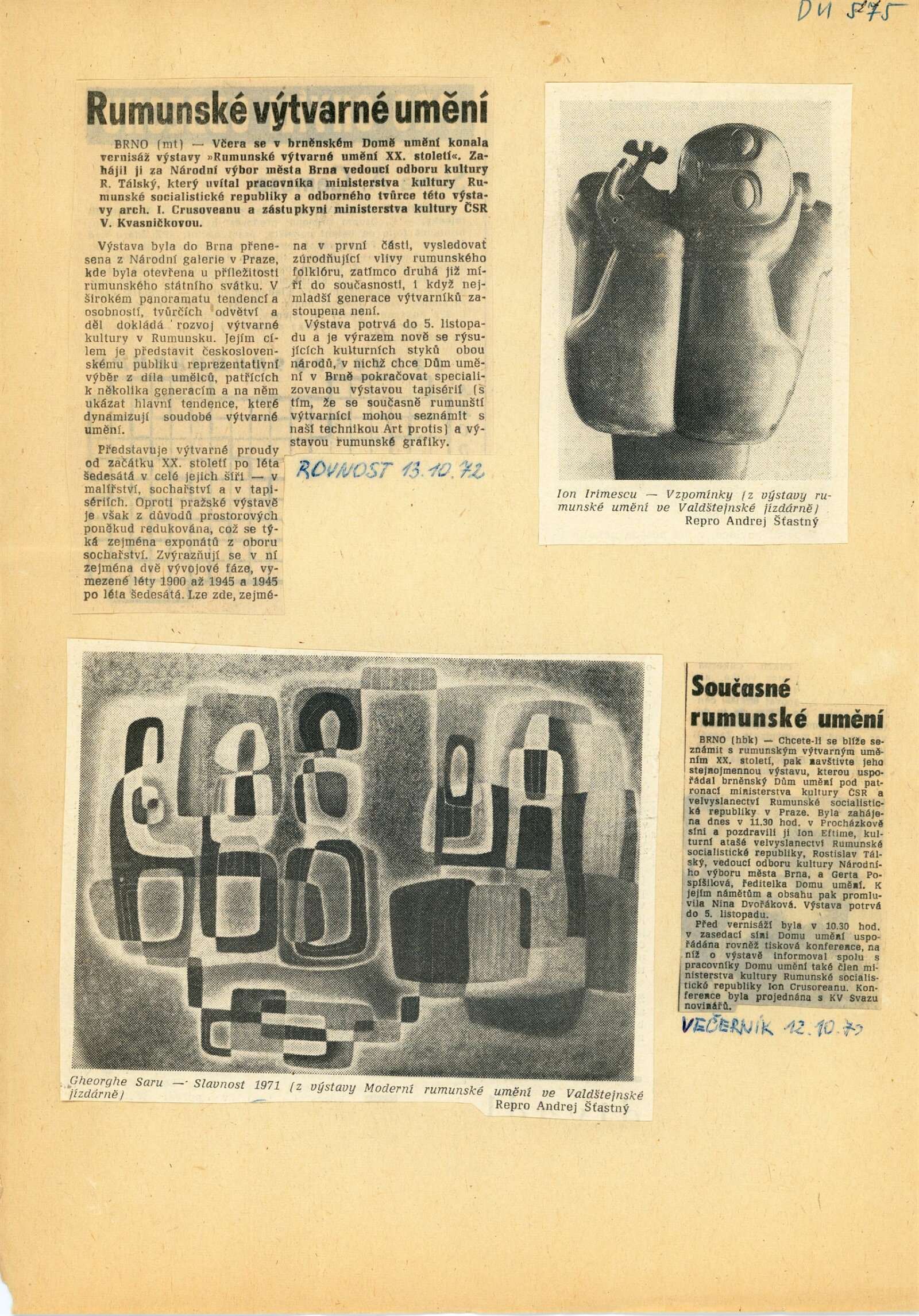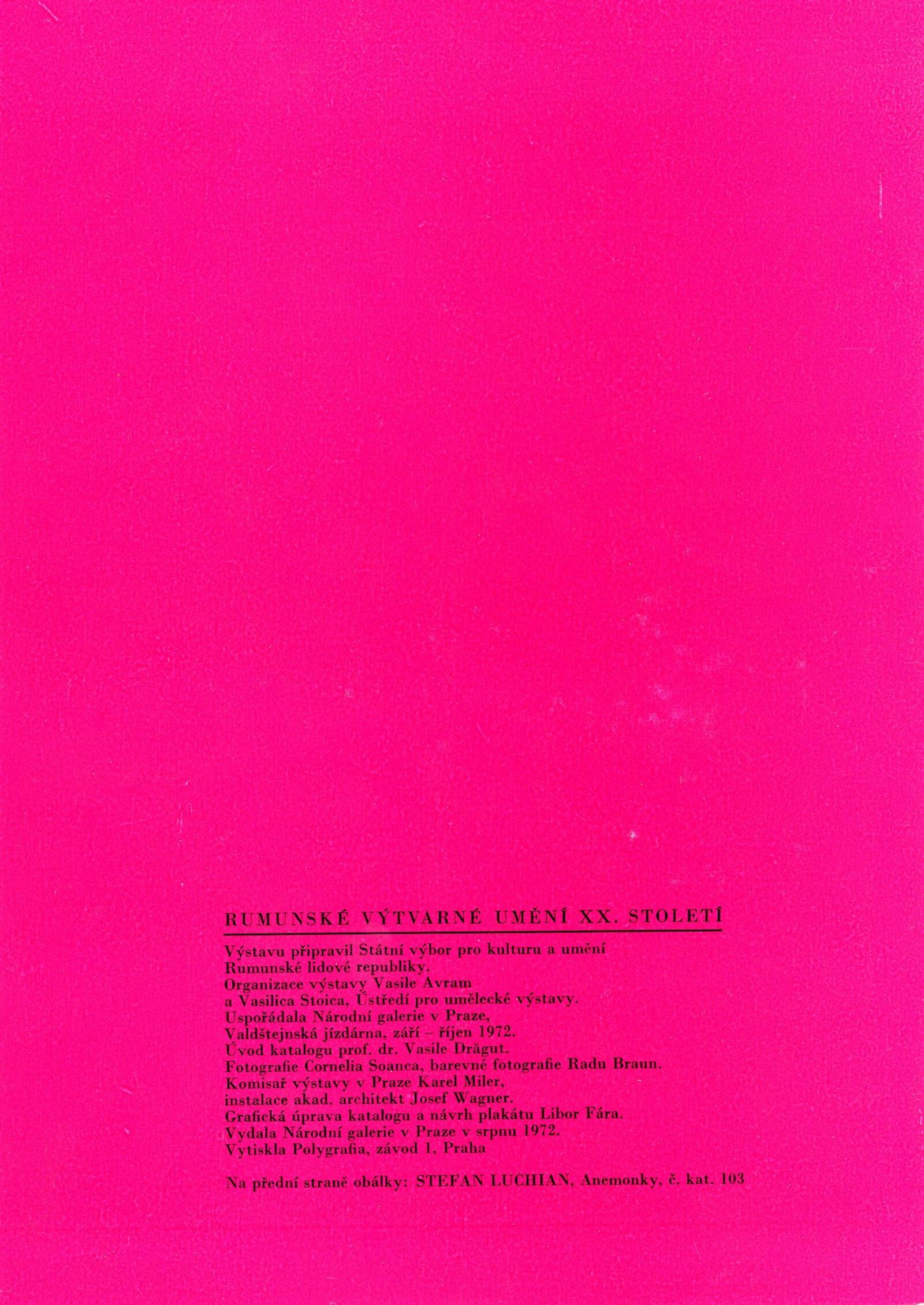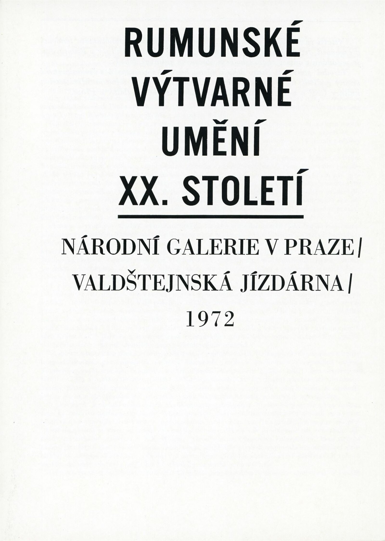Rumunské výtvarné umění XX. století: Dům umění města Brna, 12. 10. – 5. 11. 1972 / Převzatý katalog. Rumunské výtvarné umění XX. století: Valdštejnská jízdárna, září–říjen 1972 / Text: Vasile Dragut. – Praha: Národní galerie, 1972. – 32 s., obr., 2 l. bar. obr., DU 575. – MZK; MG