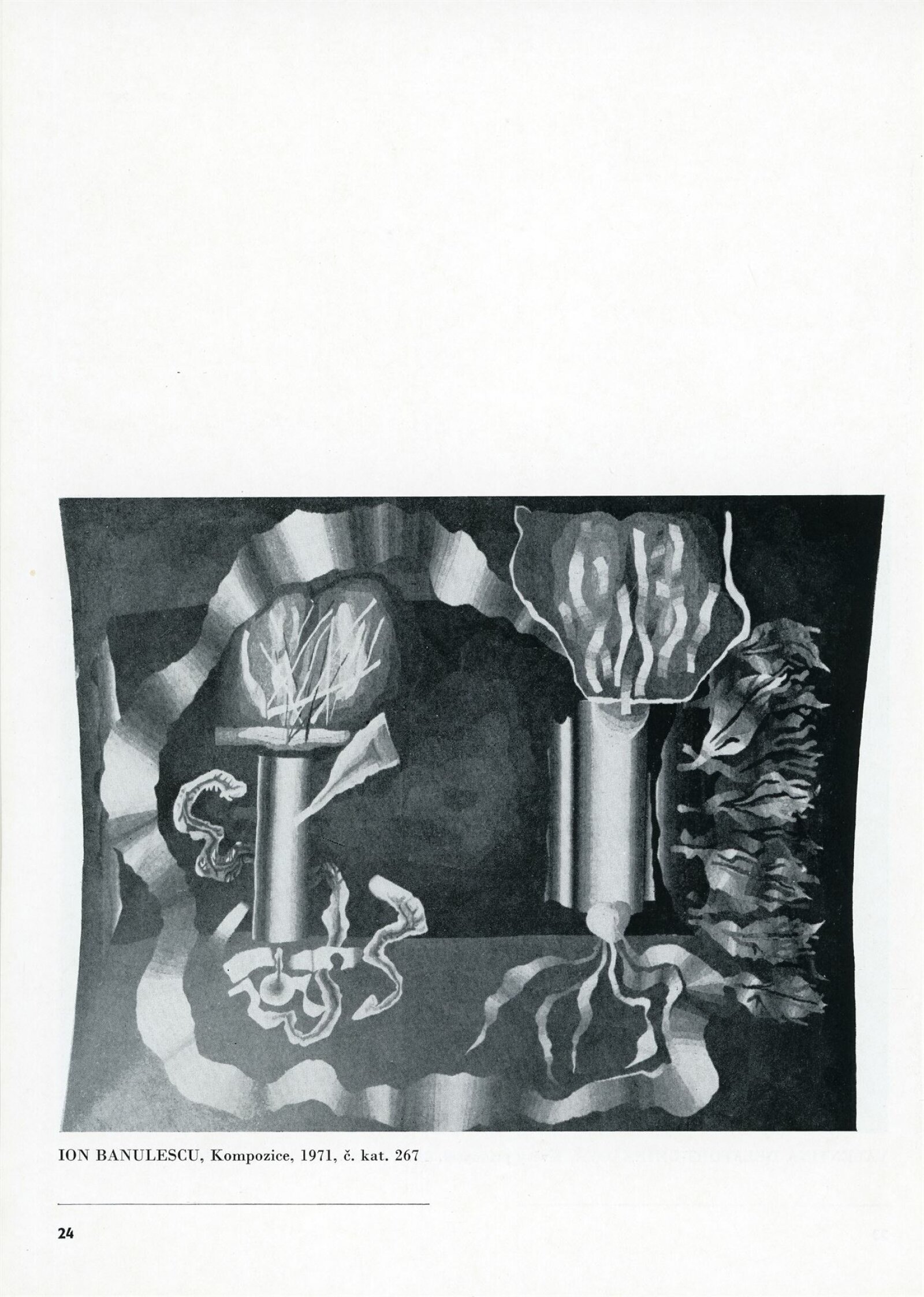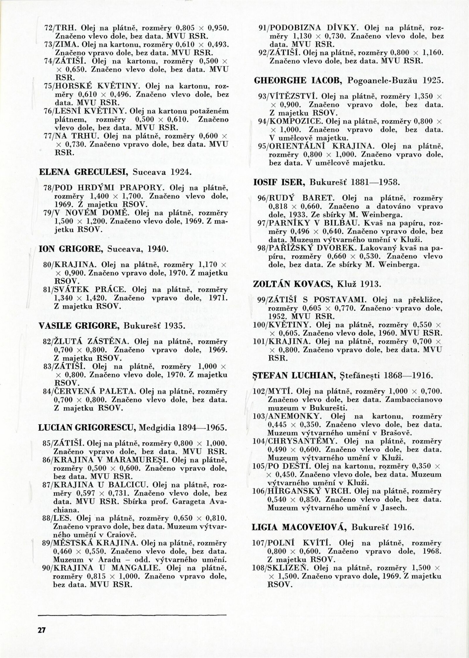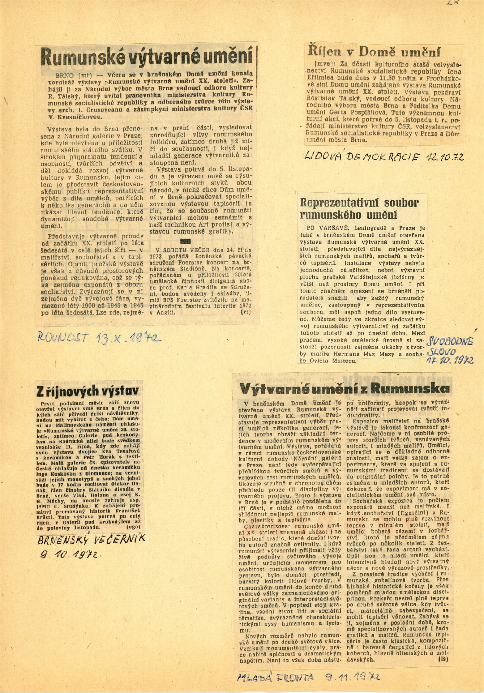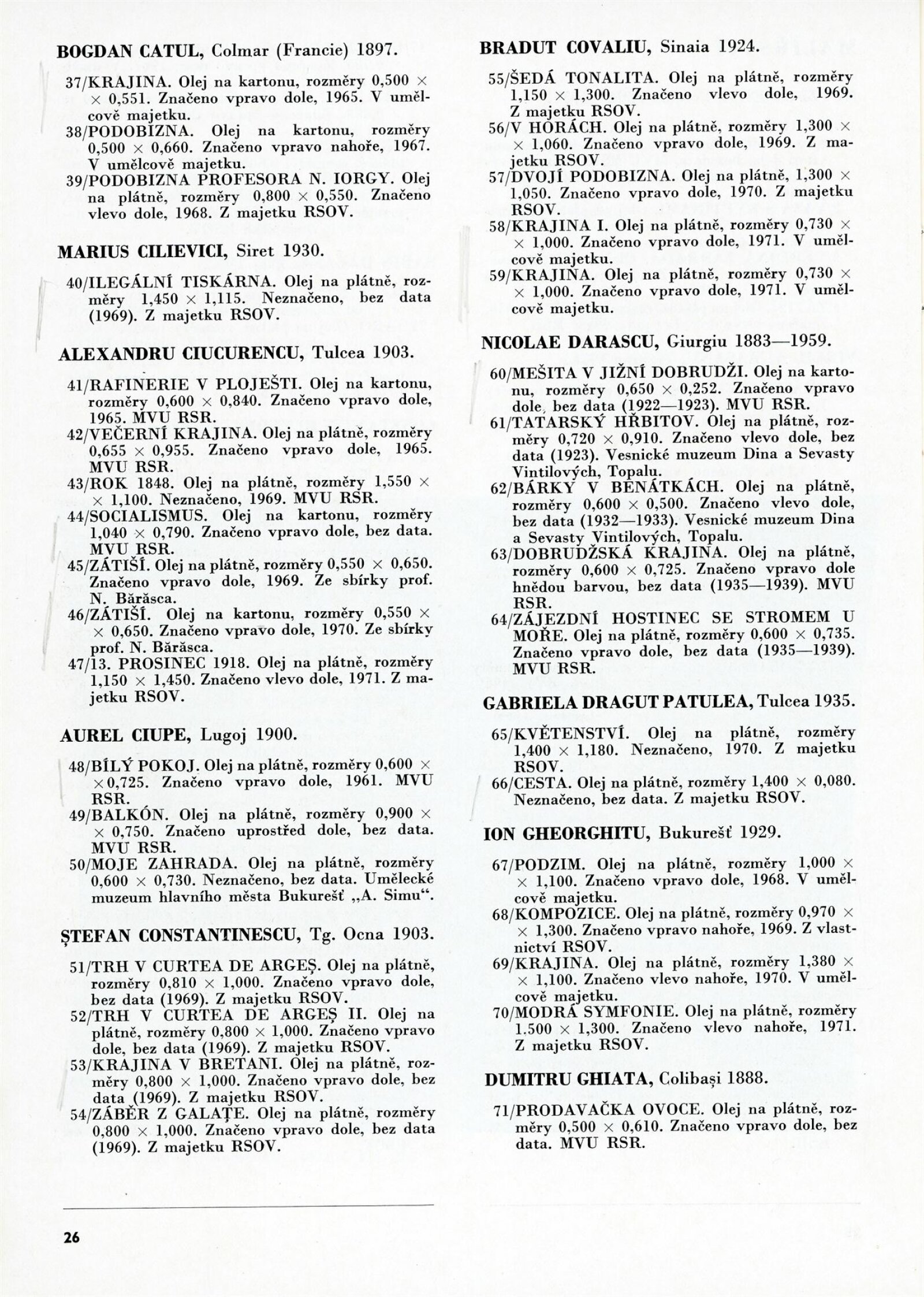 Rumunské výtvarné umění XX. století: Dům umění města Brna, 12. 10. – 5. 11. 1972 / Převzatý katalog. Rumunské výtvarné umění XX. století: Valdštejnská jízdárna, září–říjen 1972 / Text: Vasile Dragut. – Praha: Národní galerie, 1972. – 32 s., obr., 2 l. bar. obr., DU 575. – MZK; MG