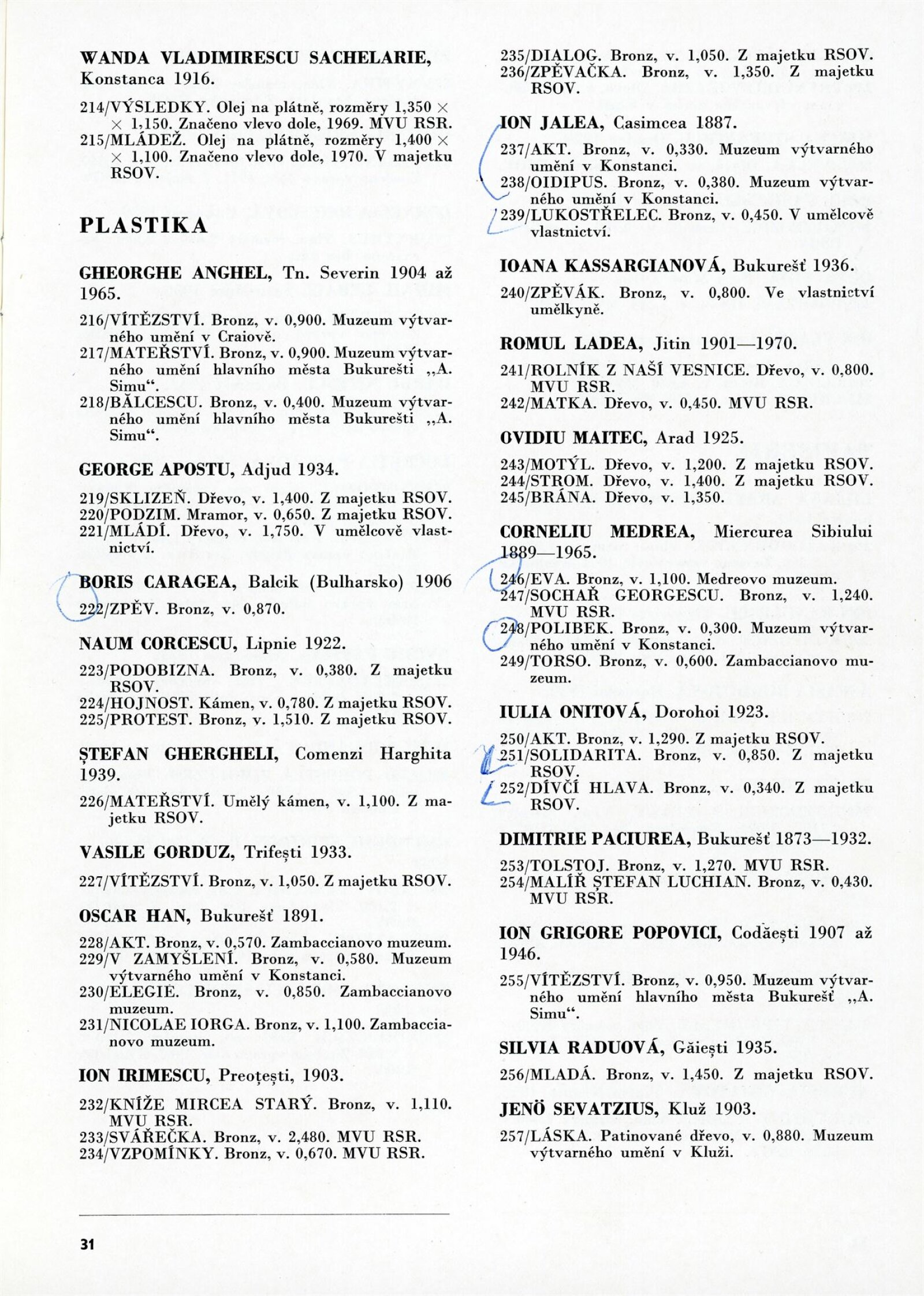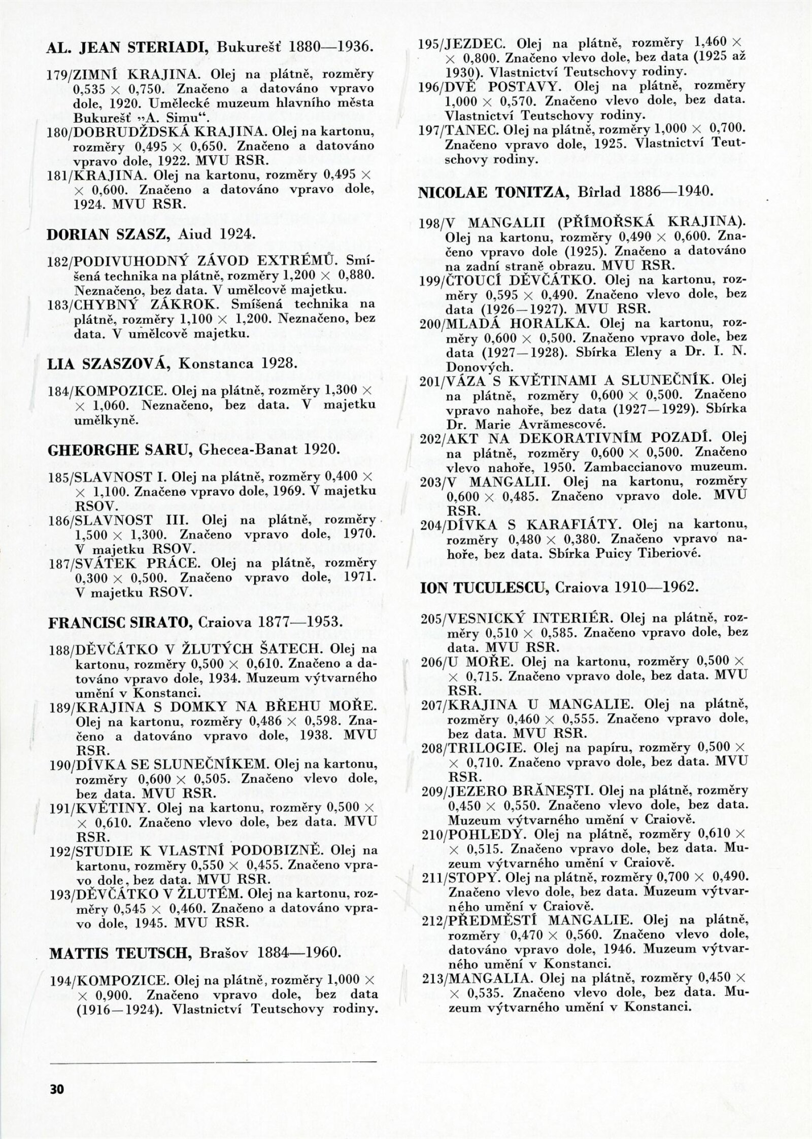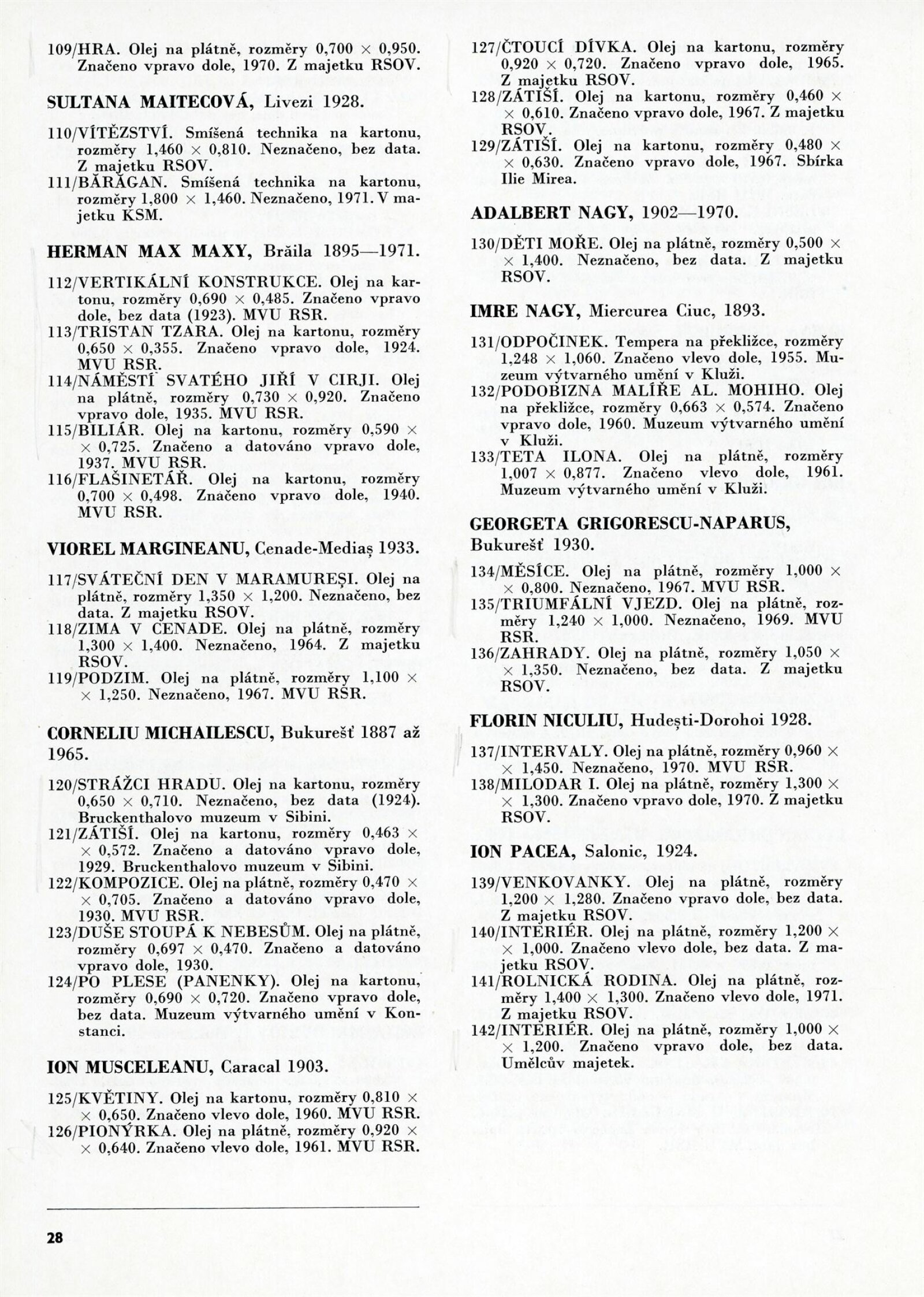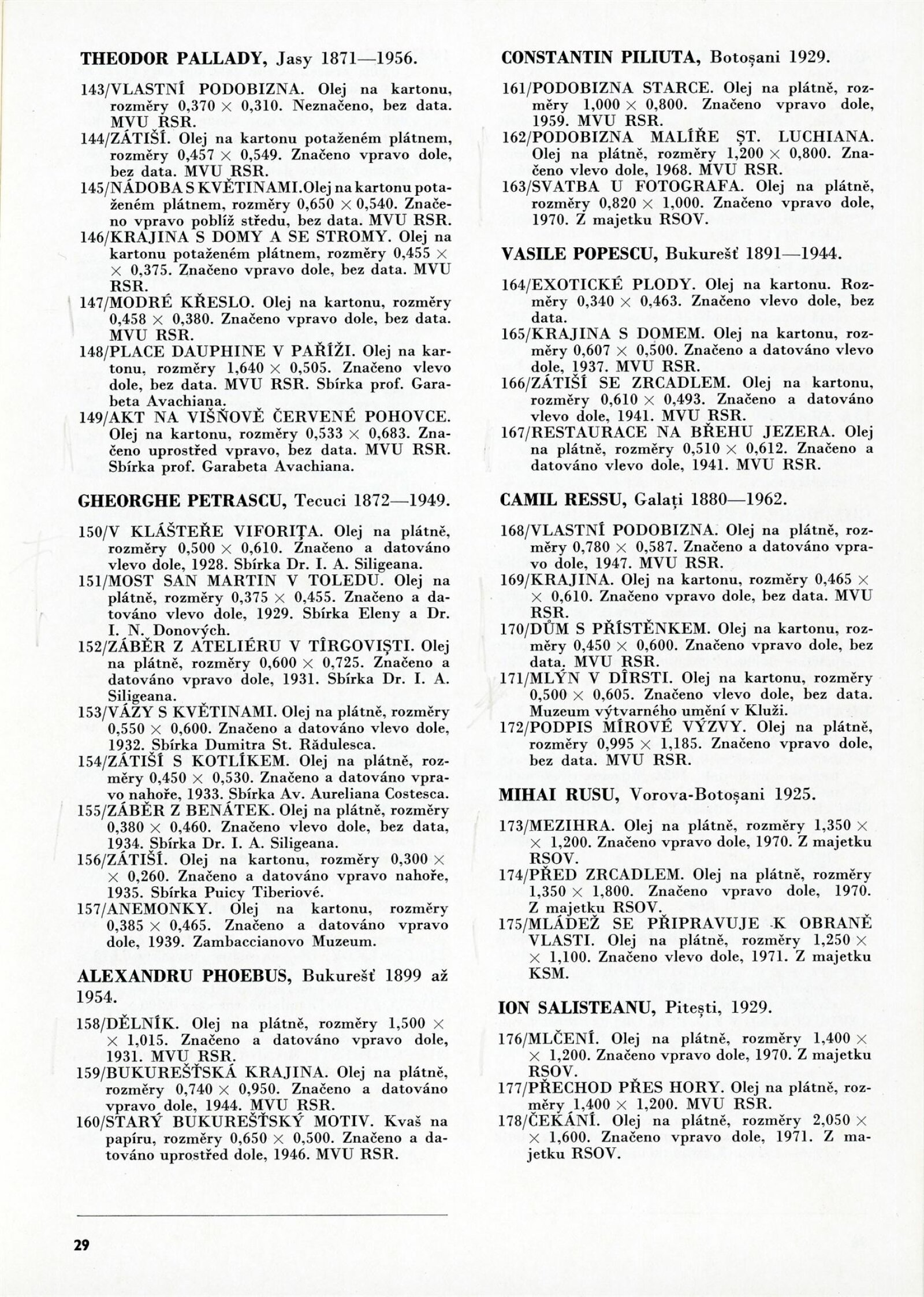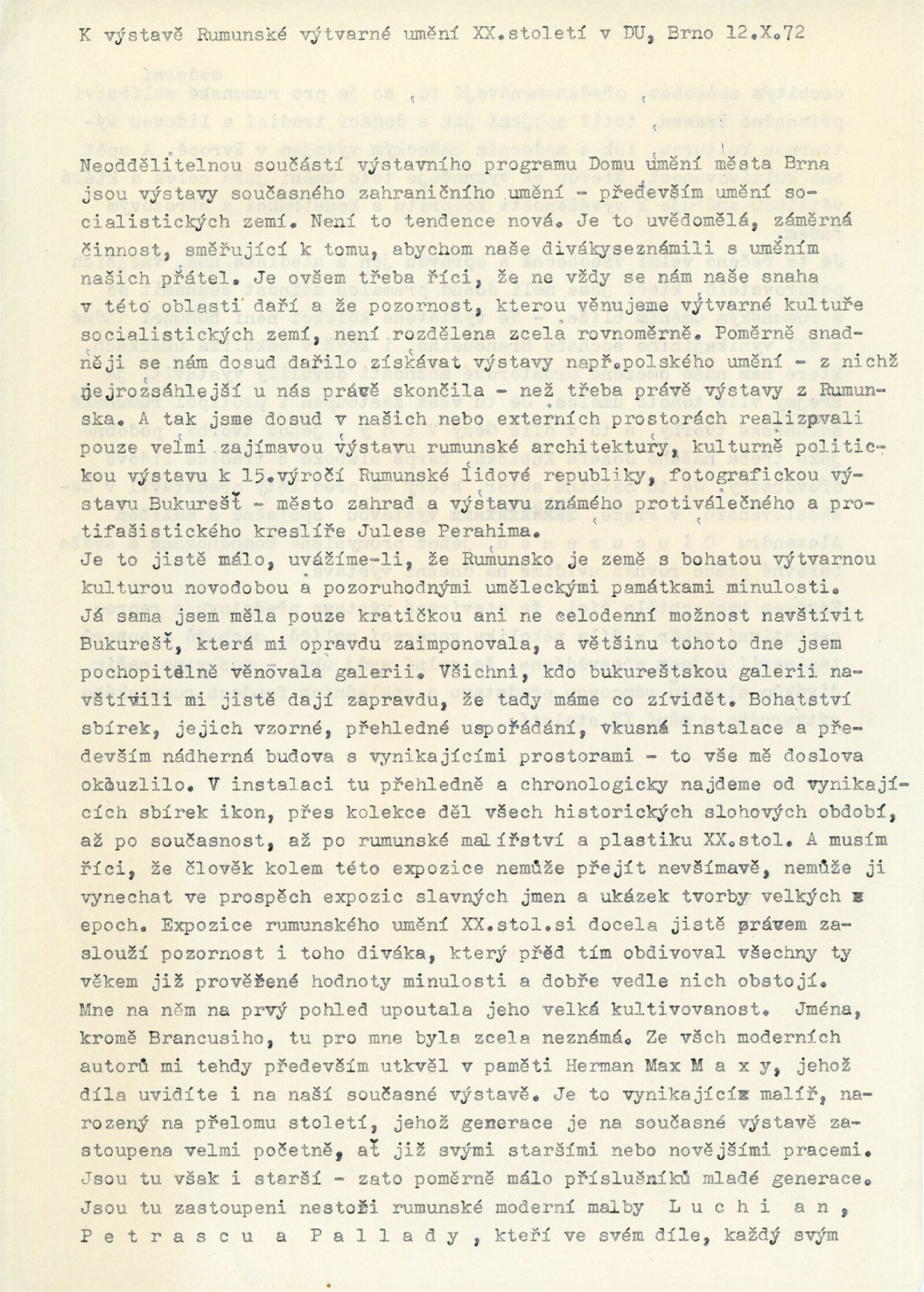 Rumunské výtvarné umění XX. století: Dům umění města Brna, 12. 10. – 5. 11. 1972 / Převzatý katalog. Rumunské výtvarné umění XX. století: Valdštejnská jízdárna, září–říjen 1972 / Text: Vasile Dragut. – Praha: Národní galerie, 1972. – 32 s., obr., 2 l. bar. obr., DU 575. – MZK; MG