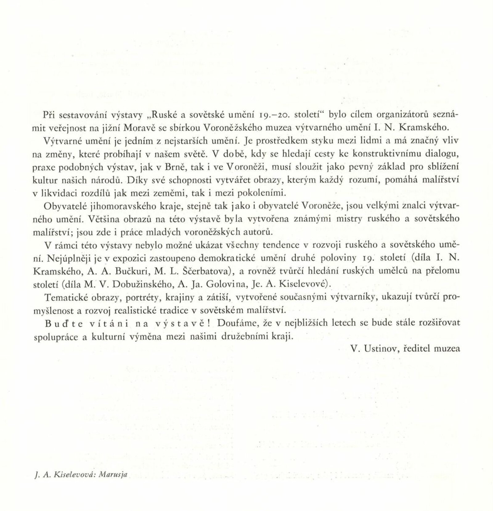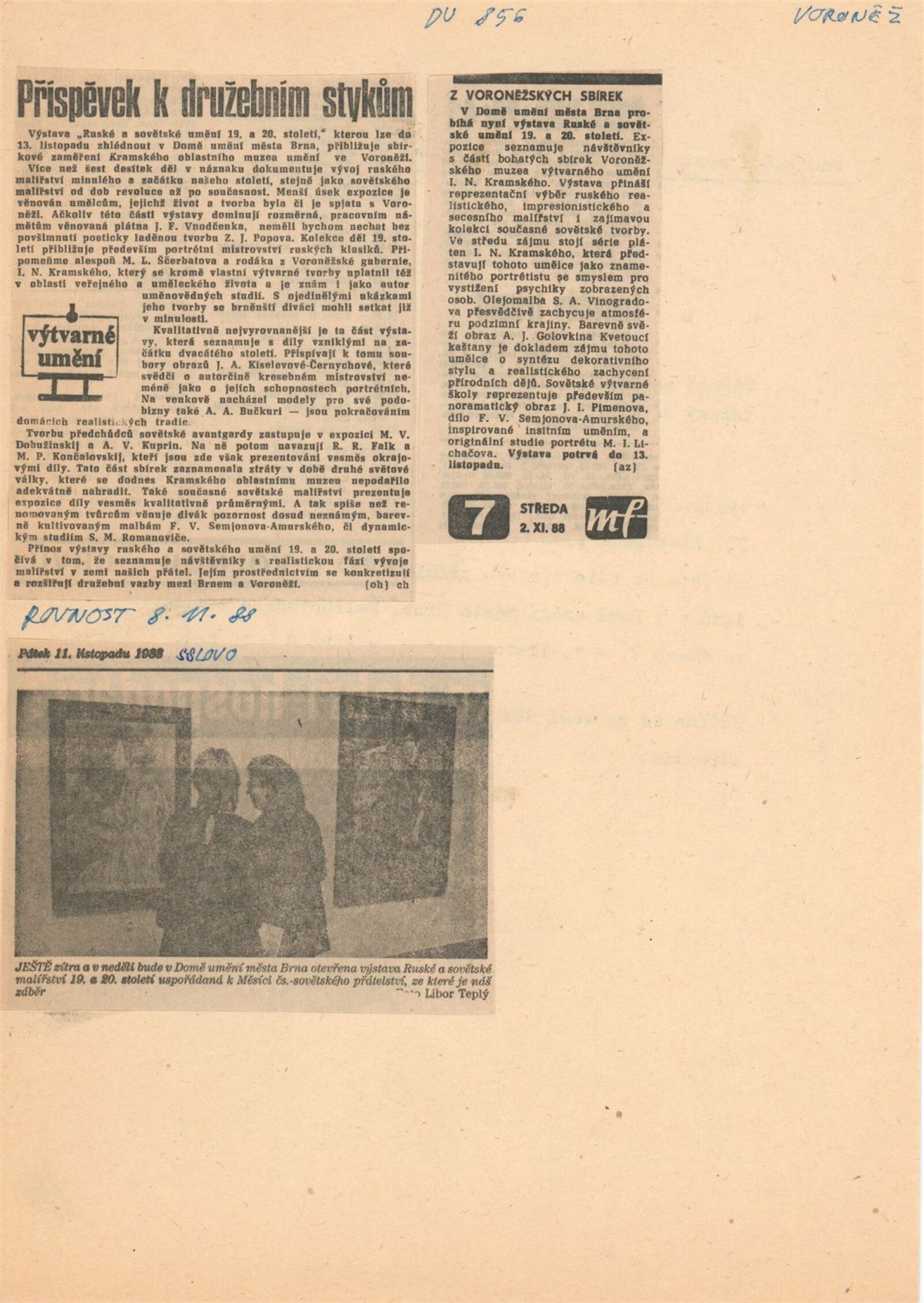 Ruské a sovětské umění XIX. a XX. století [ze sbírek Kramského muzea ve Voroněži]: Dům umění města Brna 14. 10. – 13. 11. 1988 / Text V. Ustinov. - Brno: DUmB, - [8] s., obr. DU 856; MZK; MG; MMB