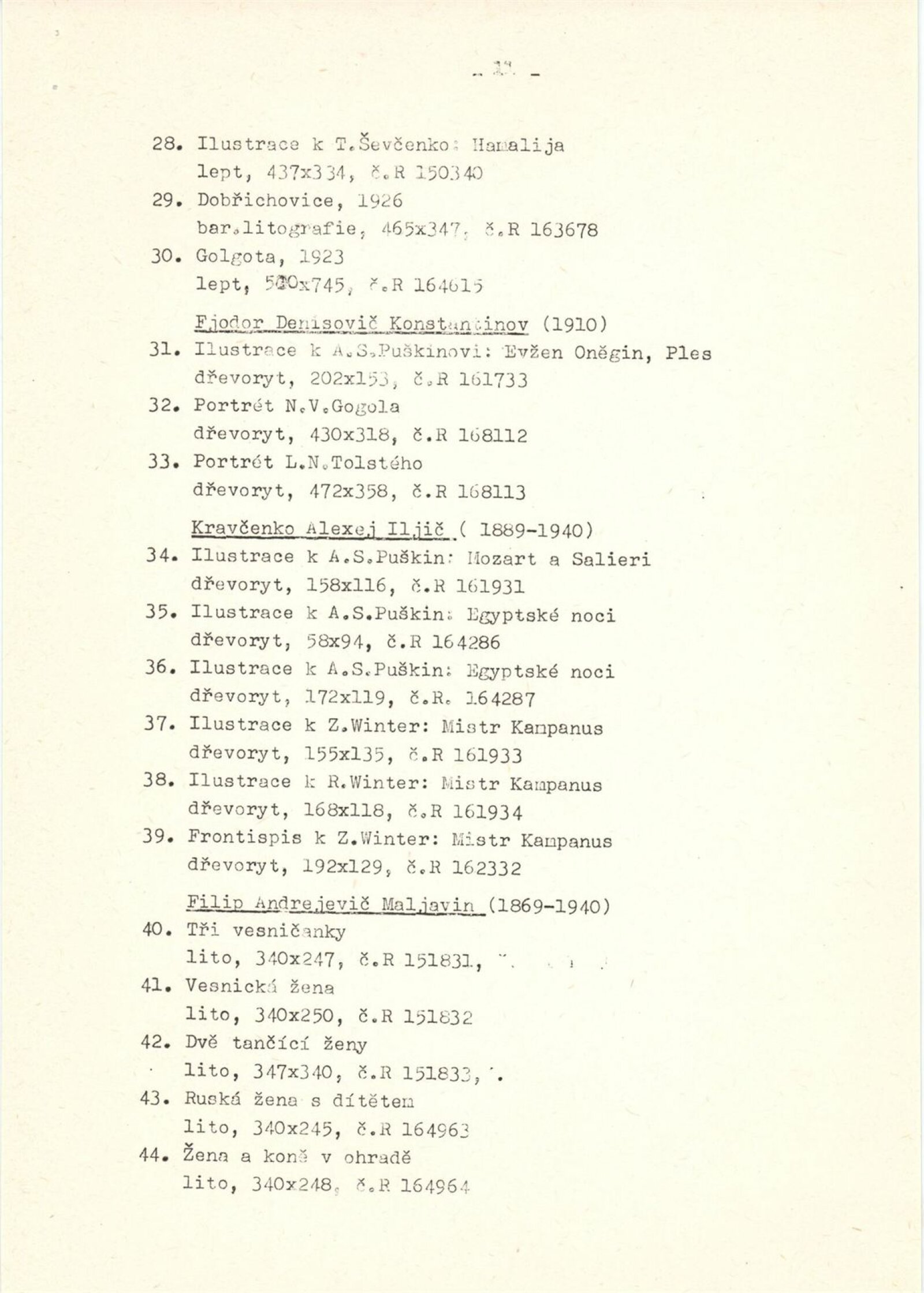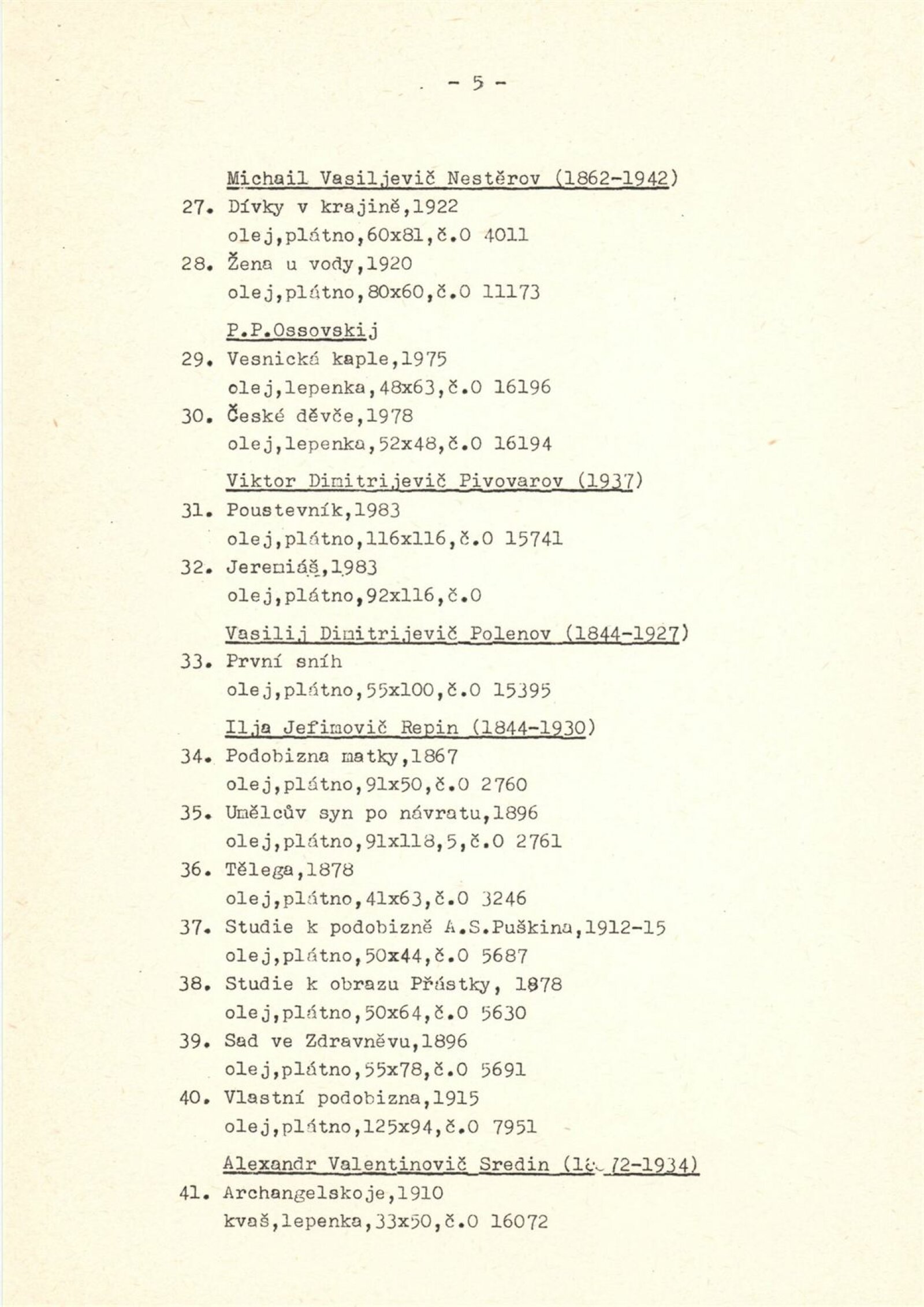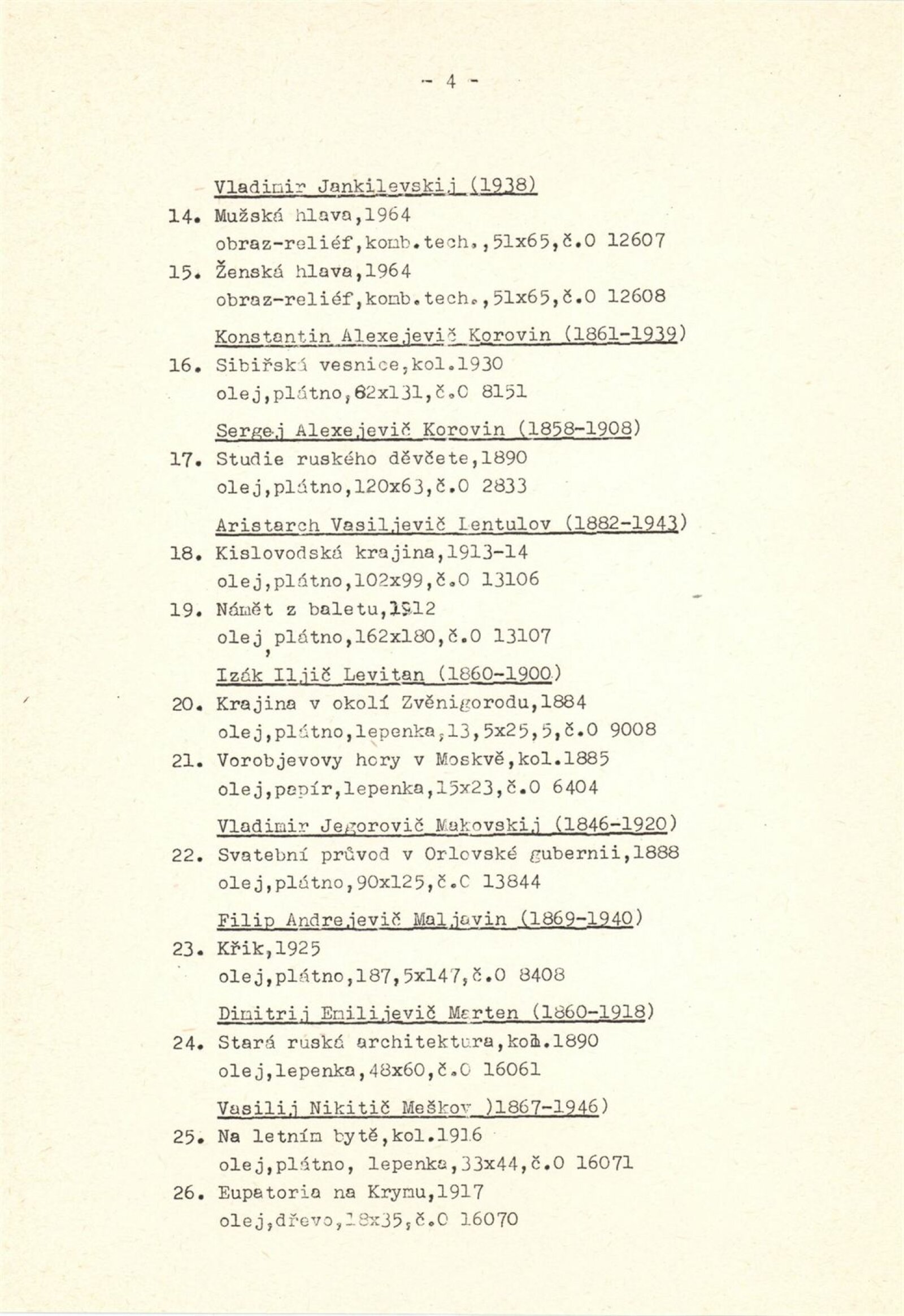 Ivan Konstantinovič Ajvazovskij, Jurij Anněnkov, Abraham Jefimovič Archipov, Lev Bakst, Vasilij Nikolajevič Bakšejev, Alexandr Nikolajevič Benua, Ivan Jakovlevič Bilibin, Konstantin Bogajevski, Michajl Michajlovič Čerennych, Semjon Afanasievič Čujkov, Mstislav Dobužinskij, Robert Rafailovič Falk, Vladimír Andrejevič Favorskij, Illarion Golicyn, Andrej Dimitrijevič Gončarov, Natalija Sergejevna Gončarová, Boris Dimitrijevič Grigorijev, Vladimir Borisovič Jankilevskij, Anatolij Lvovič Kaplan, Vasil Kassian, Fjodor Denisovič Konstantinov, Konstantin Alexejevič Korovin, Sergej Alexejevič Korovin, Alexej Iljič Kravčenko, Kukryniksy, Aristarch Vasiljevič Lentulov, Izák Iljič Levitan, Vladimír Levitskij, Vladimir Jegorovič Makovskij, Filip Andrejevič Maljavin, Filip Andrejevič Maljavin, Dimitrij Emilijevič Marten, Vasilij Nikitič Meškov, Michail Vasiljevič Nestěrov, P. P. Ossovskij, Anna Petrovna Ostroumová-Lebeděvová, Viktor Dimitrijevič Pivovarov, Vasilij Dimitrijevič Polenov, Ilja Jefimovič Repin, N. K. Roerich, E. M Sidorkin, Aldona Skirutyte, Alexandr Valentinovič Sredin, Ulo Sooster, Vasilij Ivanovič Surikov, Ivan Ivanovič Šiškin, Josif Solomonovič Školnik, Alexander Grigorijevič Tyšler, Vasilij Vasilijevič Vereščagin, Sergej Vladimirov, Jurij Filipovič Zacharov