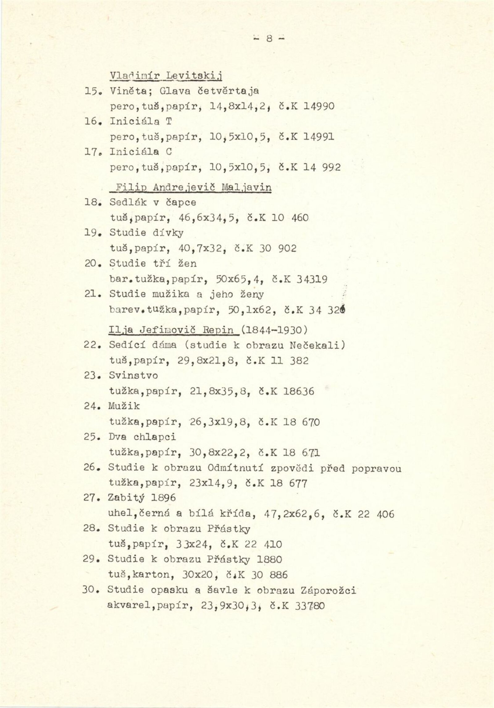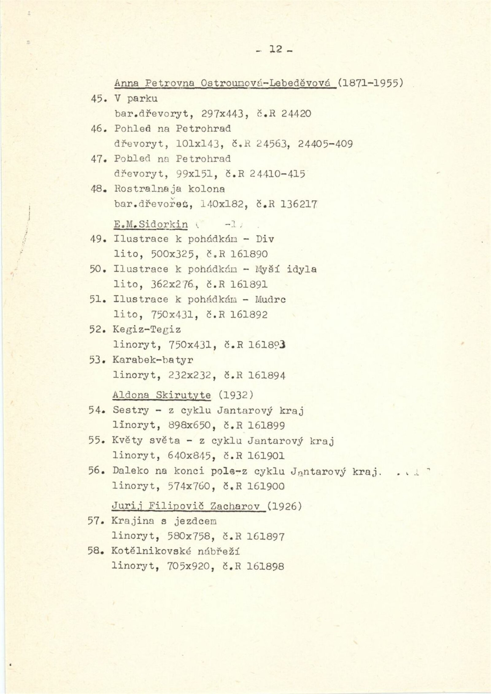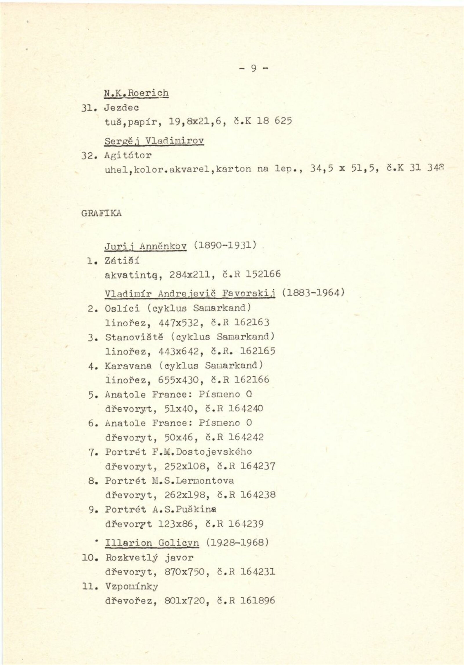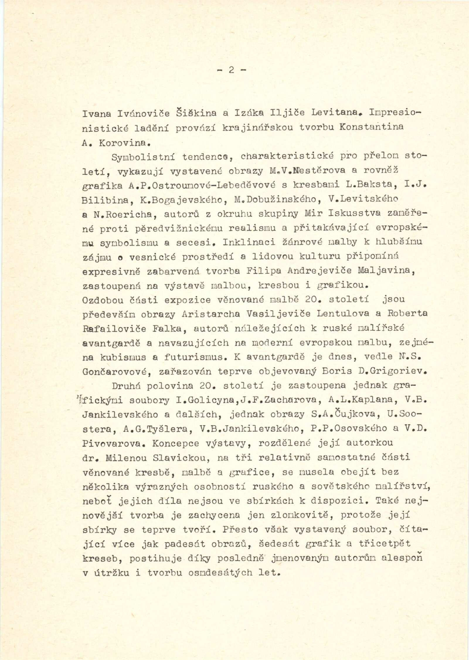 Ivan Konstantinovič Ajvazovskij, Jurij Anněnkov, Abraham Jefimovič Archipov, Lev Bakst, Vasilij Nikolajevič Bakšejev, Alexandr Nikolajevič Benua, Ivan Jakovlevič Bilibin, Konstantin Bogajevski, Michajl Michajlovič Čerennych, Semjon Afanasievič Čujkov, Mstislav Dobužinskij, Robert Rafailovič Falk, Vladimír Andrejevič Favorskij, Illarion Golicyn, Andrej Dimitrijevič Gončarov, Natalija Sergejevna Gončarová, Boris Dimitrijevič Grigorijev, Vladimir Borisovič Jankilevskij, Anatolij Lvovič Kaplan, Vasil Kassian, Fjodor Denisovič Konstantinov, Konstantin Alexejevič Korovin, Sergej Alexejevič Korovin, Alexej Iljič Kravčenko, Kukryniksy, Aristarch Vasiljevič Lentulov, Izák Iljič Levitan, Vladimír Levitskij, Vladimir Jegorovič Makovskij, Filip Andrejevič Maljavin, Filip Andrejevič Maljavin, Dimitrij Emilijevič Marten, Vasilij Nikitič Meškov, Michail Vasiljevič Nestěrov, P. P. Ossovskij, Anna Petrovna Ostroumová-Lebeděvová, Viktor Dimitrijevič Pivovarov, Vasilij Dimitrijevič Polenov, Ilja Jefimovič Repin, N. K. Roerich, E. M Sidorkin, Aldona Skirutyte, Alexandr Valentinovič Sredin, Ulo Sooster, Vasilij Ivanovič Surikov, Ivan Ivanovič Šiškin, Josif Solomonovič Školnik, Alexander Grigorijevič Tyšler, Vasilij Vasilijevič Vereščagin, Sergej Vladimirov, Jurij Filipovič Zacharov