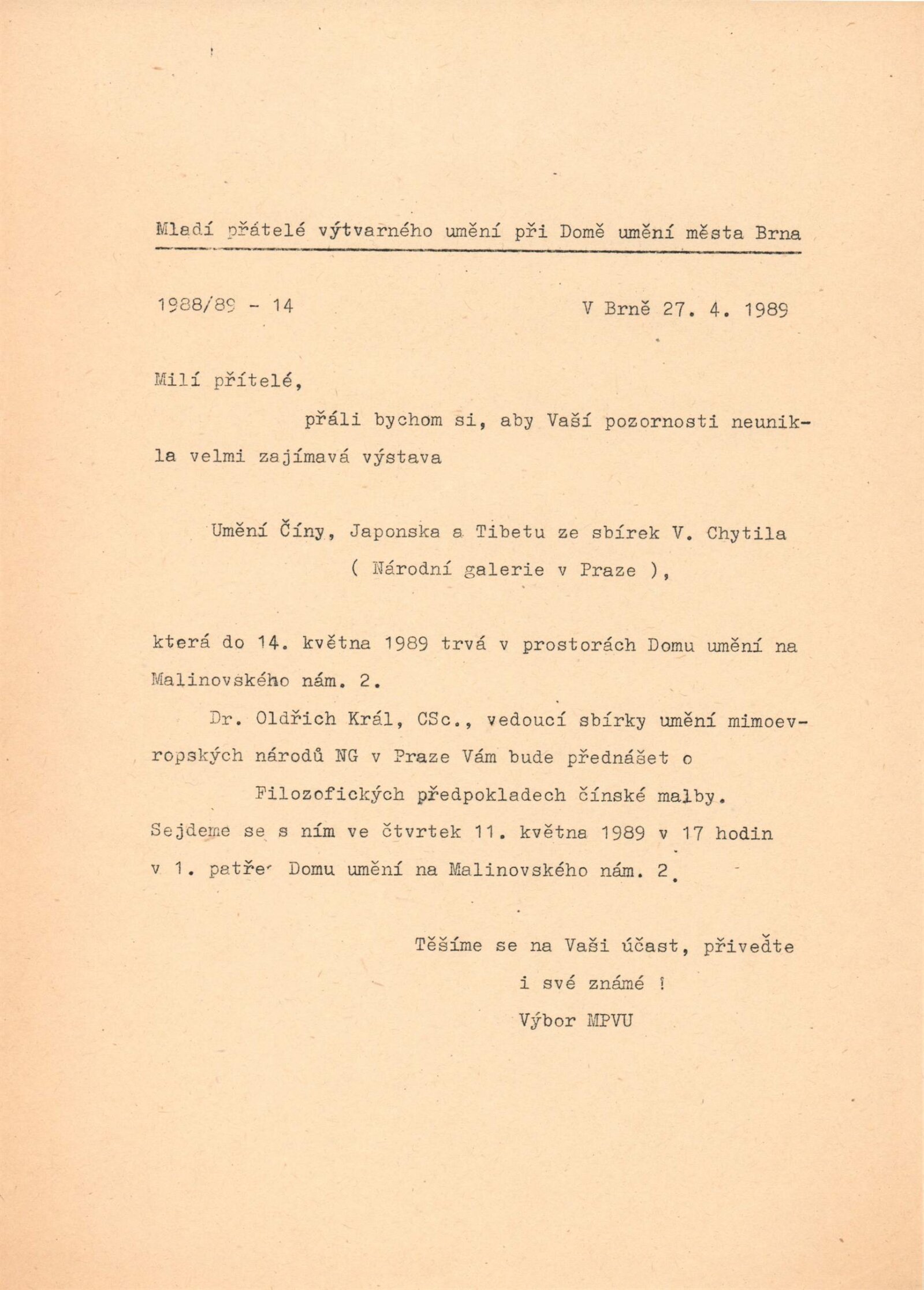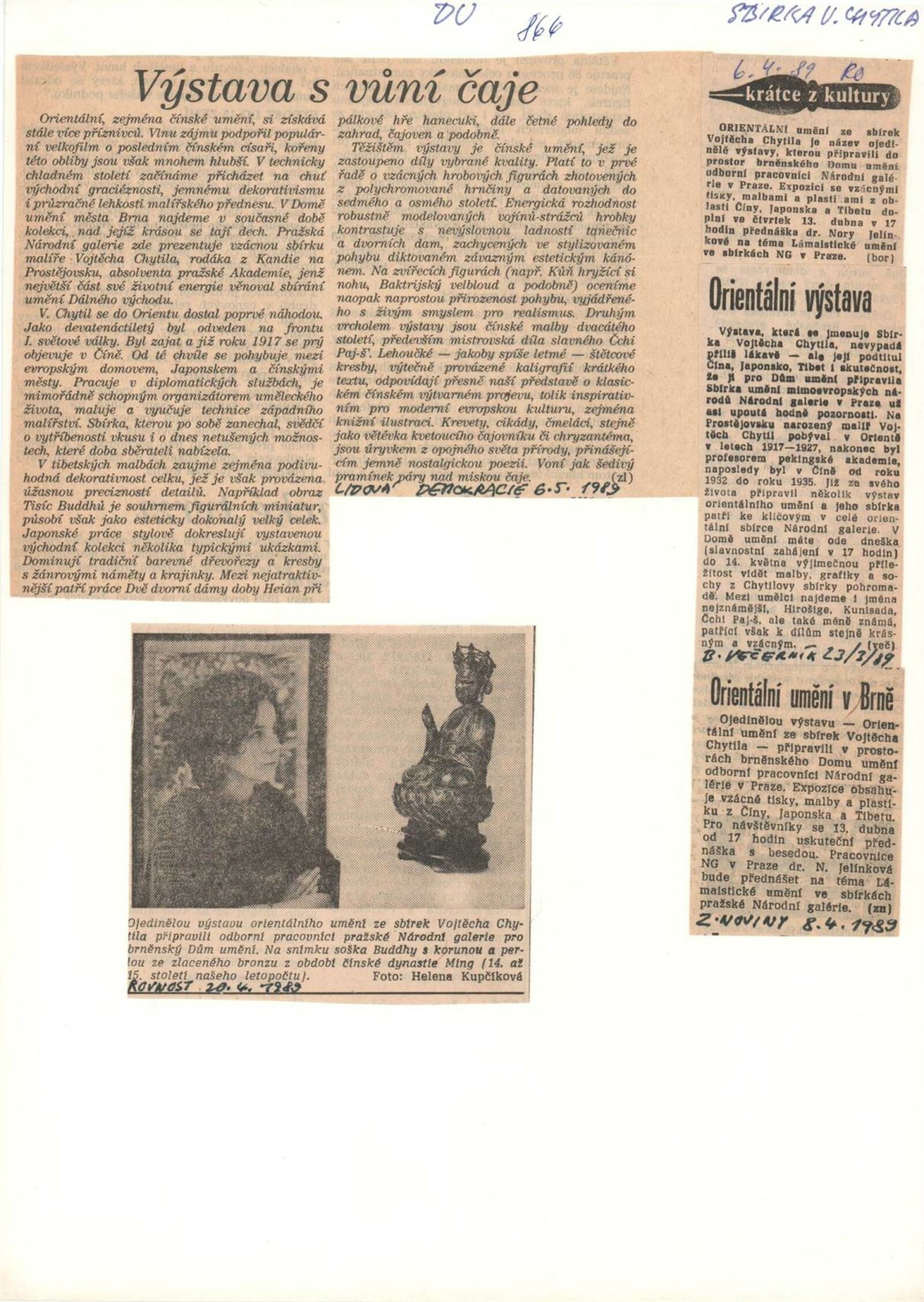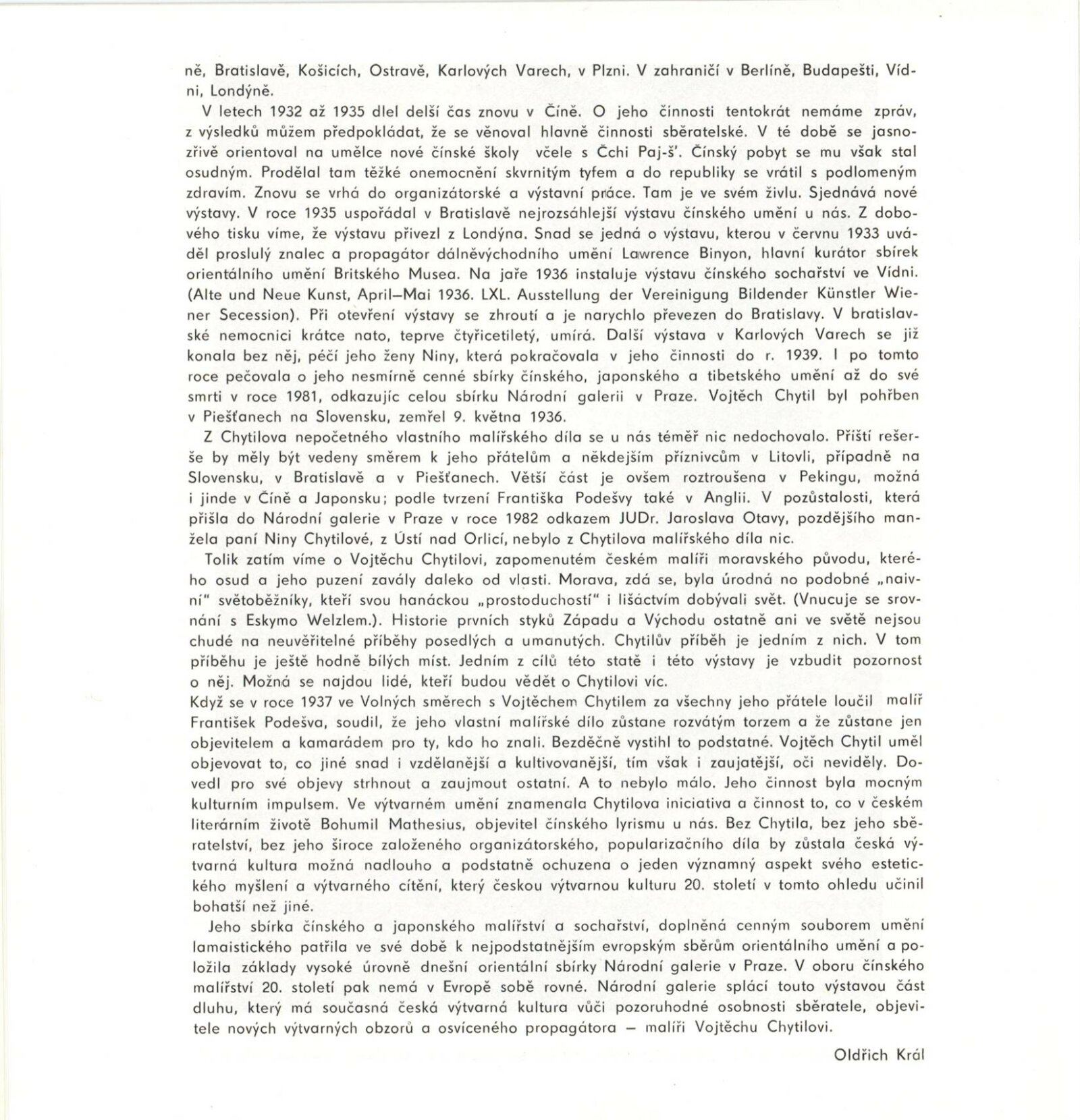 Sbírka Vojtěcha Chytila (Čína, Japonsko, Tibet): Dům umění města Brna, 1. patro, 24. 3. – 14. 5. 1989 / Text: Oldřich Král. – Brno: DUmB, 1989. – [26] s., obr., DU 866. – MZK; MG; MMB