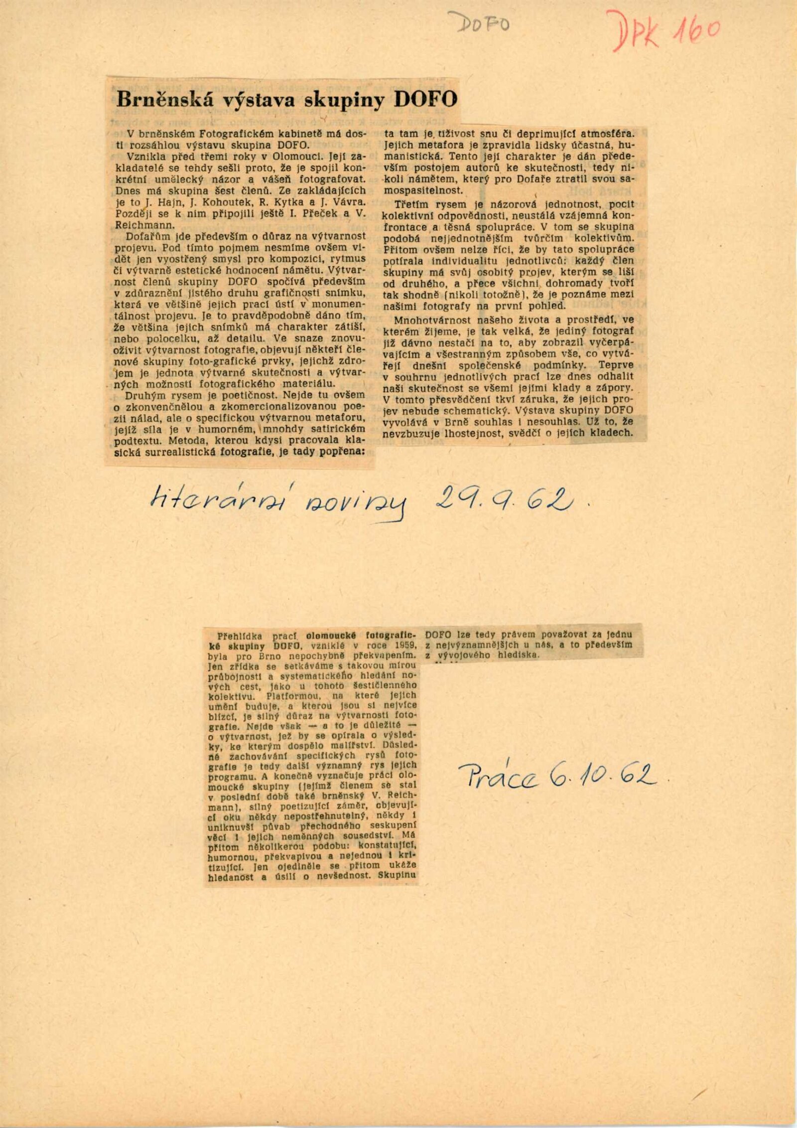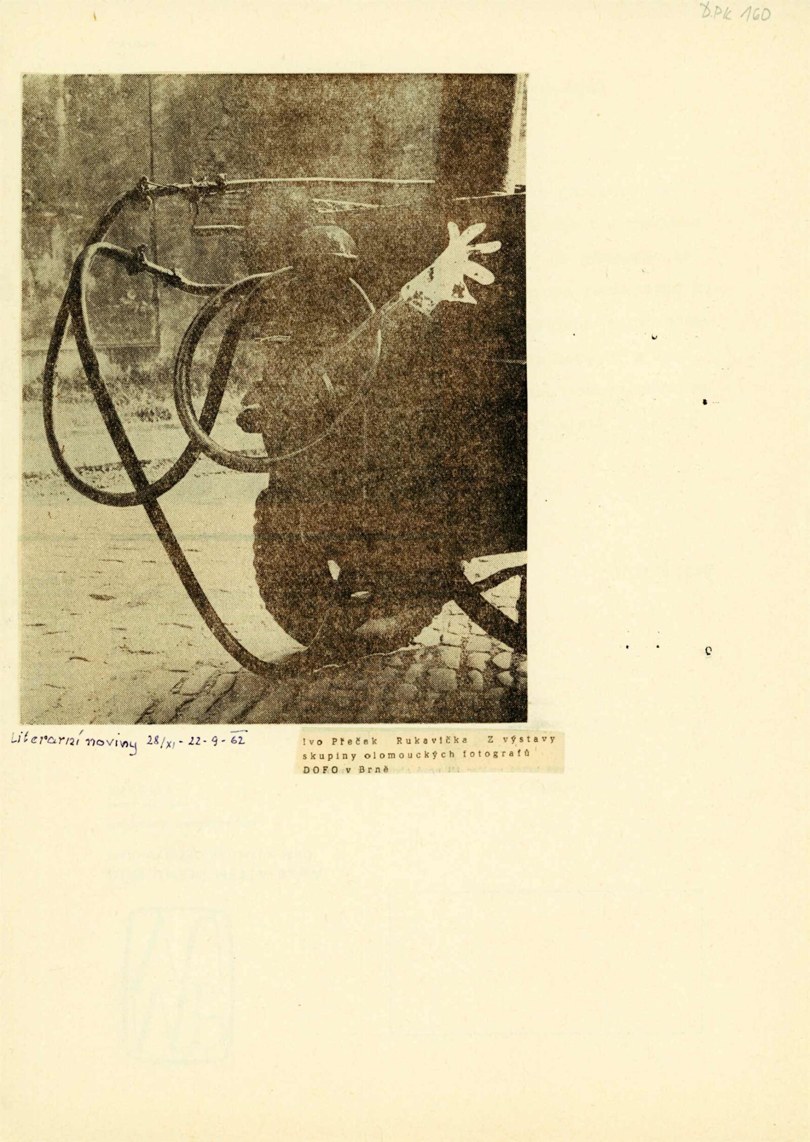 společná pozvánka DPK 159 a 161, katalog, karta k výstavě, podmínky pro uspořádání výstavy, žádost o povolení výstavy, korespondence (Dům osvěty Olomouc: žádost o uspořádání výstavy a upřesnění termínu, dopis J. Vávry – výstava původně nebyla přijata do výst. plánu, provozní korespondence), objednávka katalogu v Olomouci, recenze v tisku, pozvánka (DU Olomouc)