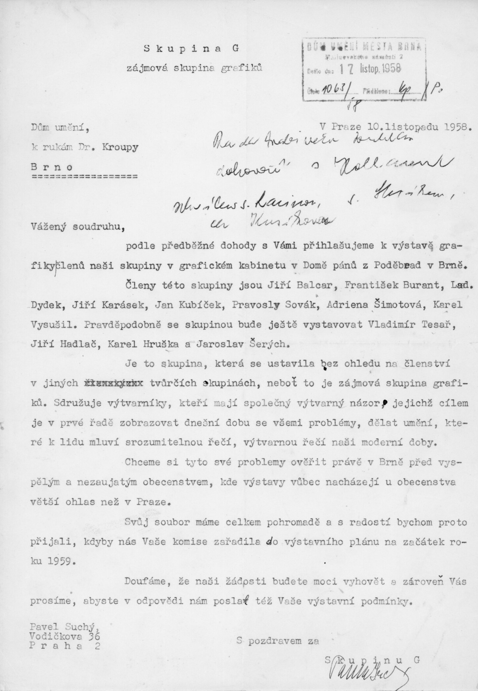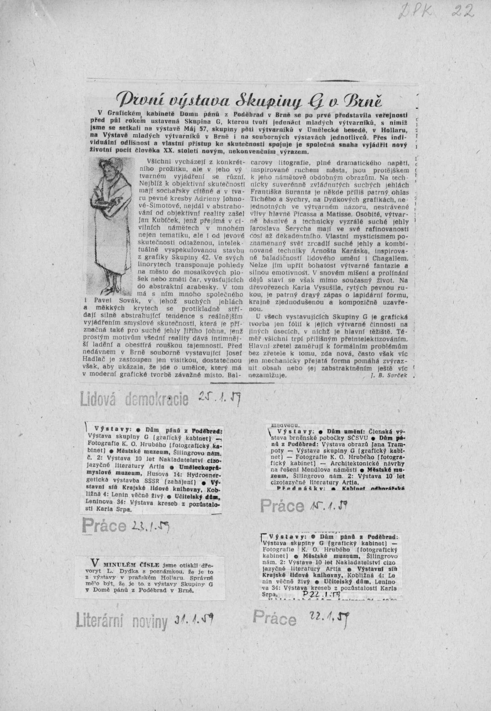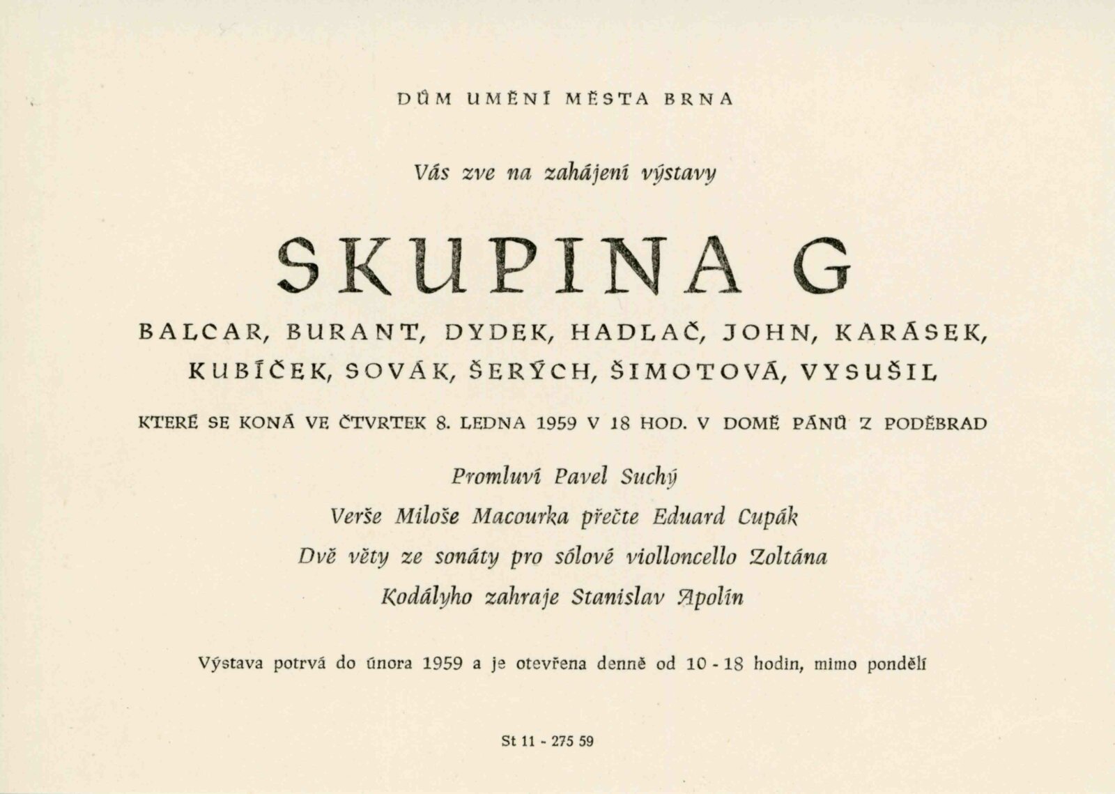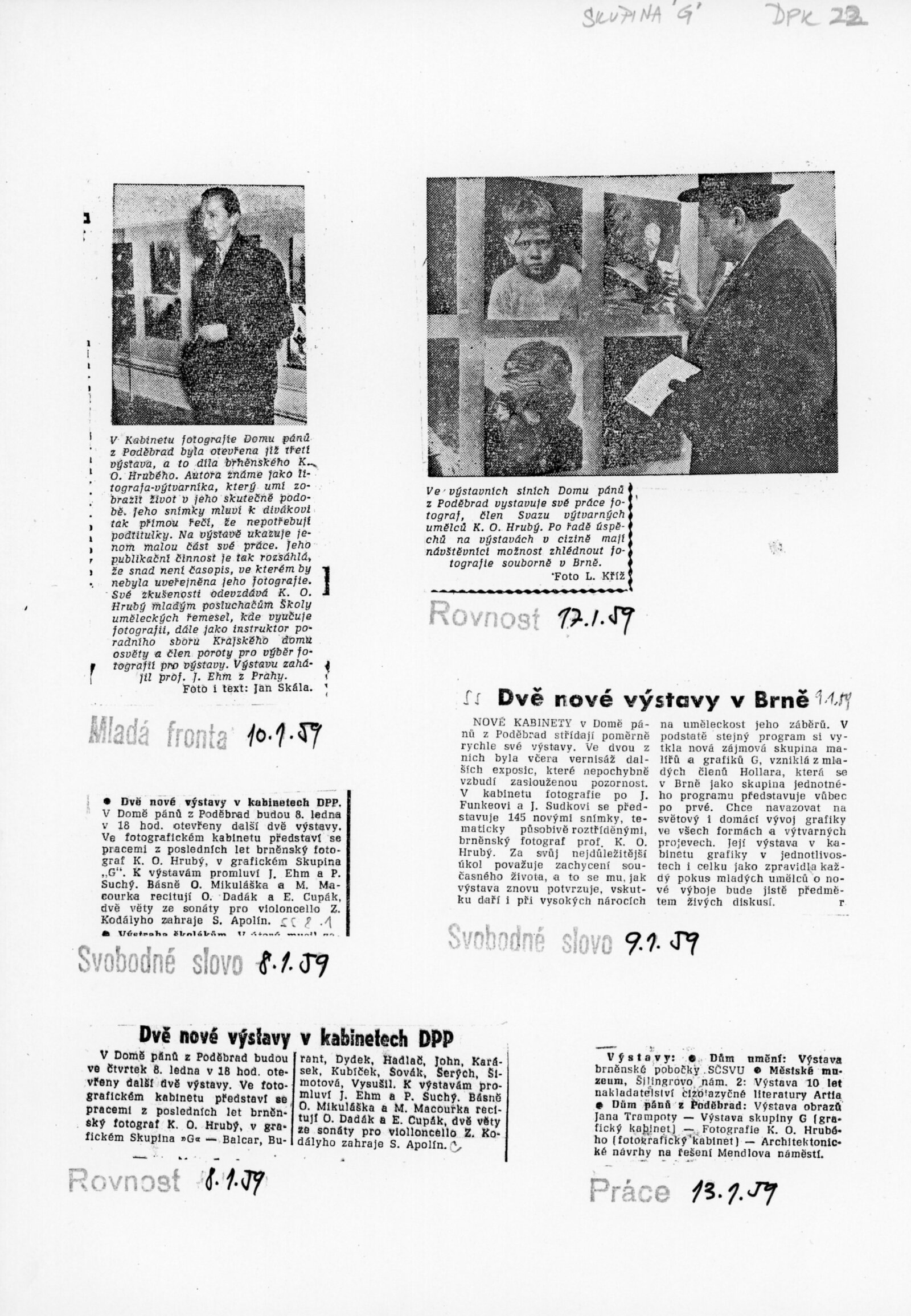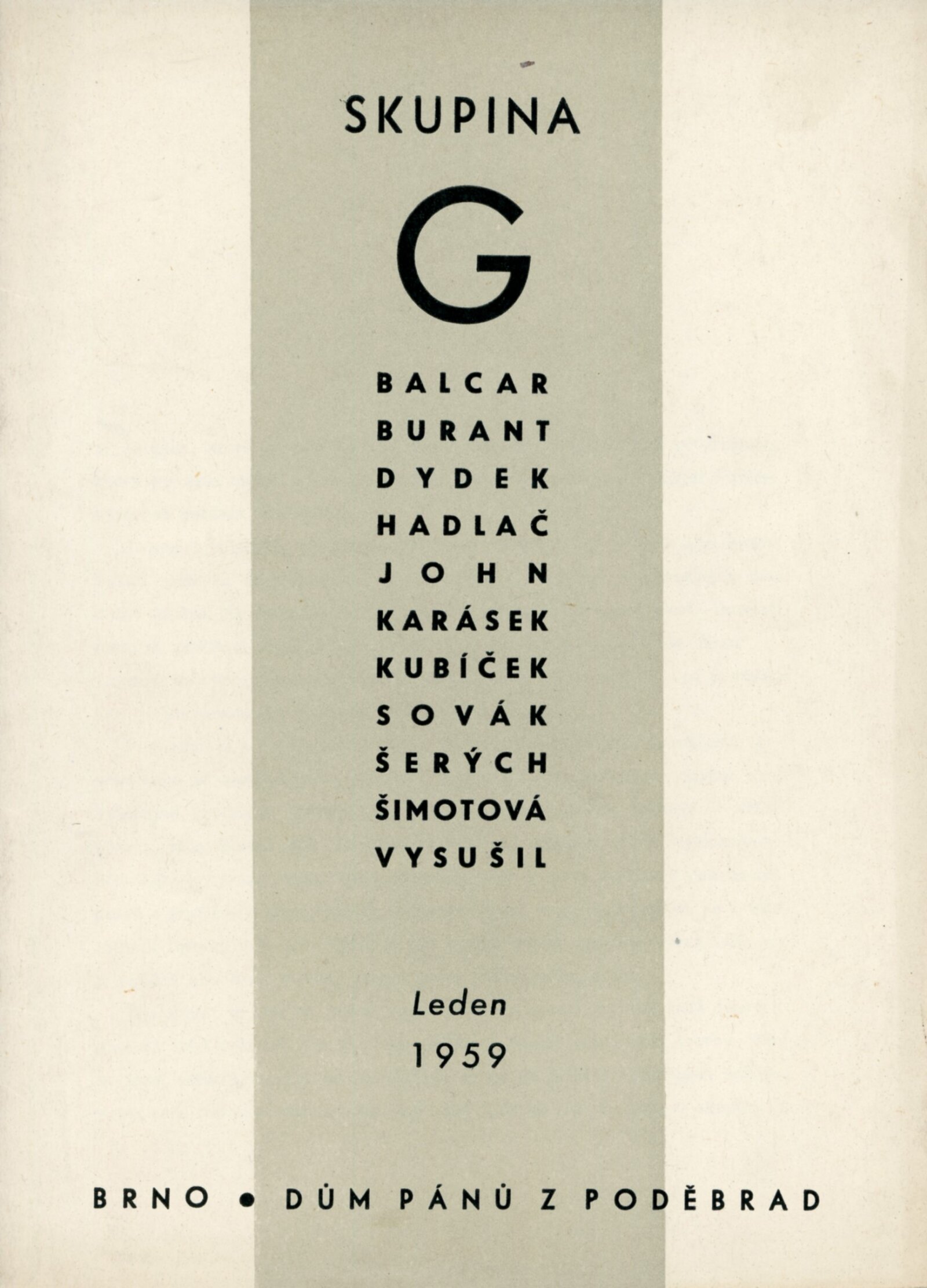 Skupina G: Dům umění města Brna / Dům pánů z Poděbrad, Kabinet grafiky, 3. výstava, 8. 1. – 1. 2. 1959 / Text: Miroslav Lamač. – Brno: ČFVU, 1959. – 20 s., obr., DPK 22