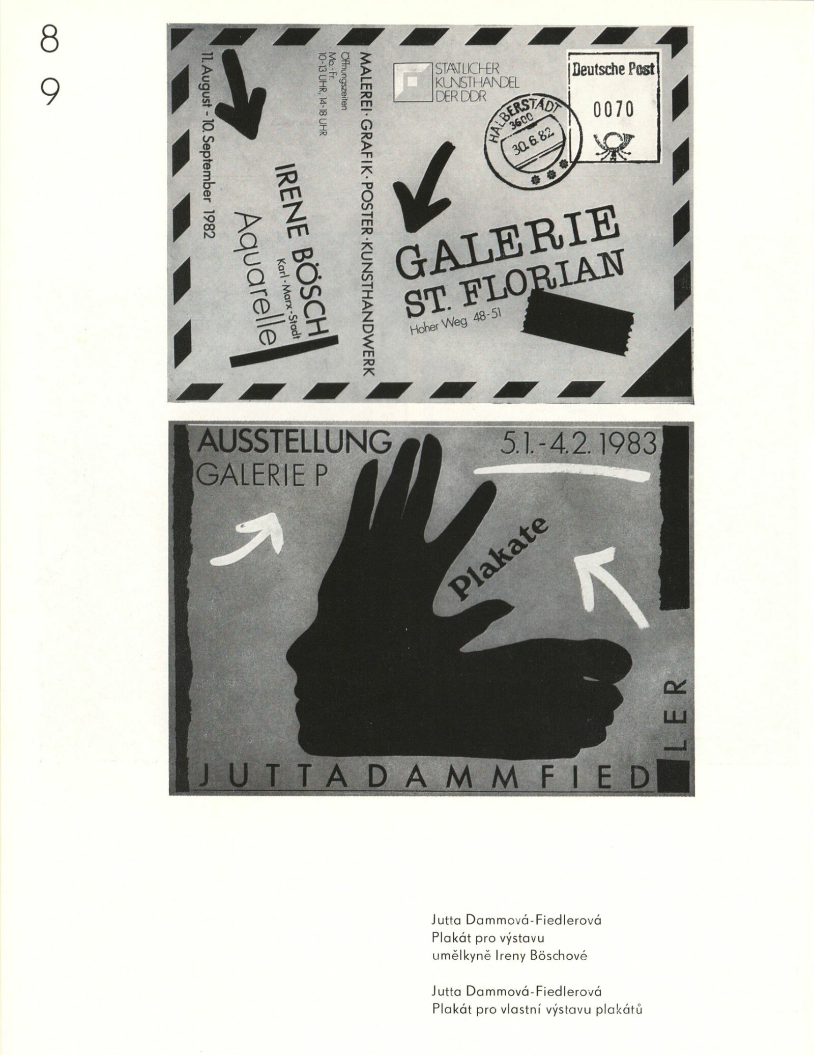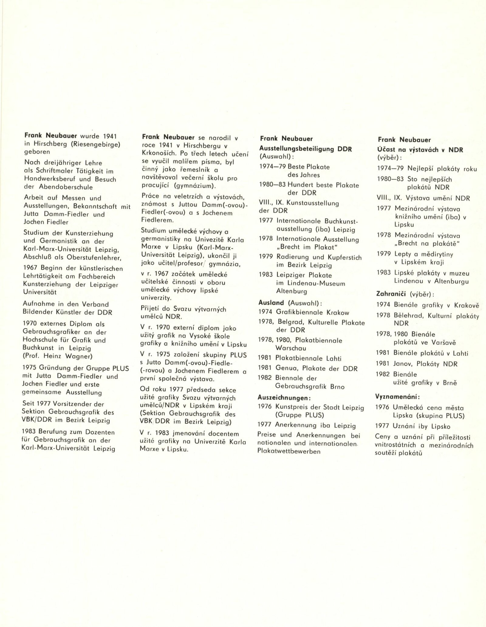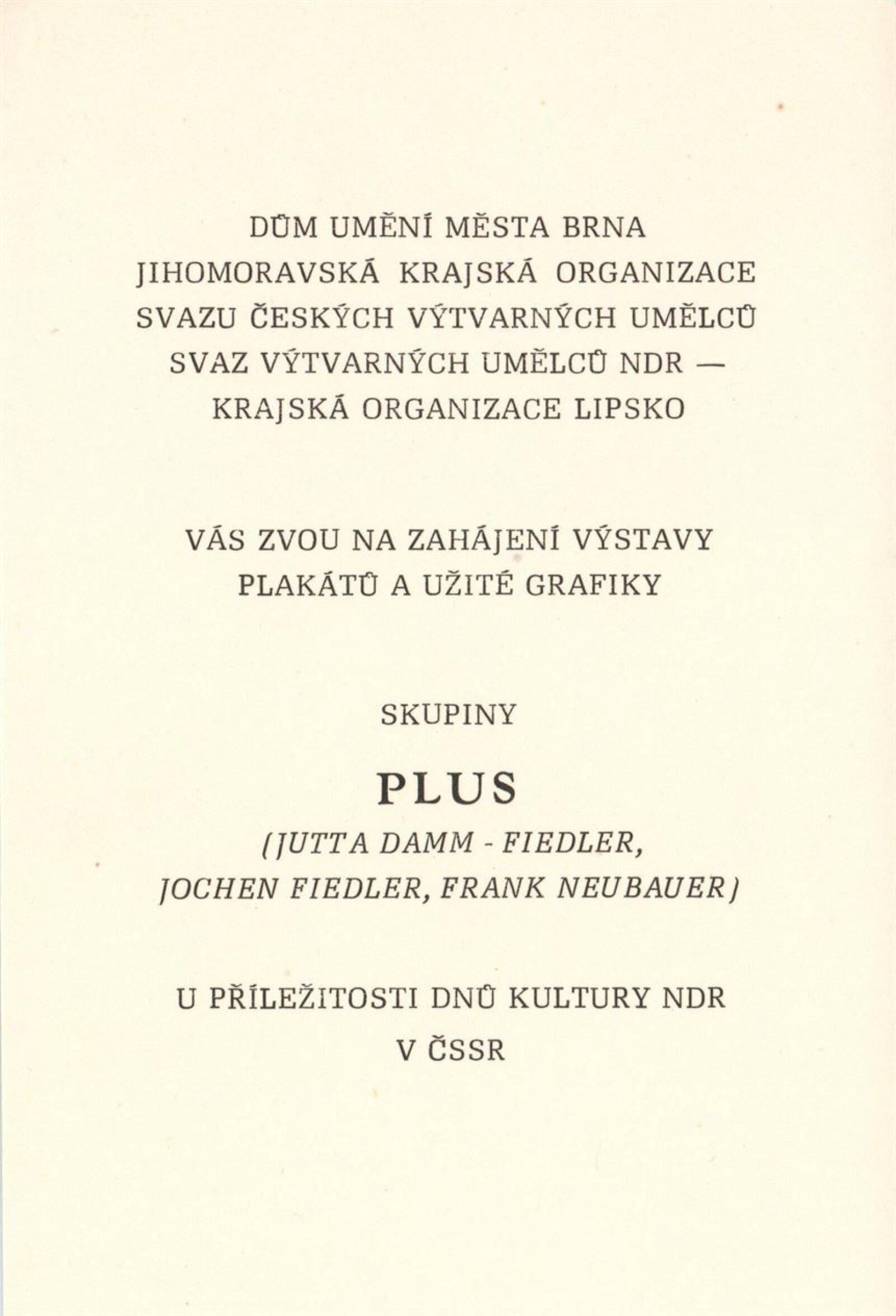 Skupina PLUS Lipsko v Brně (Jutta Damm-Fiedler, Jochen Fiedler, Frank Neubauer). Plakáty a užitá grafika: Dům umění, Galerie Jaroslava Krále, hala, 13. 9. – 9. 10. 1983 / Výstava u příležitosti Dnů kultury NDR v ČSSR. Text: Martin Marbach. – Leipzig: Rat des Bezirkes, Abt. Kultur, 1983. – 48 s., obr., portréty, životní data, název a text též německy, DU 766. – MG