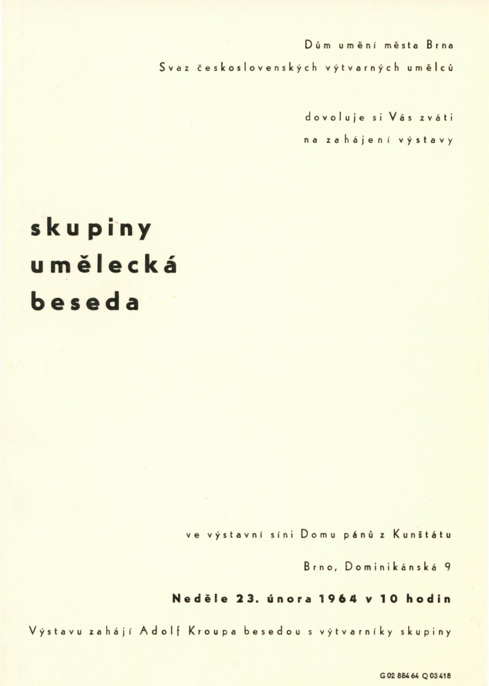 Skupina Umělecká beseda: Dům umění města Brna / Dům pánů z Kunštátu, 1. patro, 23. 2. – 30. 3. 1964 / Převzatý katalog. Skupina Umělecká beseda: Výstavní síň Mánes, Praha, leden–únor 1964 / Text: M. Míčko. – Praha: SČSVU, 1964. – 12 s., obr., seznam vystavených děl 4 s., DPK 218