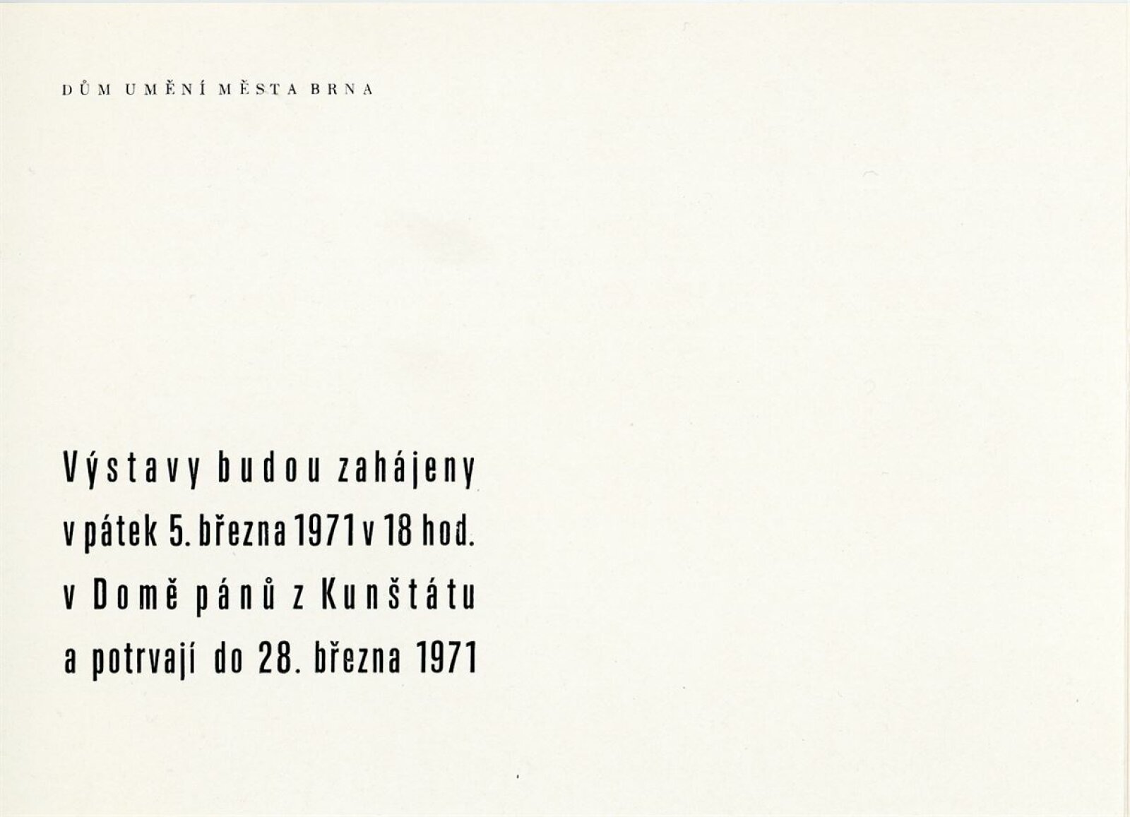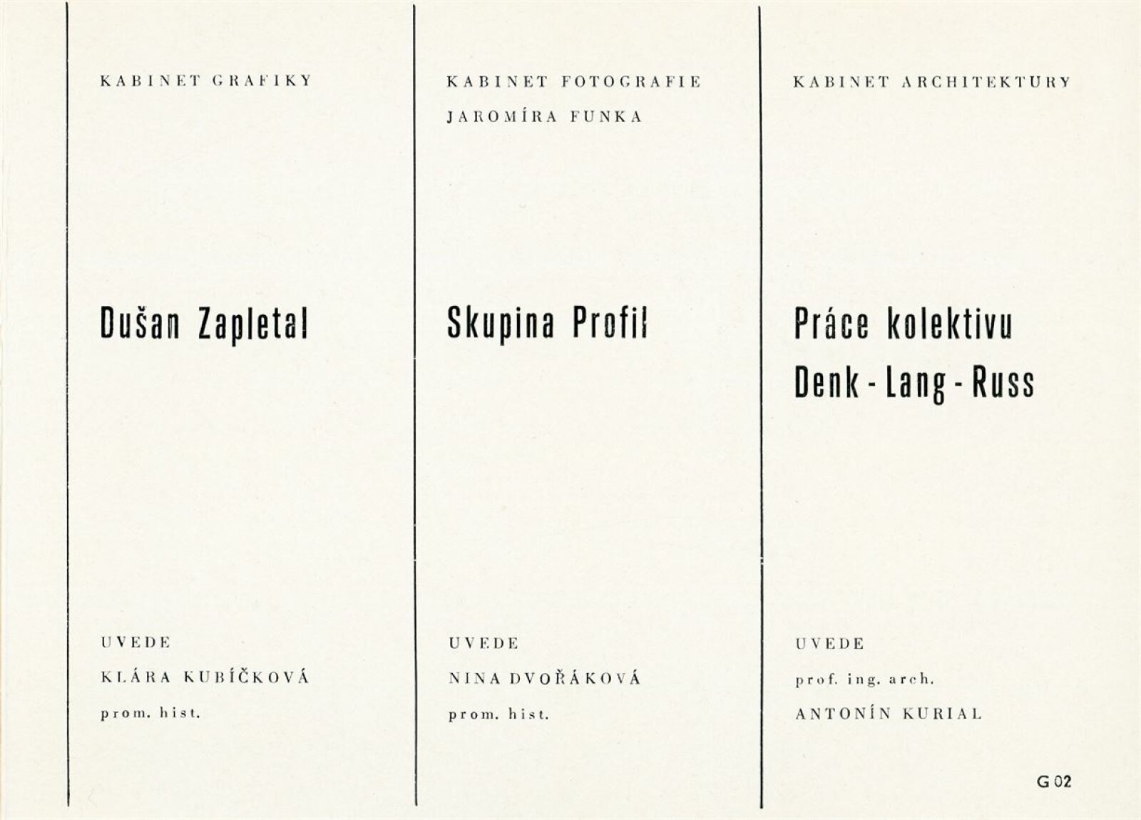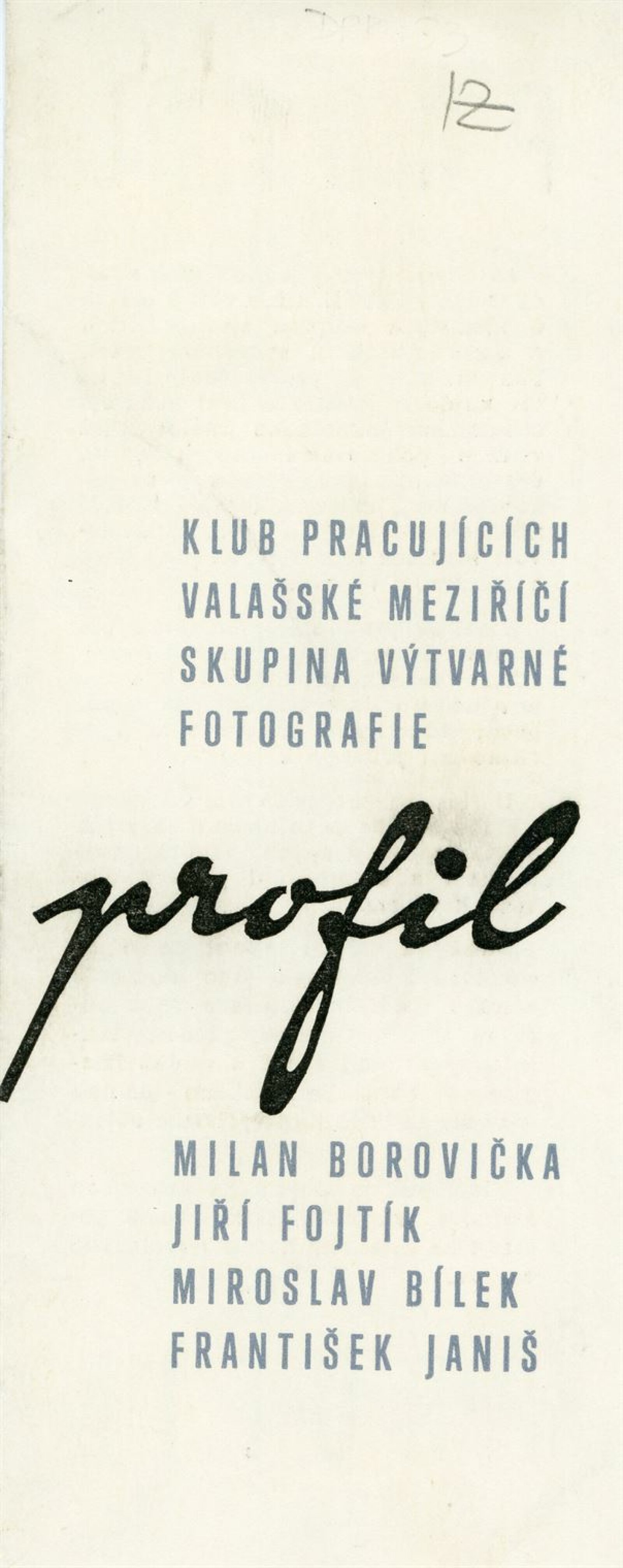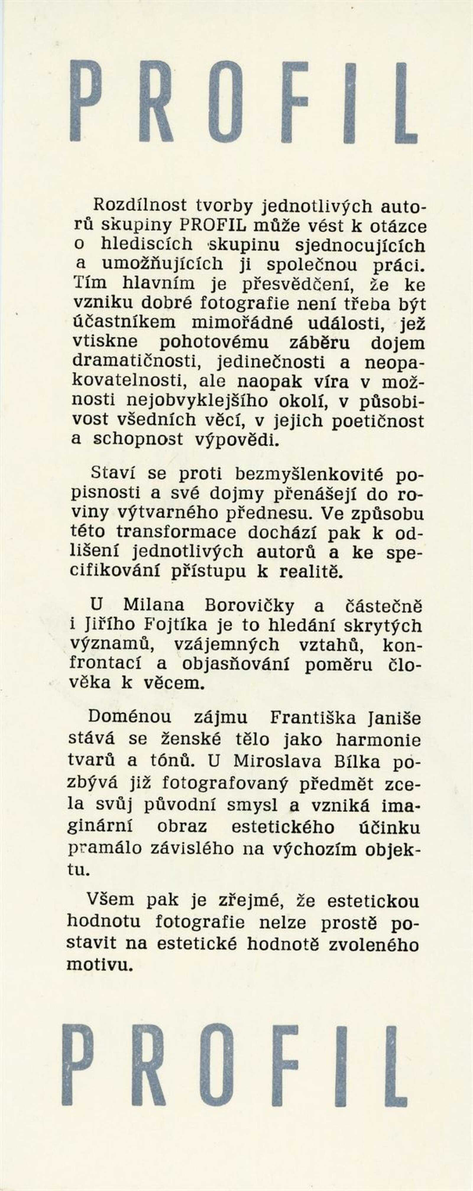 Skupina výtvarné fotografie Profil, KP Valašské Meziříčí: Dům umění města Brna / Dům pánů z Kunštátu, 111. výstava Kabinetu fotografie Jaromíra Funka, 5. 3. – 28. 3. 1971 / Text: Profil. – Valašské Meziříčí: Skupina výtvarné fotografie Profil, 1971. – skládačka, 6 s., DPK 464. –MG