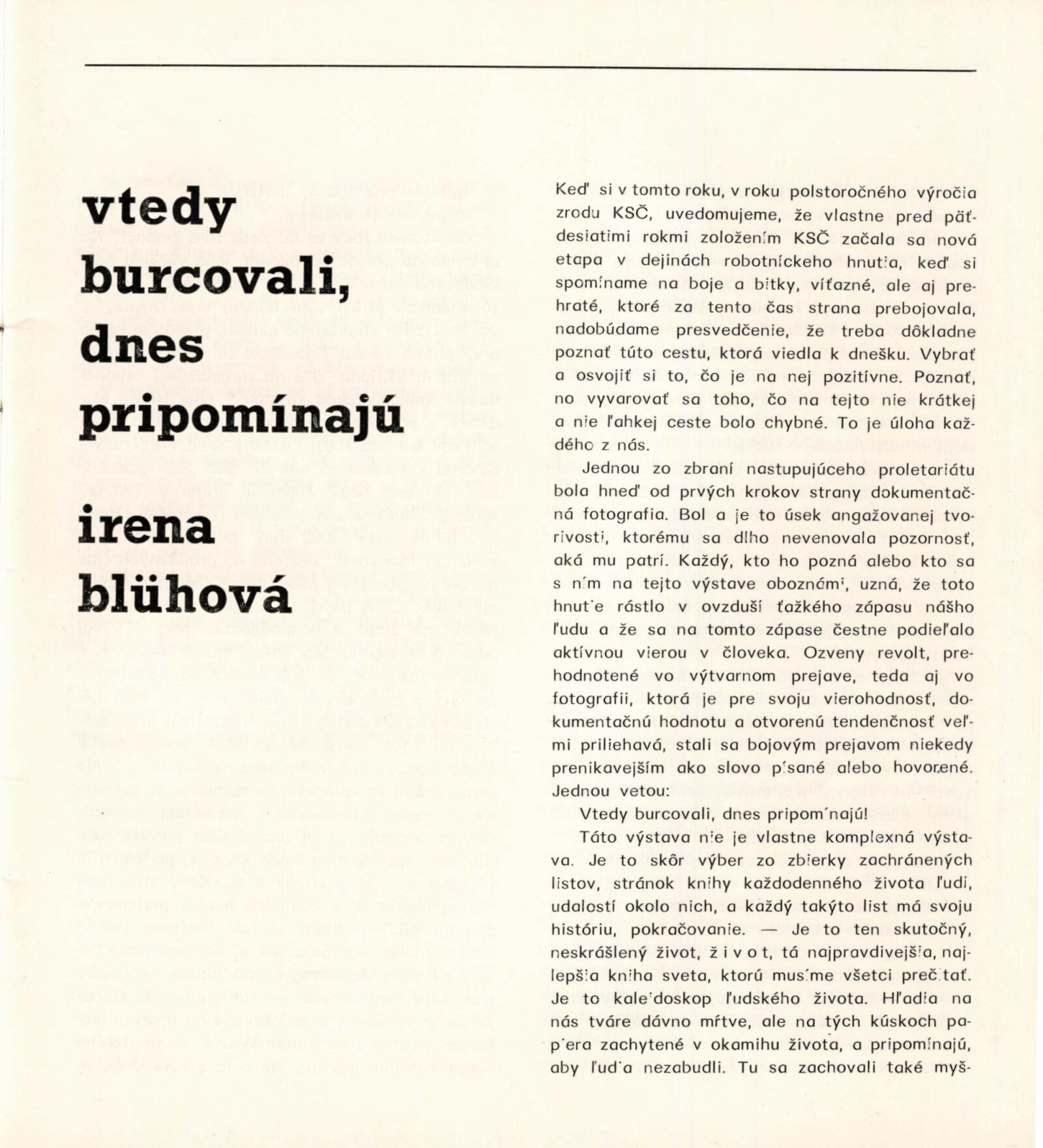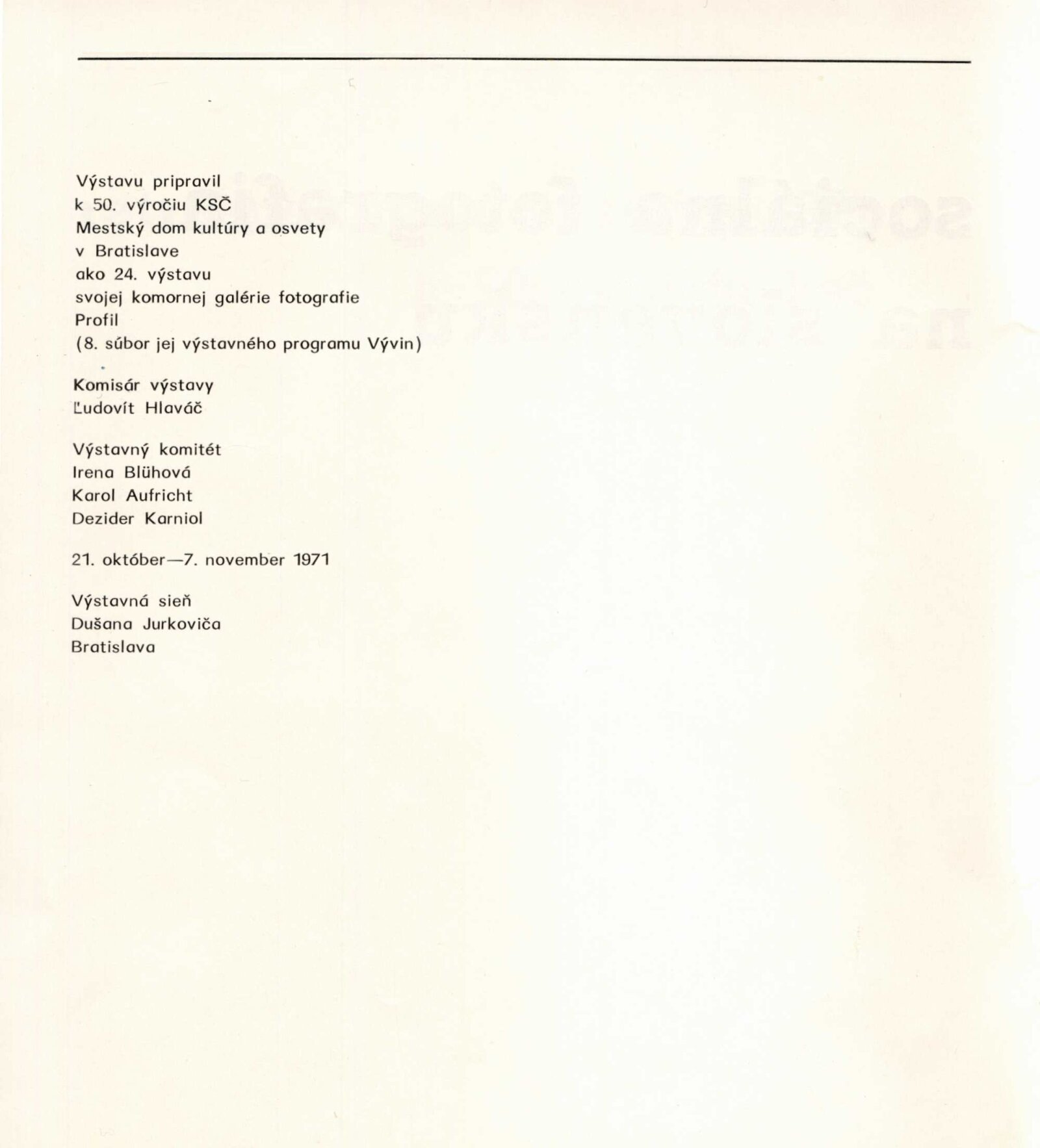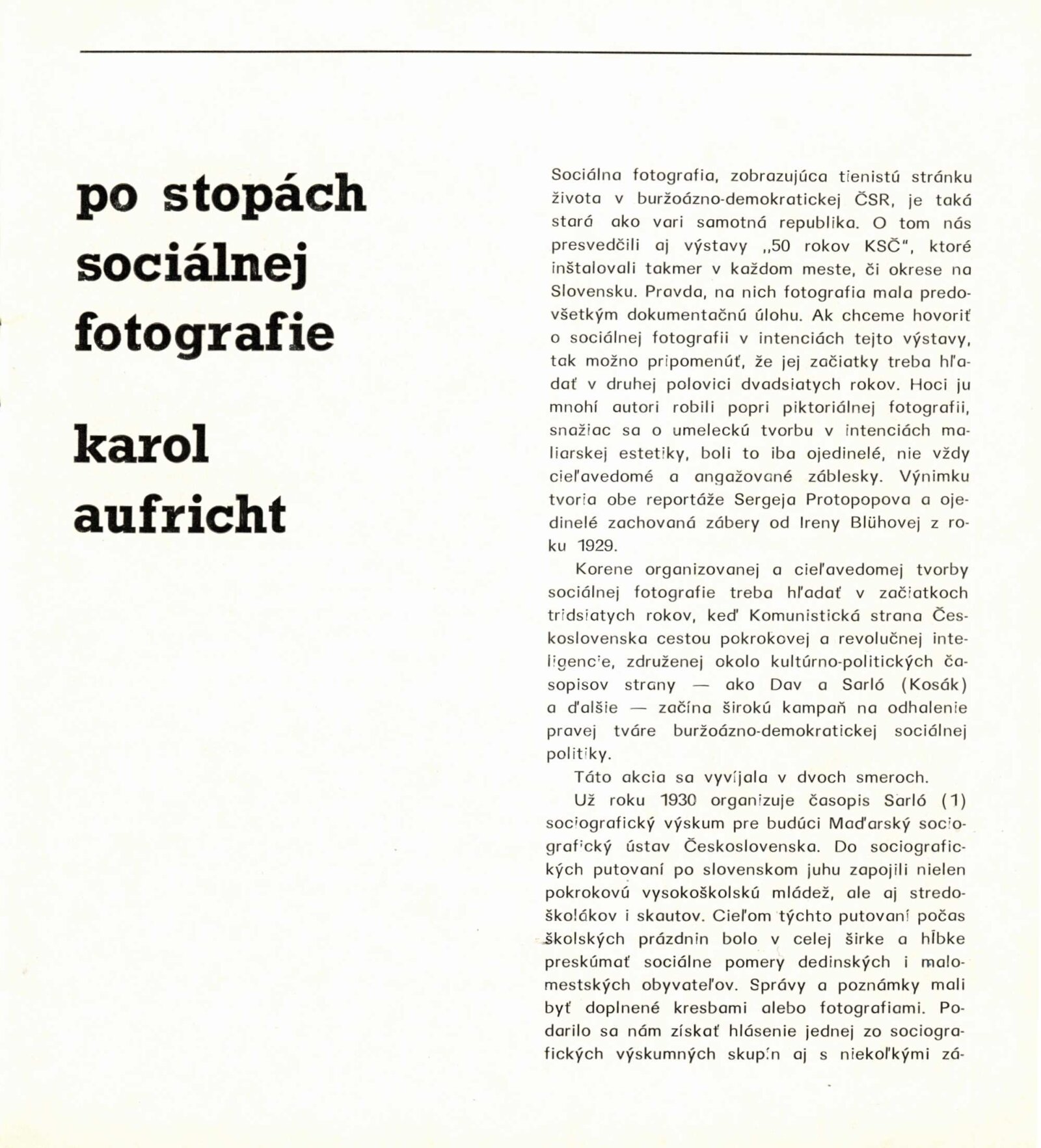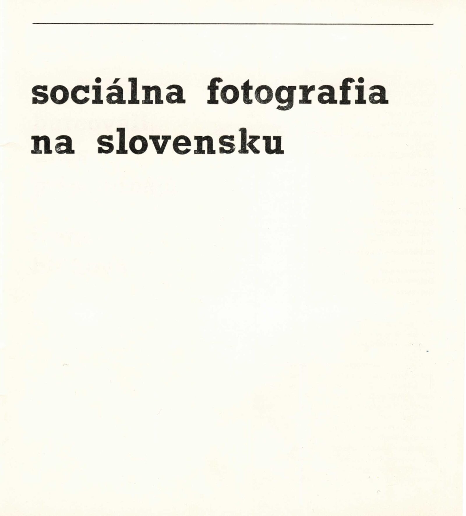 Sociální fotografie na Slovensku: hala DU 3. 4. – 27. 4. 1973 / Převzatý katalog Sociálná fotografia na Slovensku. Retrospektívna výstava 1971 k 50. výročiu KSČ: Výstavná sieň Dušana Jurkoviča Bratislava 21. 10. – 7. 11. 1971 / Text: Irena Blühová, Karol Aufricht, Ľudovít Hlaváč. Bratislava: Mestský dom kultury a osvety, 1971. – 58 s., obr. – DU 588