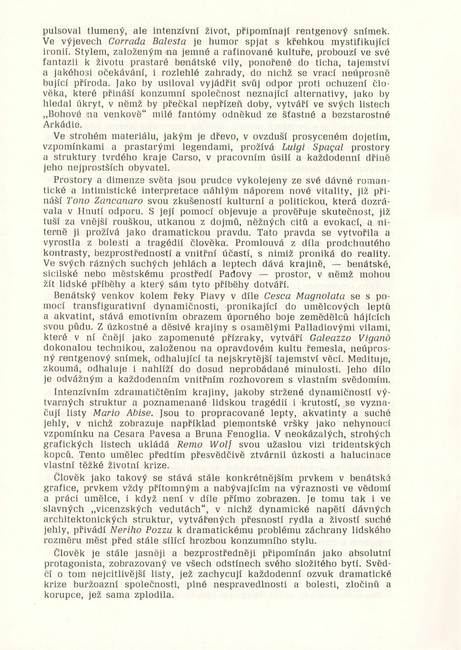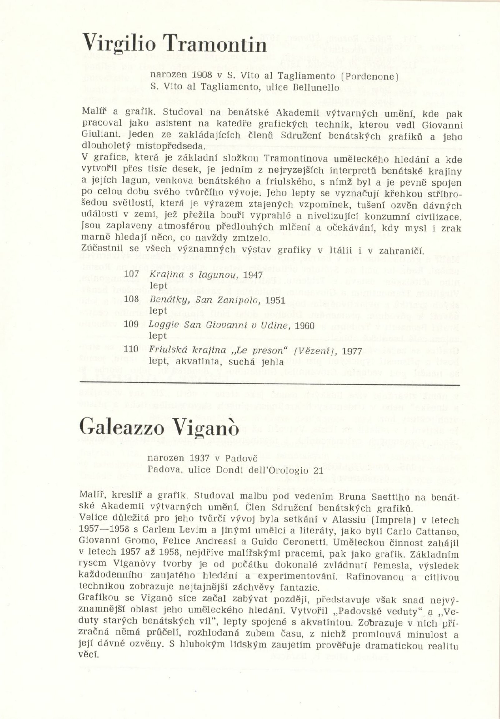 Současná benátská grafika: Dům umění města Brna, 1. patro, 16. 10. – 17. 11. 1985 / Převzatý katalog. Současná benátská grafika: Královský letohrádek, Praha, březen–duben 1985 / Texty: Vladimír Carlon, Giorgio Trentin. – Praha: Národní galerie, 1985. – 61 s., obr., životopisy vystavujících, DU 804. – MZK