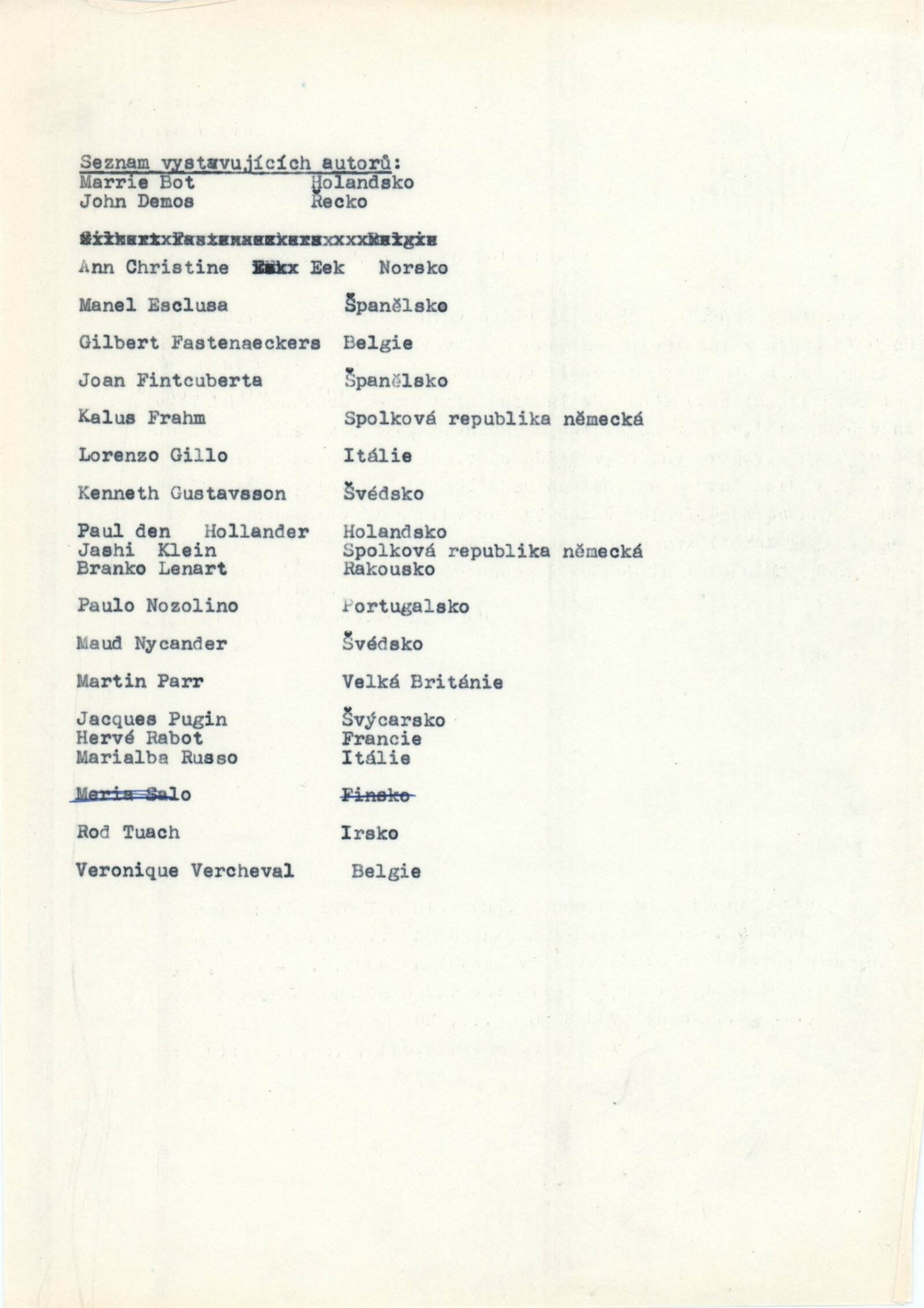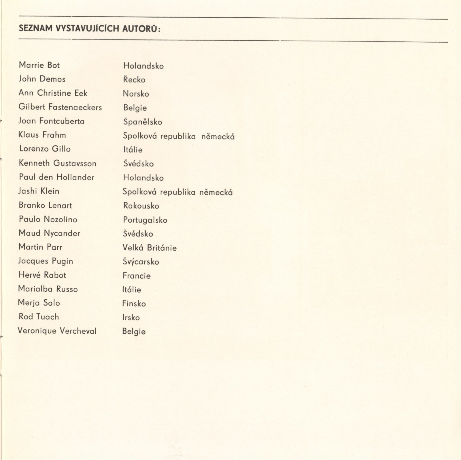 Marrie Bot, John Demos, Ann Christine Eek, Gilbert Fastenaeckers, Joan Fontcuberta, Klaus Frahm, Lorenzo Gillo, Kenneth Gustavsson, Paul den Hollander, Jashi Klein, Branko Lenart, Paulo Nozolino, Maud Nycander, Martin Parr, Jacques Pugin, Hervé Rabot, Marialba Russo, Merja Salo, Rod Tuach, Veronique Vercheval