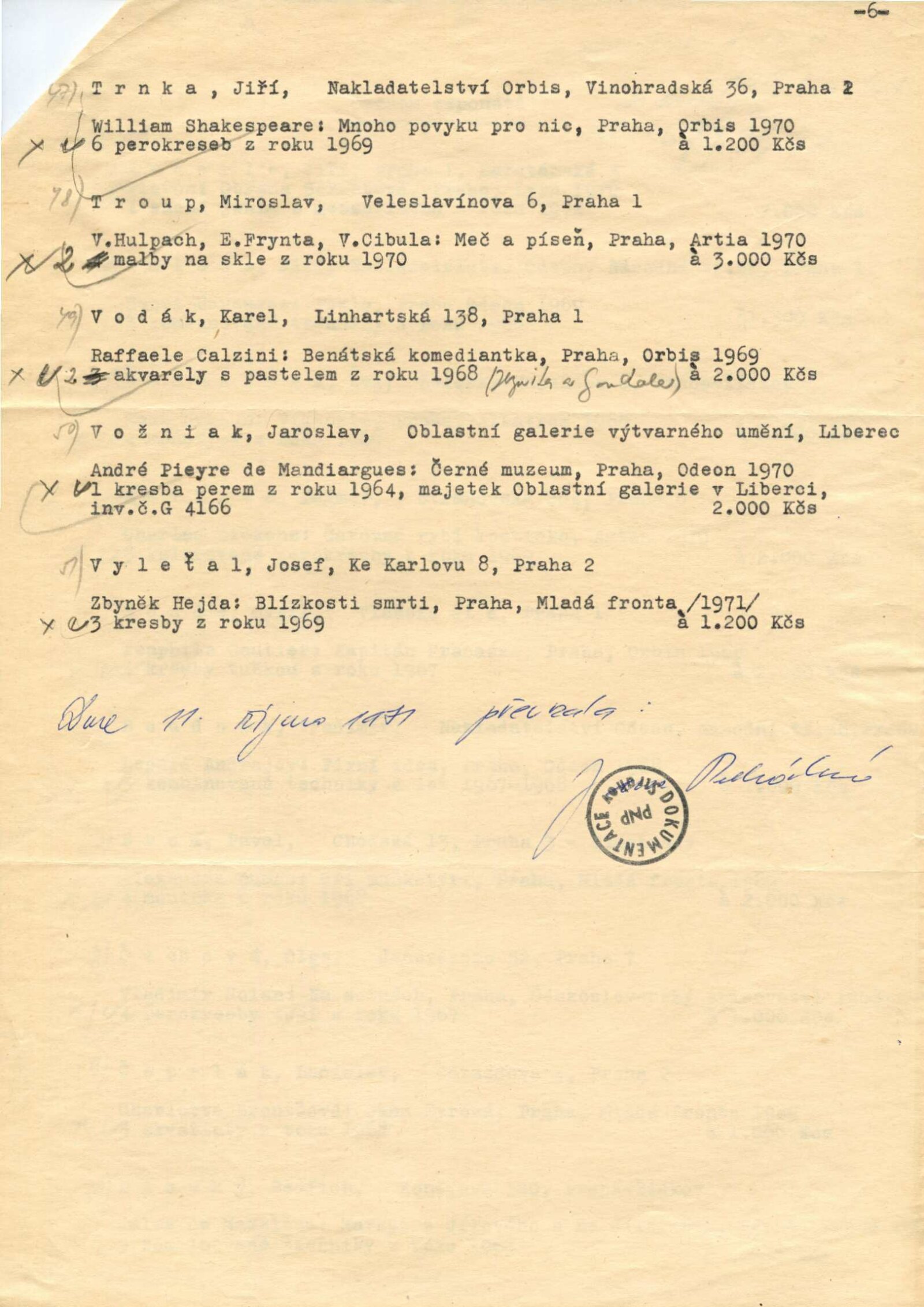 seznam vystavených děl, smlouva k výstavě, fotografie výstavy v barokním sále Místodržitelského paláce, strojopis básní Vladimíra Holana a Oldřicha Mikuláška, provozní korespondence, reverzy, žádost o povolení výstavy, recenze v tisku, pozvánka (PNP Praha), katalog (PNP Praha) a plakát (PNP Praha)