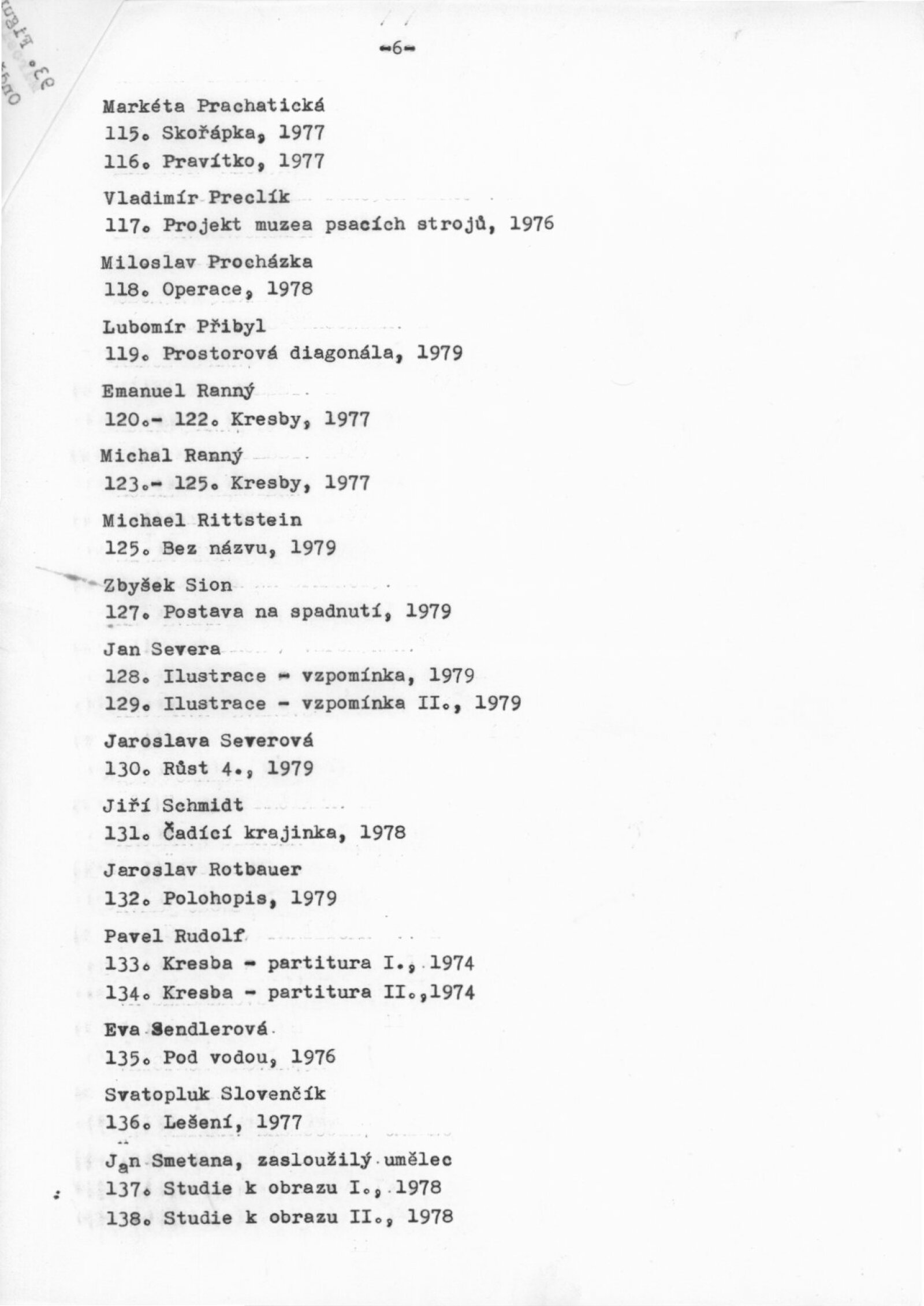pozvánka, fotografie kresby Jaroslava Šerýcha Studie k obrazu (1977), průvodní dopis ředitele DU s výzvou k účasti na výstavě, přihlášky k výstavě, seznamy umělců a děl, biografické údaje umělců (podklady pro katalog), protokol z jednání závěrečné poroty k výstavě, seznam porotou vybraných umělců, vyplněné přihlášky výtvarníků, provozní korespondence (autoři, schválení autorů a pokyny SČVU – 26. 3. 1980, dopis 10. 3. 1980, žádost o povolení výstavy), potvrzení o převzetí děl, recenze v tisku