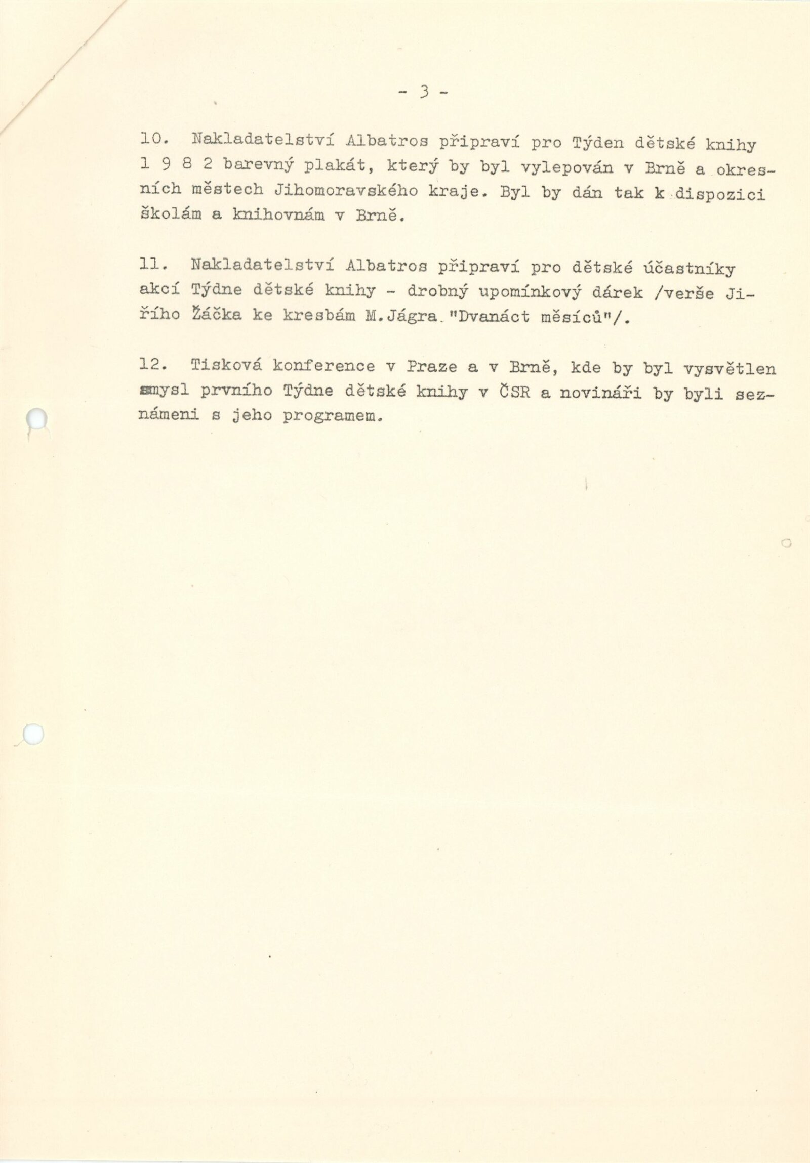 návrh programu Týdne dětské knihy, prezenční listina tiskové konference k výstavě, žádost o schválení a registraci výstavy, rámcový plán činnosti SPMP, provozní korespondence s nakladatelstvím Albatros, žádost o povolení výstavy, recenze v tisku, publikace Jiřího Žáčka a Miloslava Jágra Dobrý den vydané k Týdnu dětské knihy