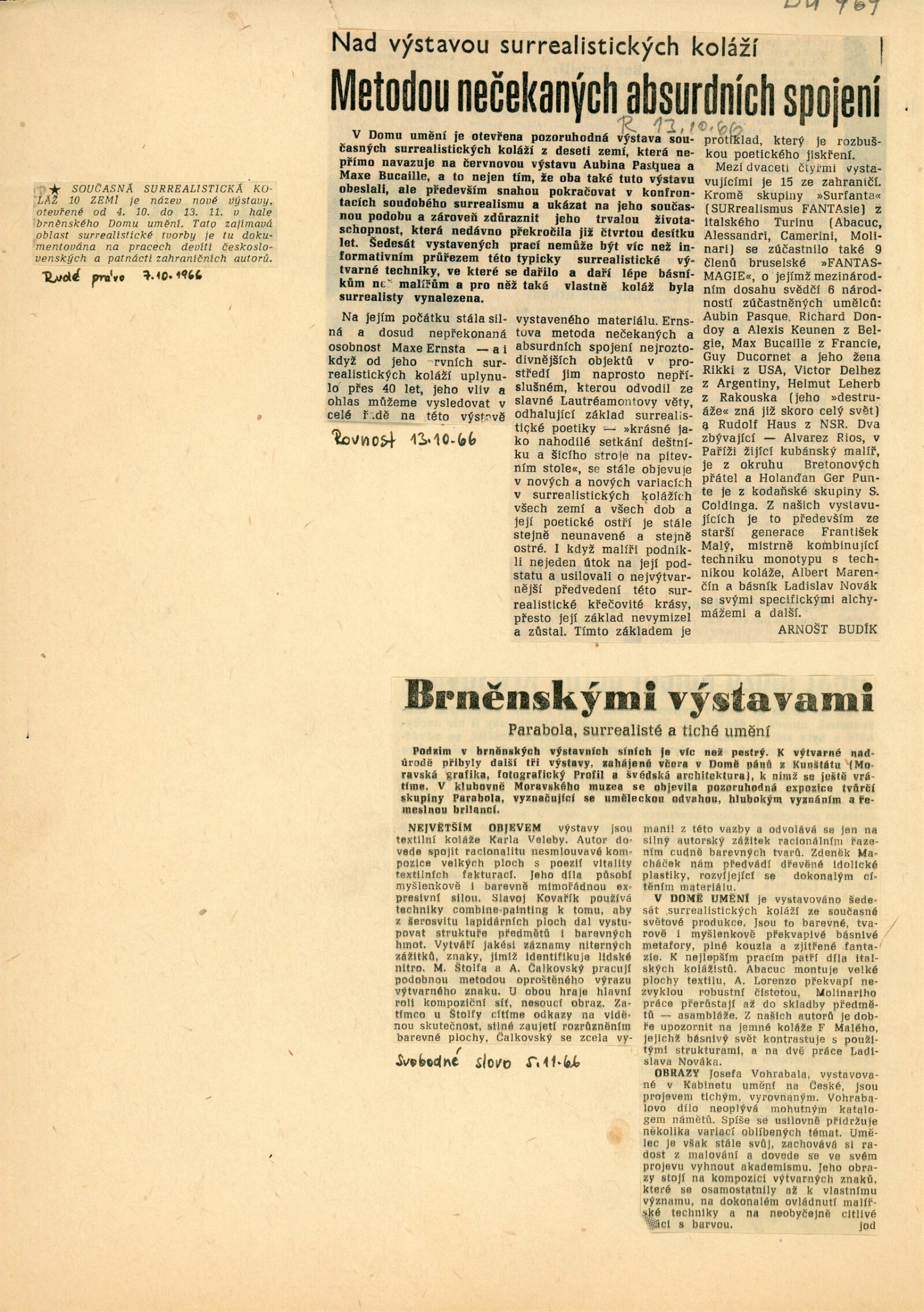 Současná surrealistická koláž 10 zemí: Dům umění města Brna, hala, 4. 10. – 12. 11. 1966 / Texty: André Breton, Arnošt Budík. – Brno: DUmB, - 4 s. / Současná surrealistická koláž: České Budějovice, Dům umění, únor 1967 / Rozmnožený katalog tištěný pro výstavu v Českých Budějovicích. Text: André Breton, Arnošt Budík. – Hluboká nad Vltavou: Alšova jihočeská galerie, 1967. – 16 s., obr., DU 469. – MZK; MG