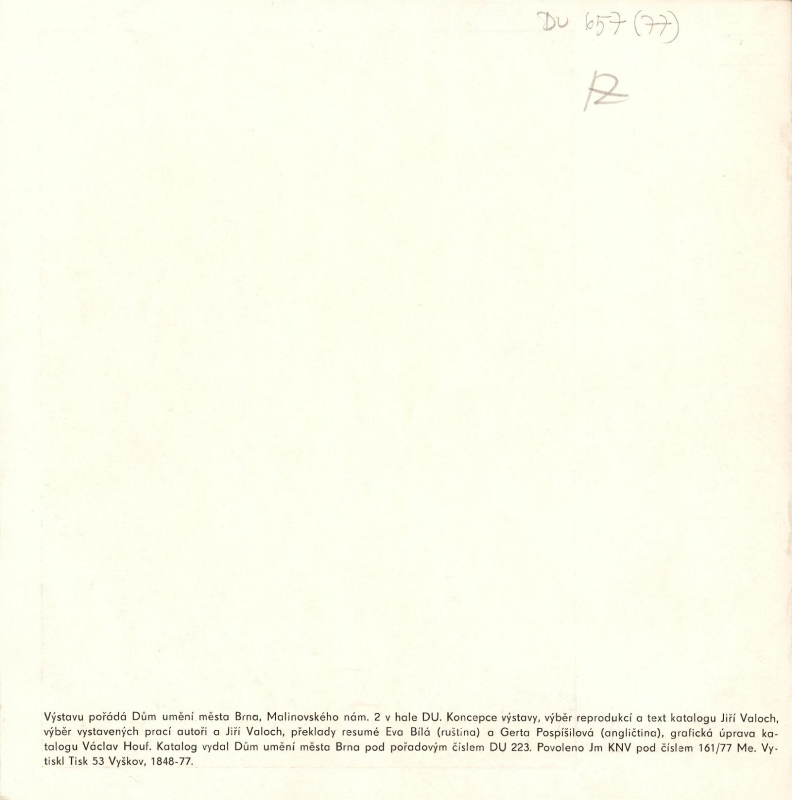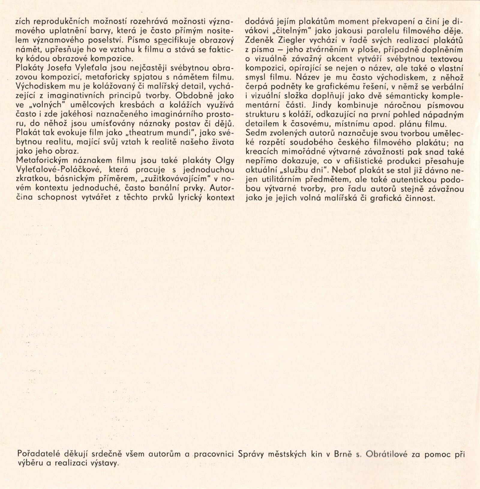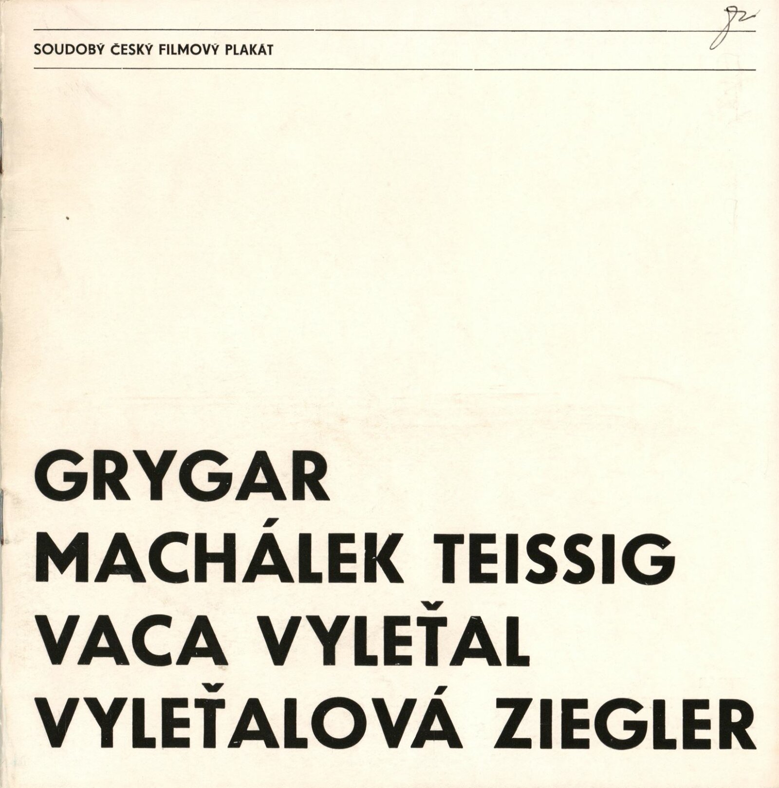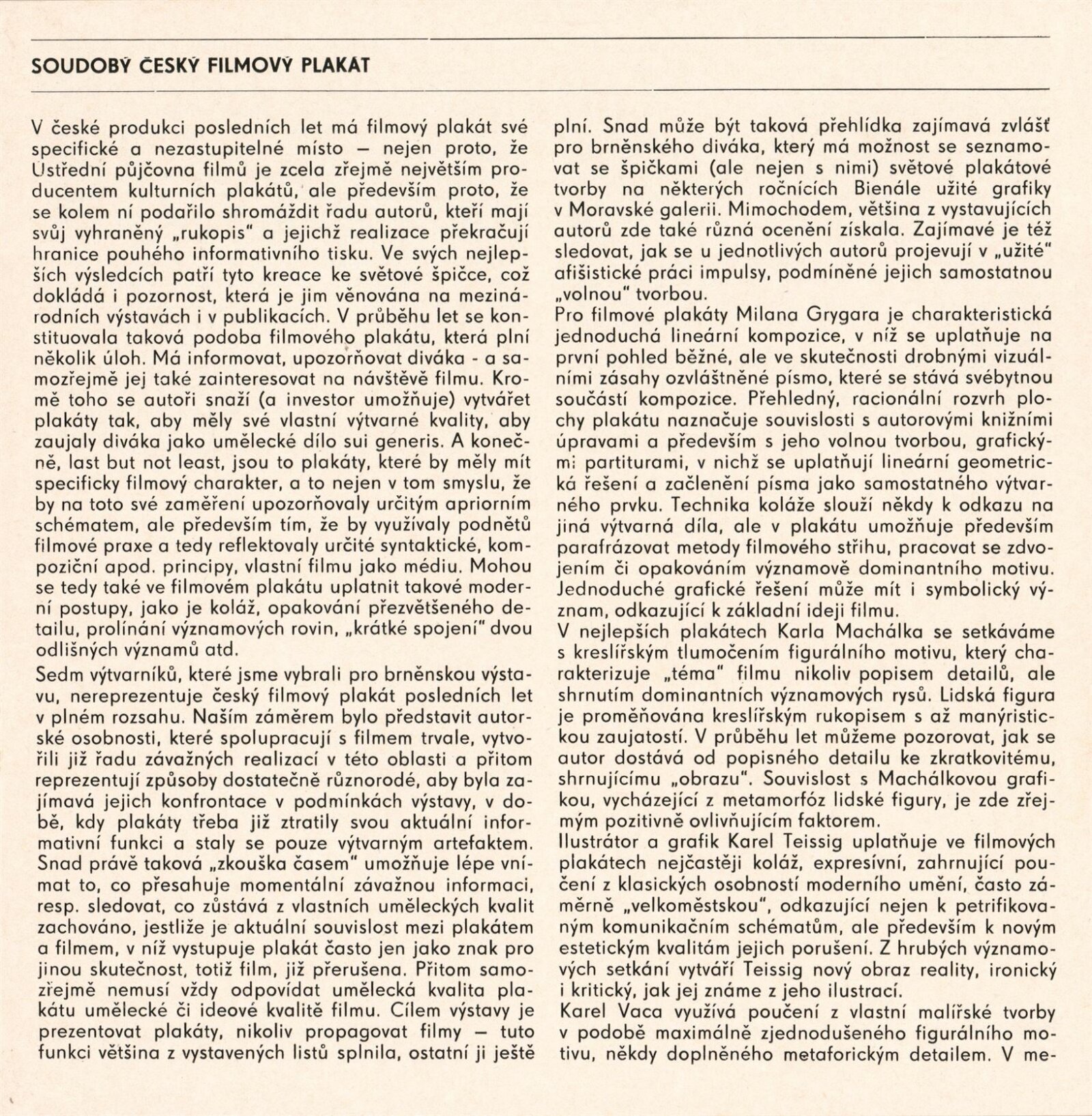Soudobý český filmový plakát. Milan Grygar, Karel Machálek, Karel Teissig, Karel Vaca, Josef Vyleťal, Olga Vyleťalová, Zdeněk Ziegler: Dům umění města Brna, hala, 3. 6. – 10. 7. 1977 / Text: Jiří Valoch. – Brno: DUmB, 1977. – 16 s., obr., životní data vystavujících, DU 657. – MZK; MG; MMB
