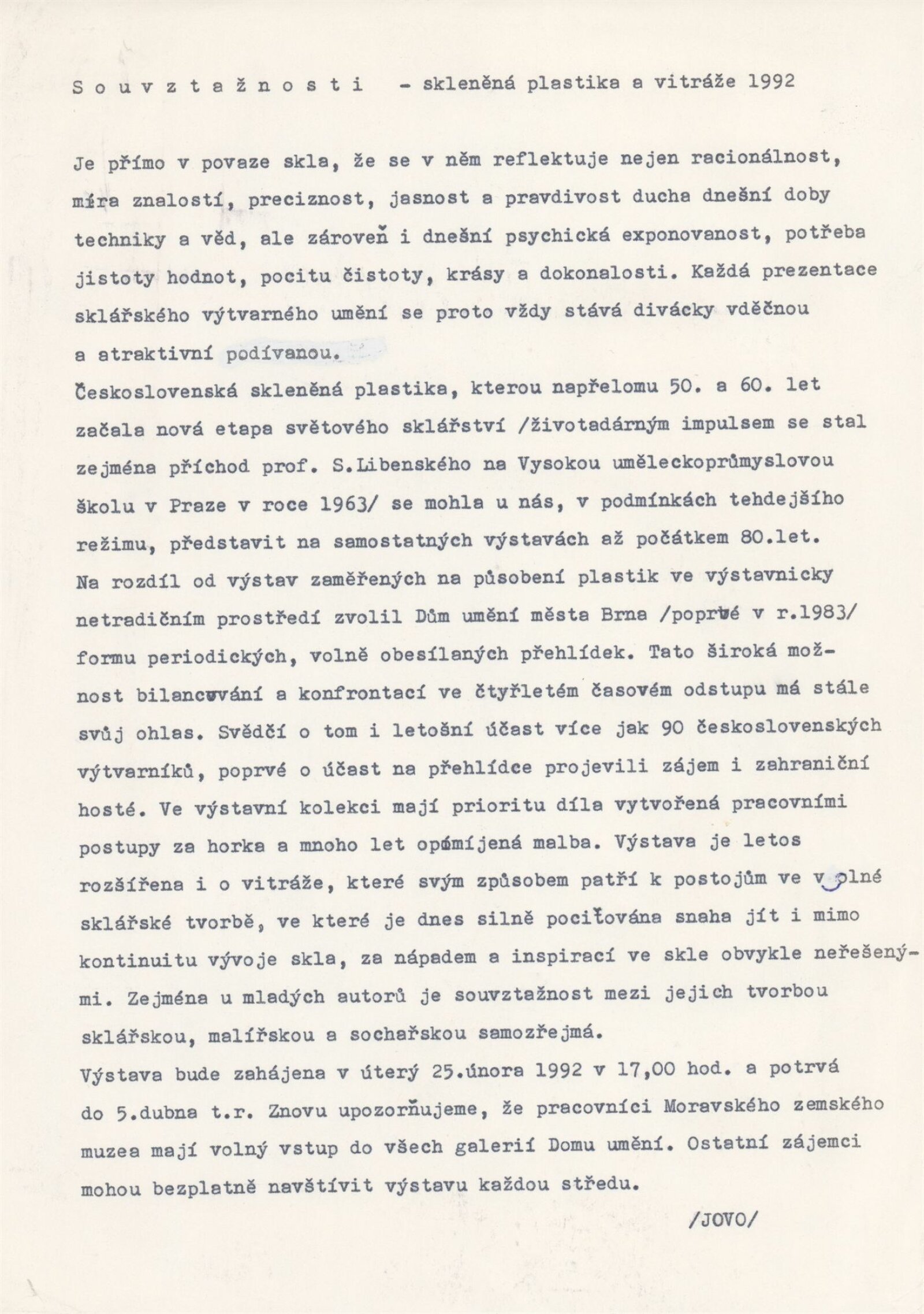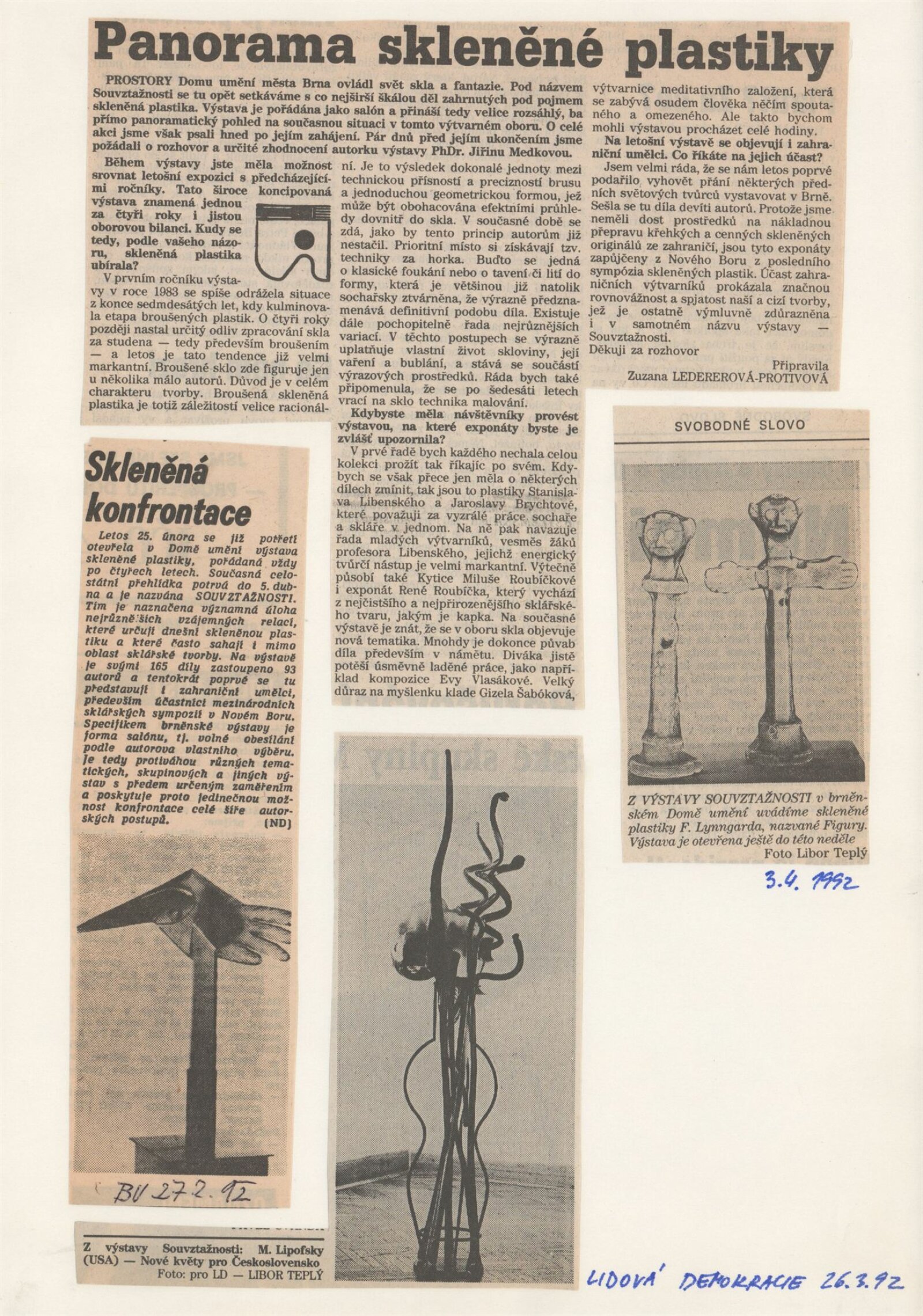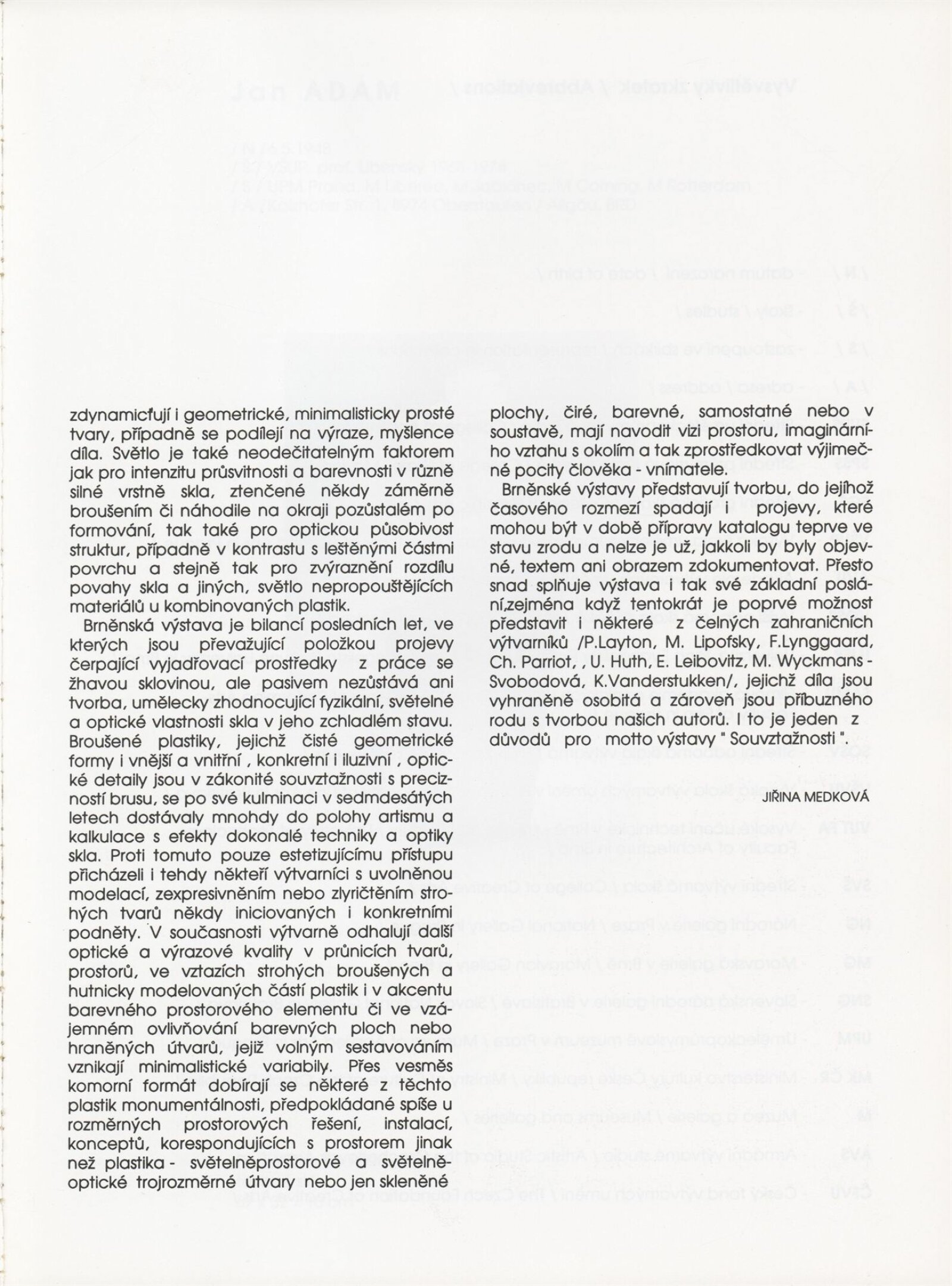 Souvztažnosti. Skleněná plastika a vitráže 1992: Dům umění města Brna, 25. 2. – 5. 4. 1992 / Text: Karel Moudrý, Jiřina Medková. – Brno: DUmB, 1992. – [96] s., obr., soupis vystavených exponátů [4] s., DU 918. – MZK