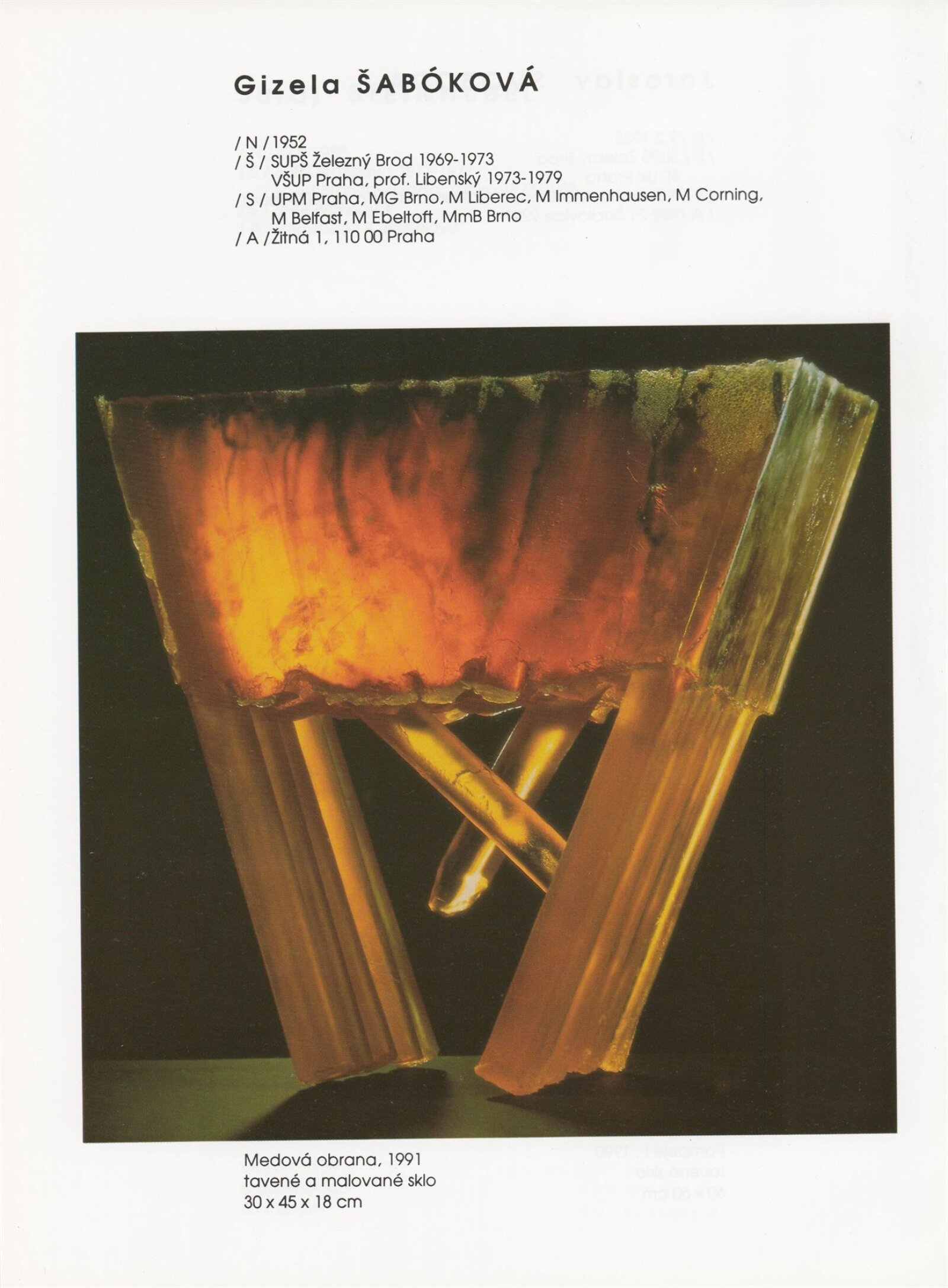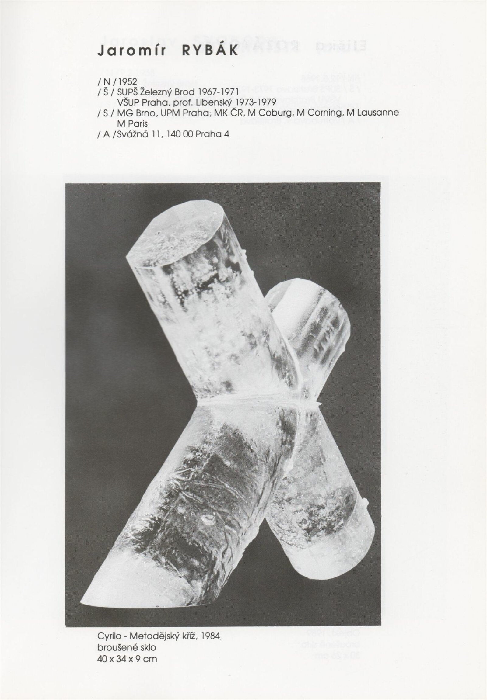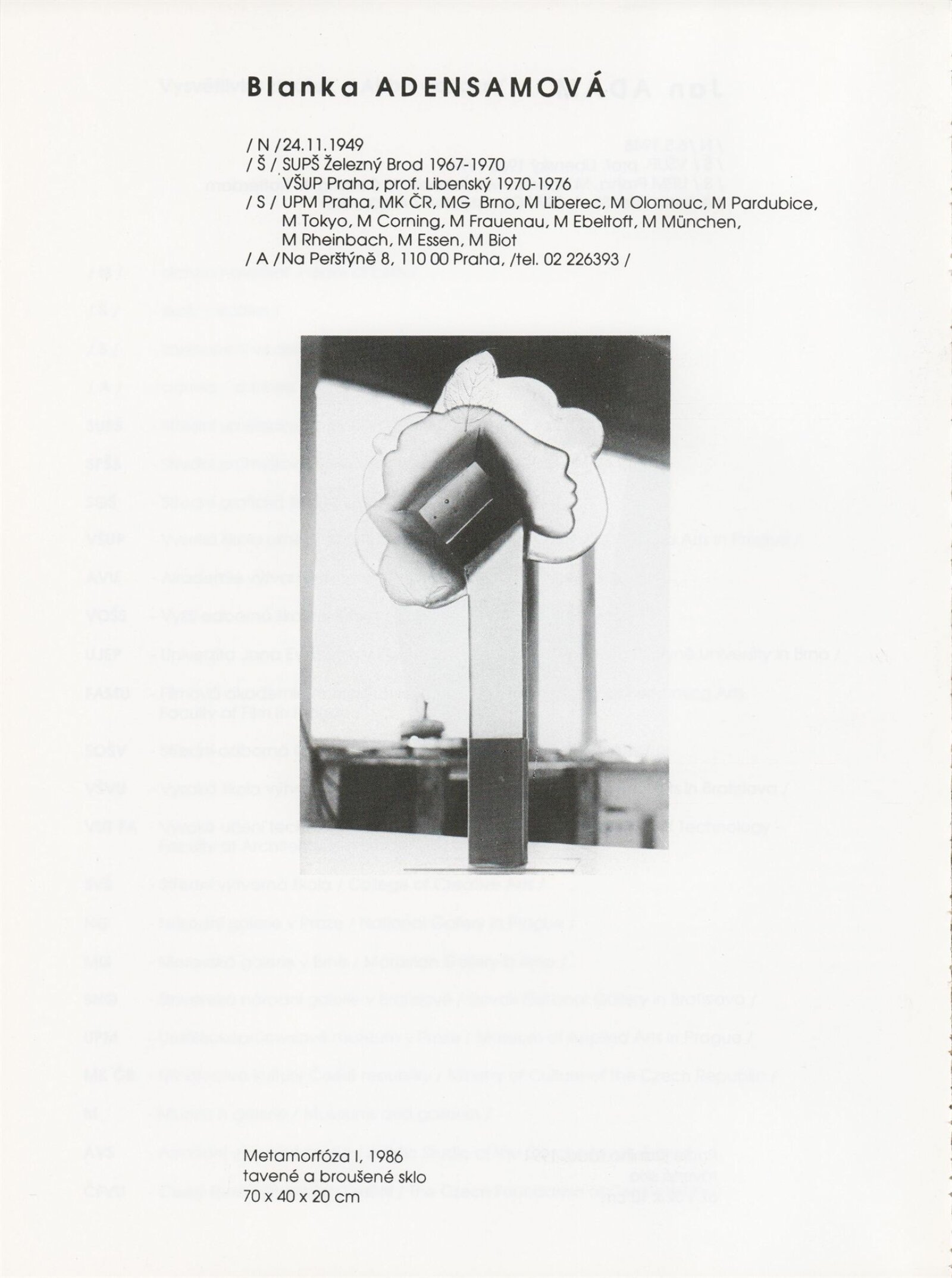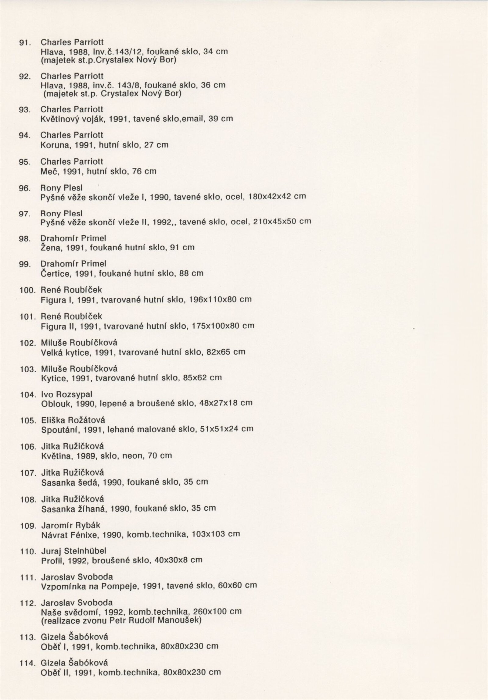 pozvánka, katalog, tisková zpráva, fotografie a negativy děl, záběr z výstavy, seznam děl, pojistný seznam, popisky prací, zápis ze schůzky, provozní a institucionální korespondence, nabídky repríz výstavy v zahraničí, potvrzení o převzetí děl, žádosti, dohody, smlouvy, reverzy, adresy, recenze v tisku, poznámky, katalogy - R. a M. Roubíčkovi., 1992, Eva Heřmanská, P. R. Manoušek, Interglas sympozium Nový Bor 1988, pozvánky k jiným výstavám