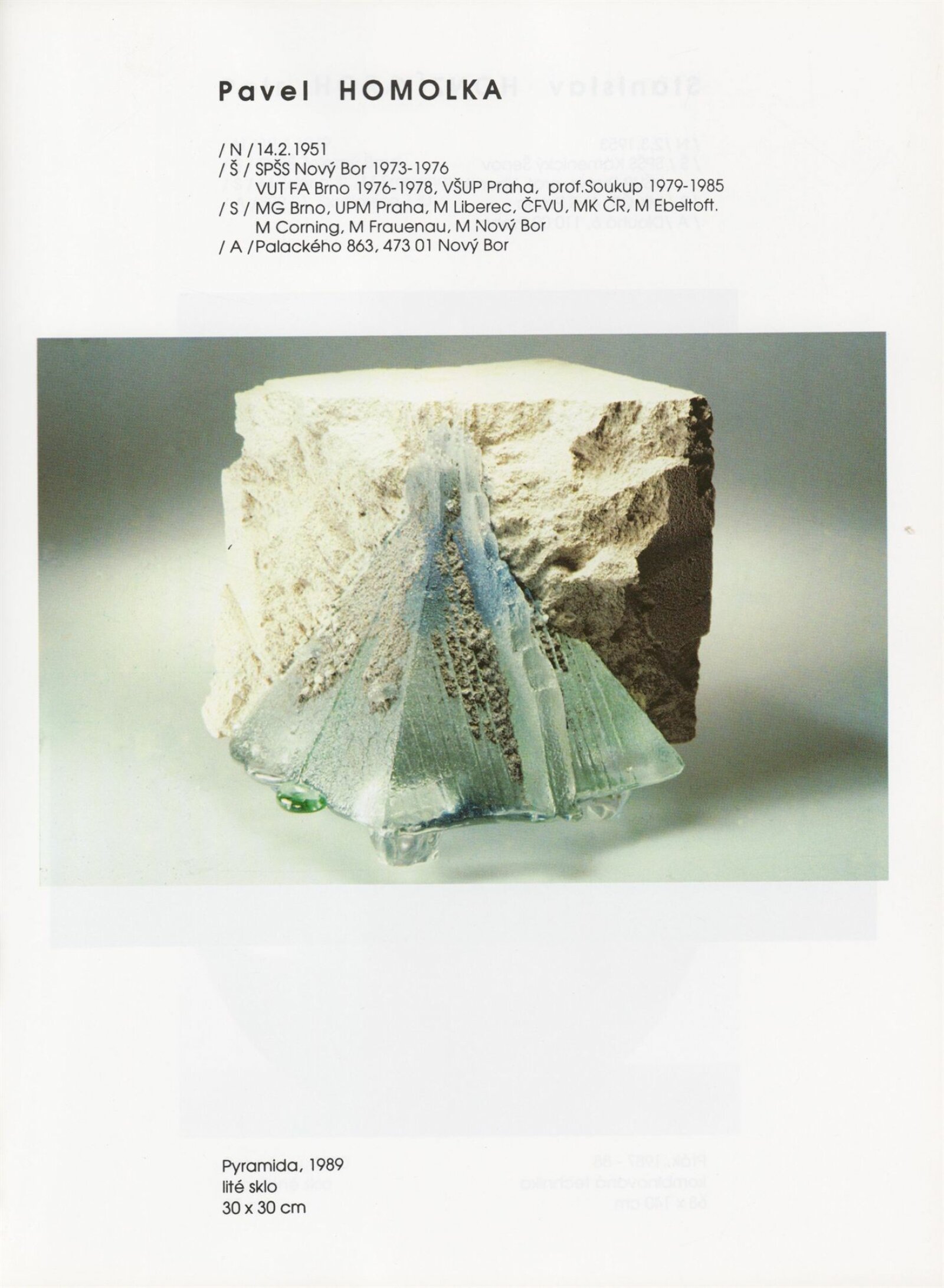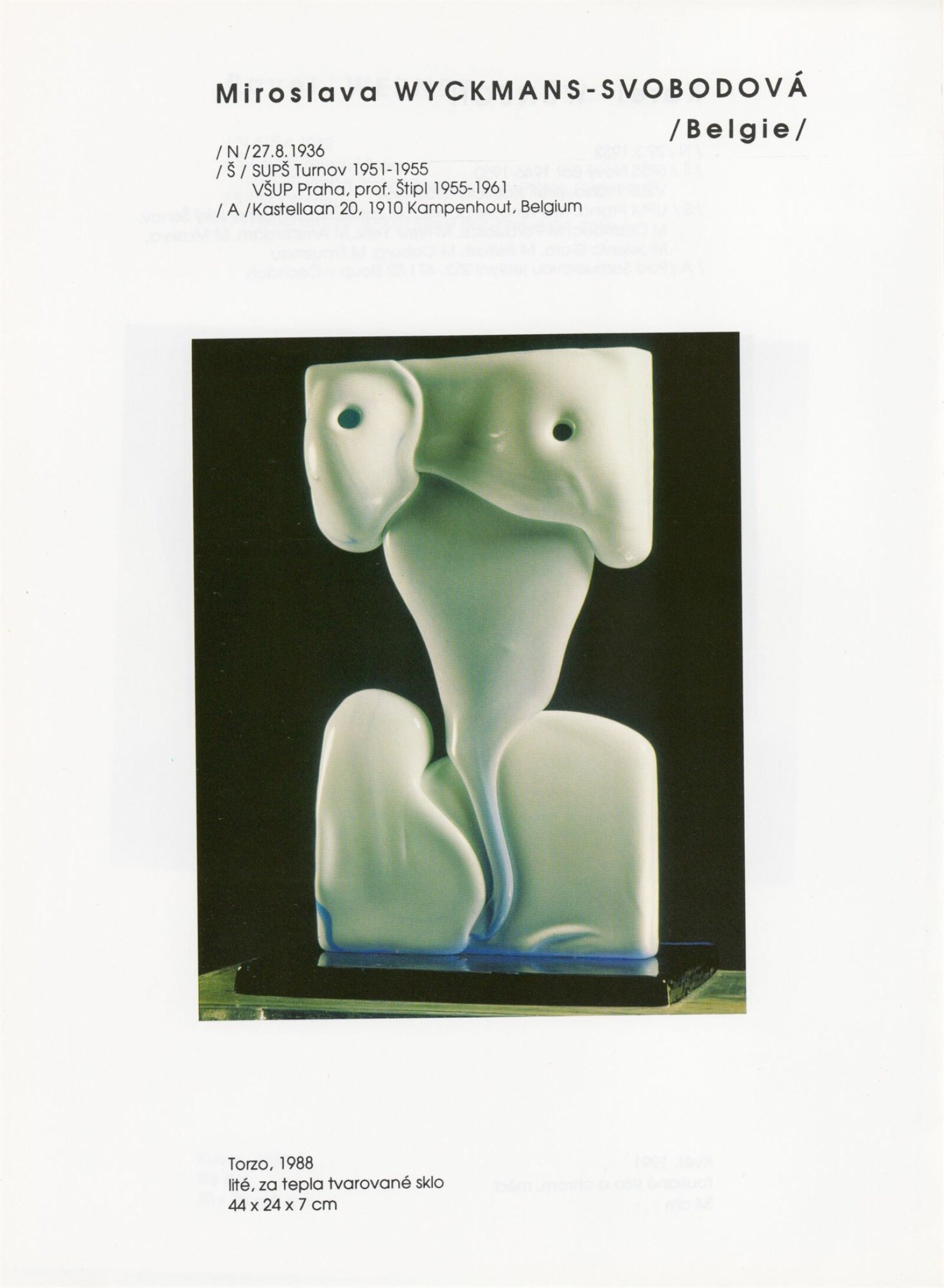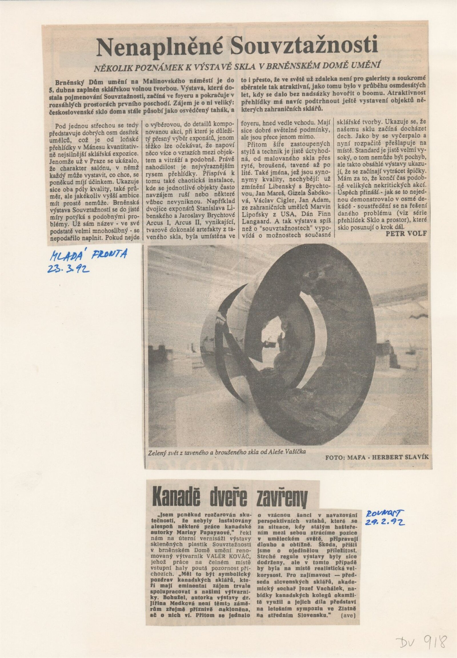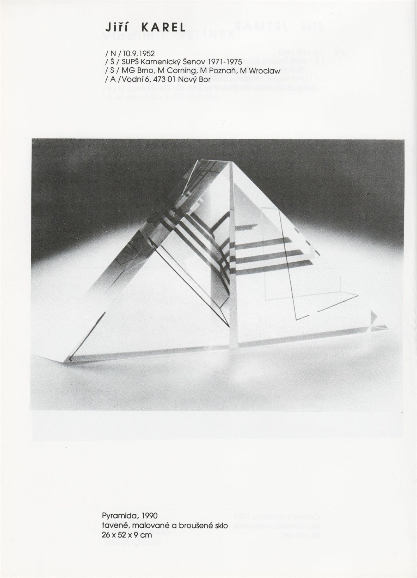 pozvánka, katalog, tisková zpráva, fotografie a negativy děl, záběr z výstavy, seznam děl, pojistný seznam, popisky prací, zápis ze schůzky, provozní a institucionální korespondence, nabídky repríz výstavy v zahraničí, potvrzení o převzetí děl, žádosti, dohody, smlouvy, reverzy, adresy, recenze v tisku, poznámky, katalogy - R. a M. Roubíčkovi., 1992, Eva Heřmanská, P. R. Manoušek, Interglas sympozium Nový Bor 1988, pozvánky k jiným výstavám