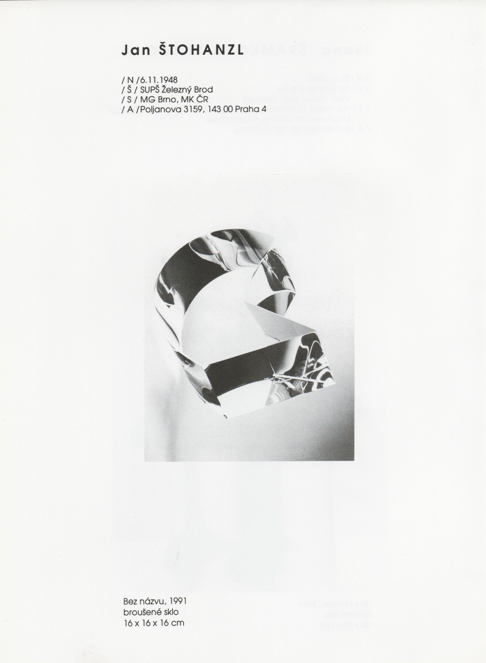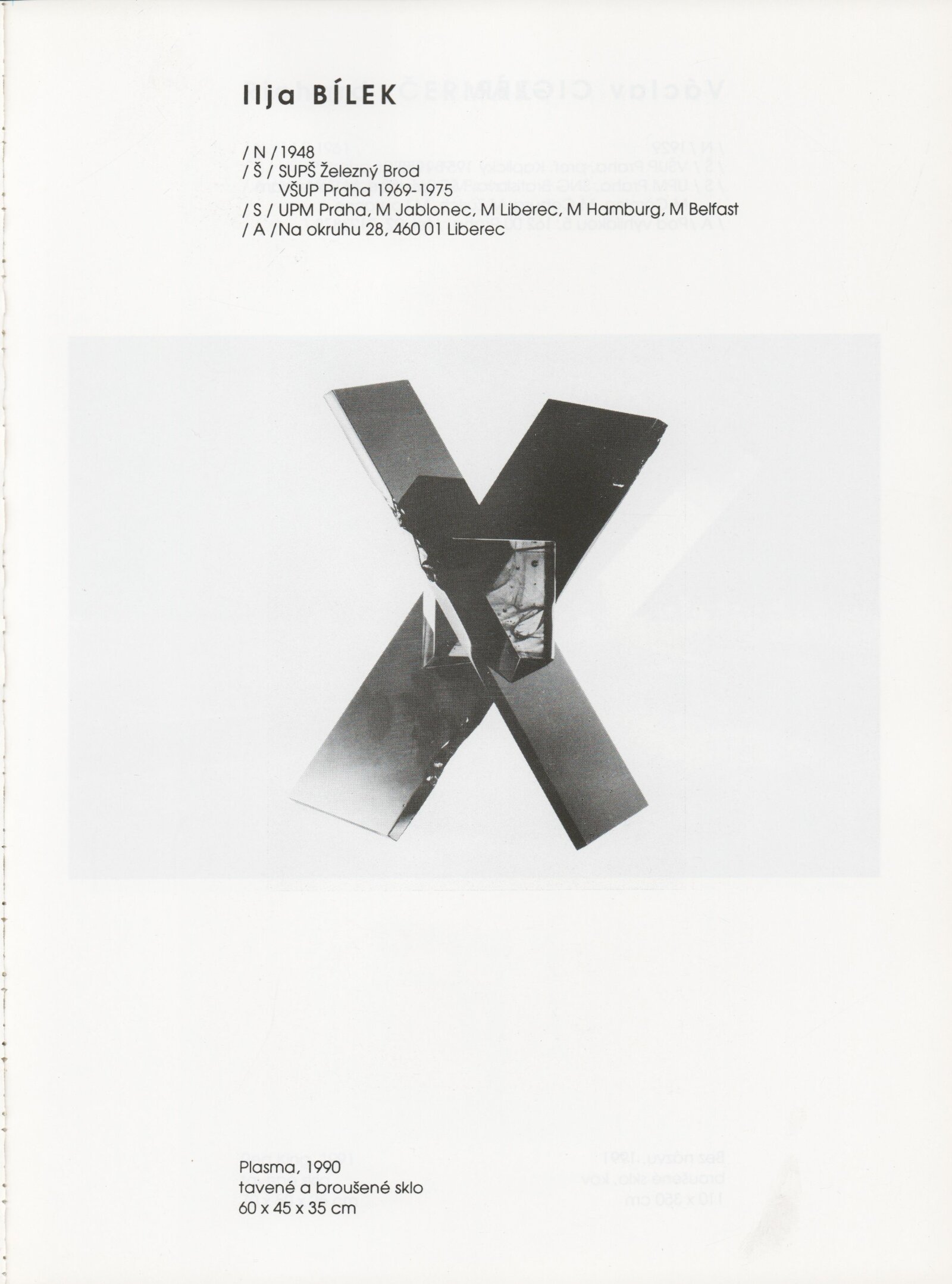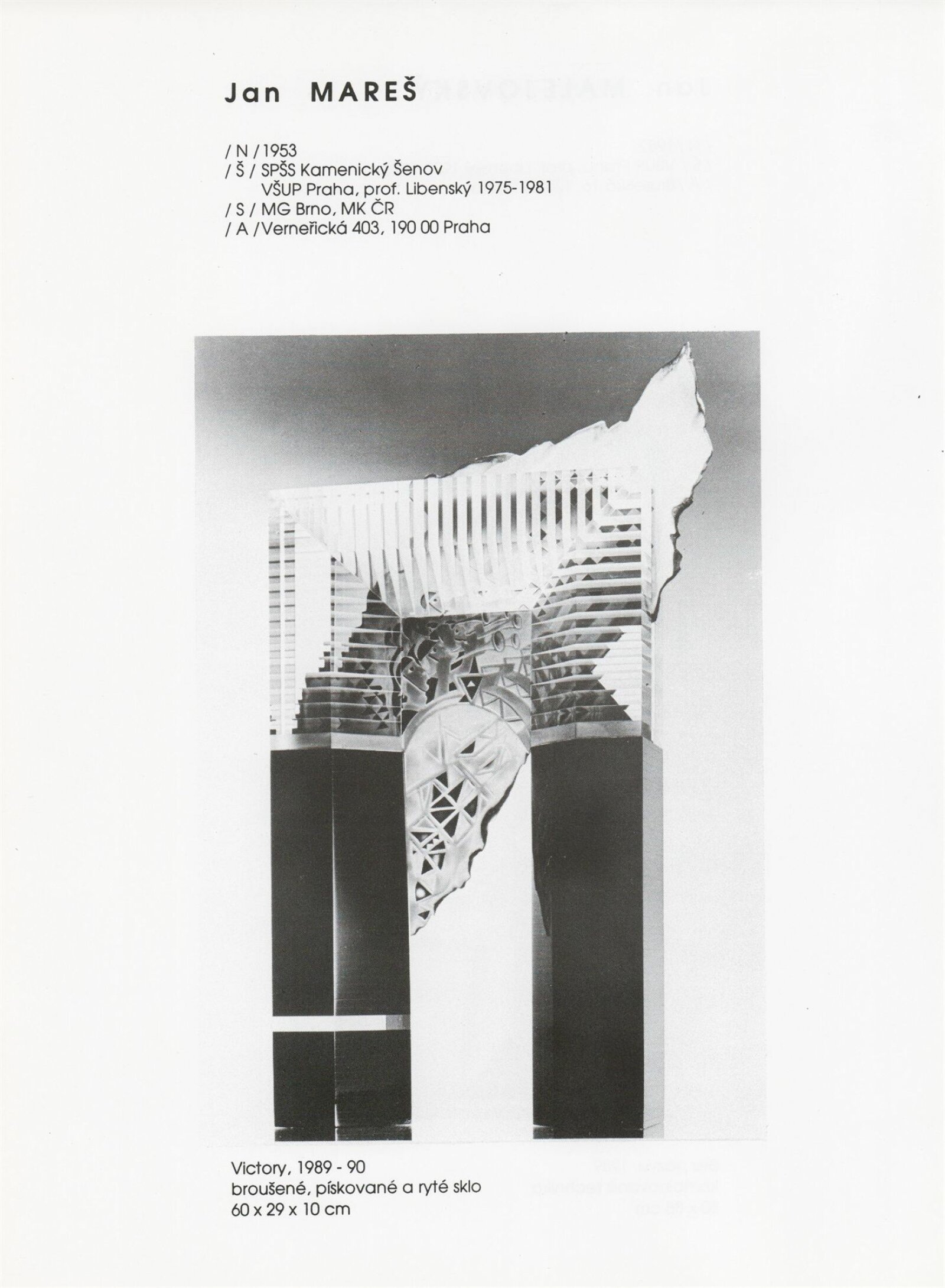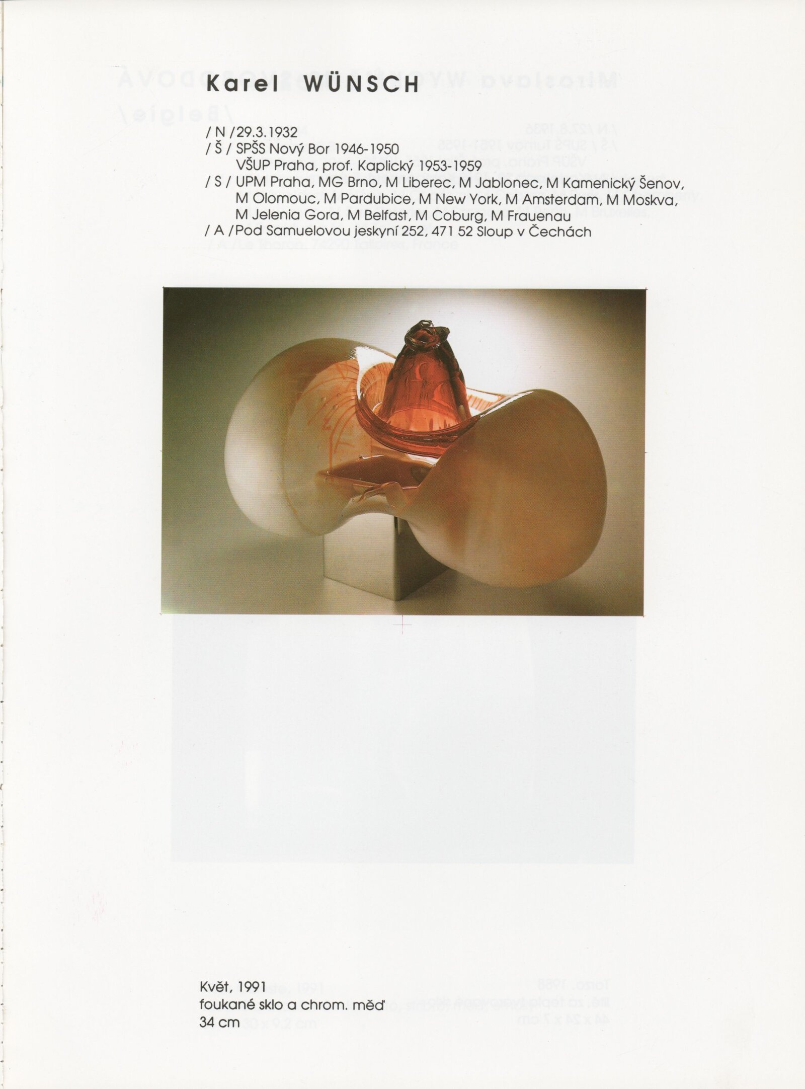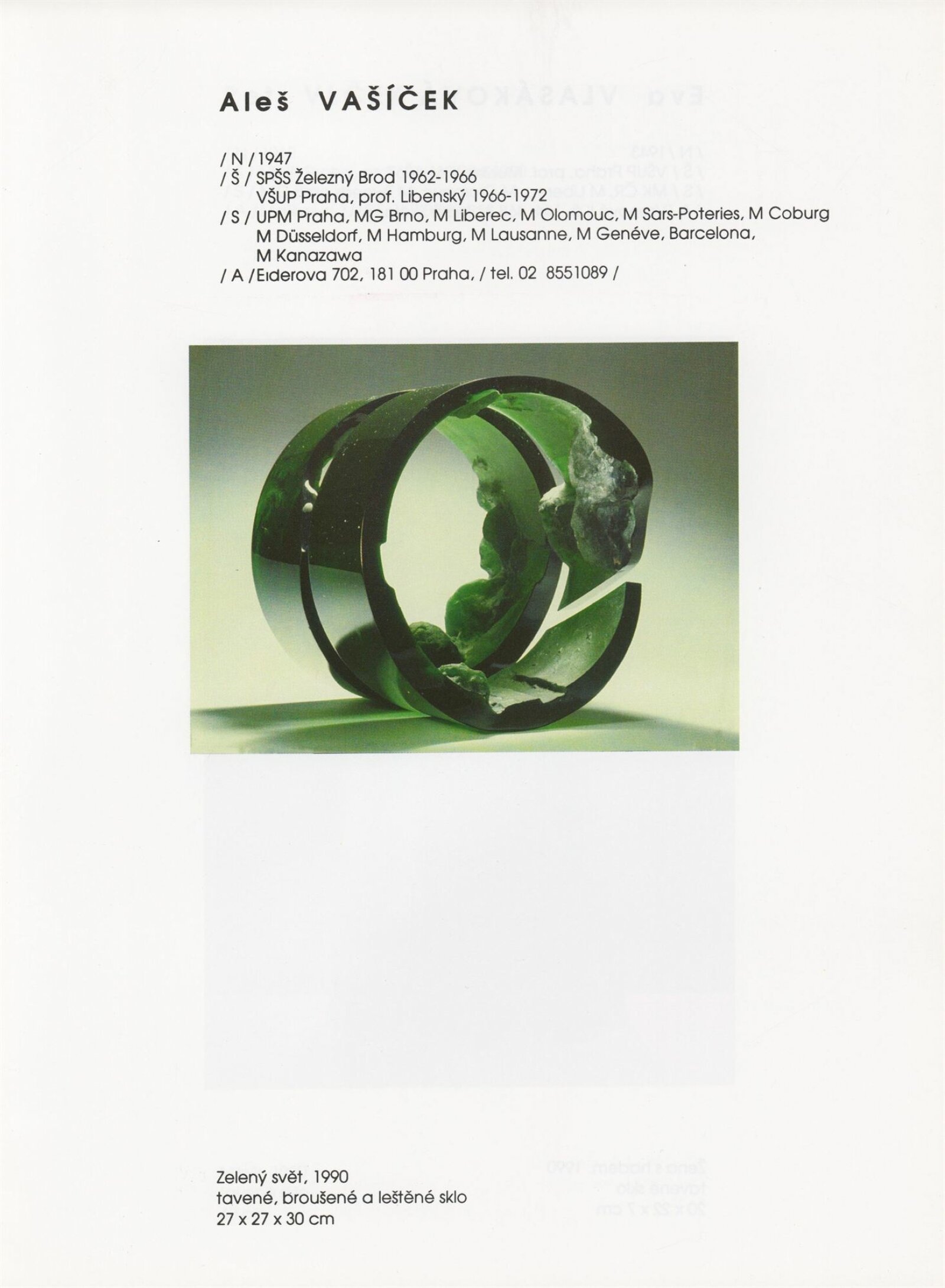 pozvánka, katalog, tisková zpráva, fotografie a negativy děl, záběr z výstavy, seznam děl, pojistný seznam, popisky prací, zápis ze schůzky, provozní a institucionální korespondence, nabídky repríz výstavy v zahraničí, potvrzení o převzetí děl, žádosti, dohody, smlouvy, reverzy, adresy, recenze v tisku, poznámky, katalogy - R. a M. Roubíčkovi., 1992, Eva Heřmanská, P. R. Manoušek, Interglas sympozium Nový Bor 1988, pozvánky k jiným výstavám